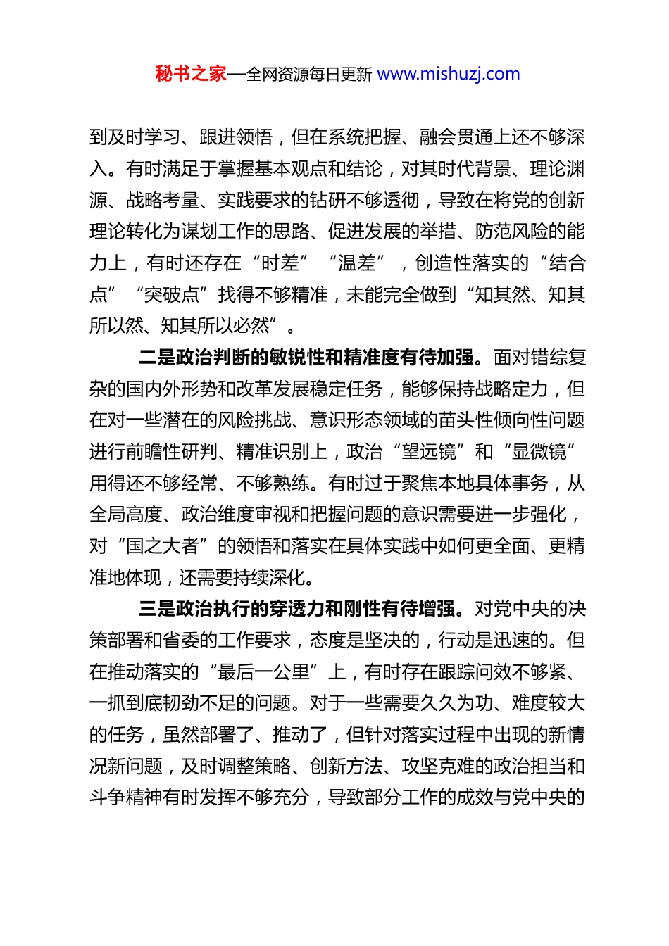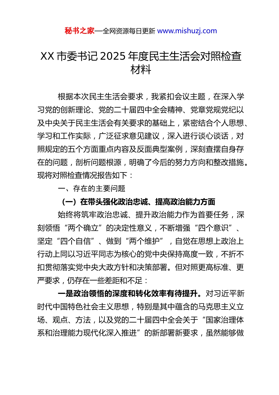 秘书之家—全网资源每日更新 www.mishuzj.comXX 市委书记 2025 年度民主生活会对照检查材料根据本次民主生活会要求,我紧扣会议主题,在深入学习党的创新理论、党的二十届四中全会精神、党章党规党纪以及中央关于民主生活会有关要求的基础上,紧密结合个人思想、学习和工作实际,广泛征求意见建议,深入进行谈心谈话,对照规定的五个方面重点内容及反面典型案例,深刻查摆自身存在的问题,剖析问题根源,明确了今后的努力方向和整改措施。现将对照检查情况报告如下:一、存在的主要问题(一)在带头强化政治忠诚、提高政治能力方面始终将筑牢政治忠诚、提升政治能力作为首要任务,深刻领悟“两个确立”的决定性意义,不断增强“四个意识”、坚定“四个自信”、做到“两个维护”,自觉在思想上政治上行动上同以习近平同志为核心的党中央保持高度一致,不折不扣贯彻落实党中央大政方针和决策部署。但对照更高标准、更严要求,仍存在一些差距和不足:一是政治领悟的深度和转化效率有待提升。对习近平新时代中国特色社会主义思想,特别是其中蕴含的马克思主义立场、观点、方法,以及党的二十届四中全会关于“国家治理体系和治理能力现代化深入推进”的新部署新要求,虽然能够做秘书之家—全网资源每日更新 www.mishuzj.com到及时学习、跟进领悟,但在系统把握、融会贯通上还不够深入。有时满足于掌握基本观点和结论,对其时代背景、理论渊源、战略考量、实践要求的钻研不够透彻,导致在将党的创新理论转化为谋划工作的思路、促进发展的举措、防范风险的能力上,有时还存在“时差”“温差”,创造性落实的“结合点”“突破点”找得不够精准,未能完全做到“知其然、知其所以然、知其所以必然”。二是政治判断的敏锐性和精准度有待加强。面对错综复杂的国内外形势和改革发展稳定任务,能够保持战略定力,但在对一些潜在的风险挑战、意识形态领域的苗头性倾向性问题进行前瞻性研判、精准识别上,政治“望远镜”和“显微镜”用得还不够经常、不够熟练。有时过于聚焦本地具体事务,从全局高度、政治维度审视和把握问题的意识需要进一步强化,对“国之大者”的领悟和落实在具体实践中如何更全面、更精准地体现,还需要持续深化。三是政治执行的穿透力和刚性有待增强。对党中央的决策部署和省委的工作要求,态度是坚决的,行动是迅速的。但在推动落实的“最后一公里”上,有时存在跟踪问效不够紧、一抓到底韧劲不足的问题。对于一些需要久久为功、难度较大的任务,虽然部署了、推动了,但针对落实过程中出现的新情况新问题,及时调整策略、创新方法、攻坚克难的政治担当和斗争精神有时发挥不够充分,导致部分工作的成效与党中央的秘书之家—全网资源每日更新 www.mishuzj.com要求和群众的期盼相比还有提升空间。在严守政治纪律和政治规矩方面,自我要求是严格的,但对分管领域、部门党员干部日常政治言行、政治表现的监督管理,抓细抓常抓长的力度还可以更大。(二)在带头固本培元、增强党性方面始终把加强党性修养作为终身课题,坚持把政治修养摆在首位,自觉用习近平新时代中国特色社会主义思想凝心铸魂,努力改造主观世界,坚定理想信念。但深刻反思,党性锤炼的主动性、自觉性仍需持续增强:一是理论武装的自觉性和系统性有待提高。虽然能够坚持参加集体学习、完成规定书目阅读,但个人自学的主动性、计划性有时受工作影响有所弱化,存在“用到才学、急用才学”的现象。对党的创新理论体系,特别是关于坚定理想信念、提升精神境界、加强道德修养的一系列重要论述,缺乏反复研读、常学常新的韧劲,运用理论解决思想“总开关”问题的深度和效果有待提升。学习党章党规党纪,有时侧重于条目记忆和底线把握,对其蕴含的共产党人价值观、党性原则精髓的领悟和践行,融入日常、化为自觉还有差距。二是理想信念的内化践行有待深化。能够认识到理想信念是共产党人的精神之“钙”,但在纷繁复杂的社会现实和多元思想冲击下,有时不自觉地降低了对自身的精神砥砺标准。对照革命先辈和先进典型,在传承红色基因、弘扬优良传统、秘书之家—全网资源每日更新 www.mishuzj.com保持艰苦奋斗精神方...