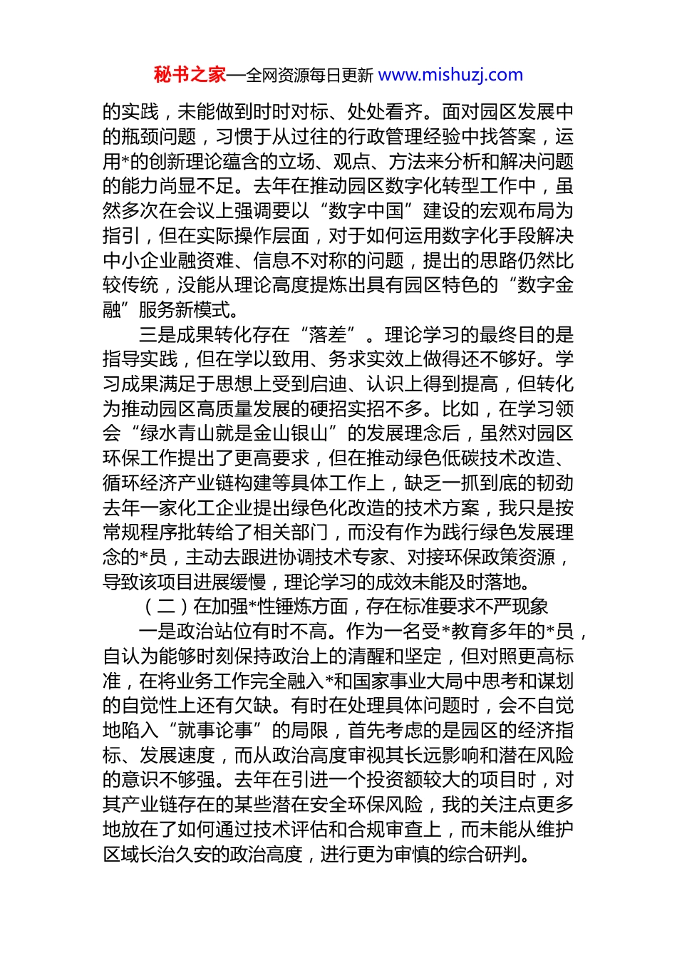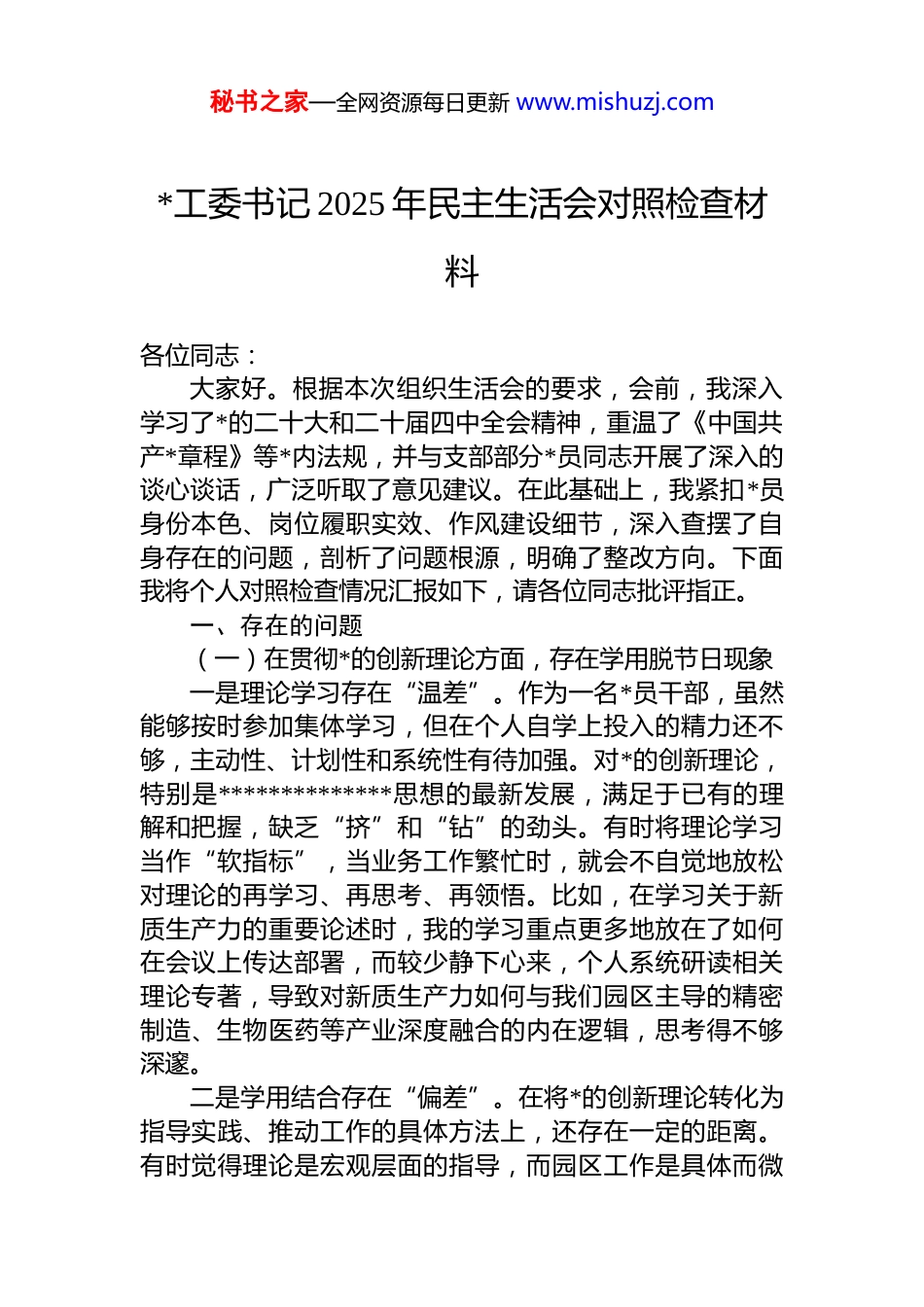 秘书之家—全网资源每日更新 www.mishuzj.com*工委书记 2025 年民主生活会对照检查材料各位同志:大家好。根据本次组织生活会的要求,会前,我深入学习了*的二十大和二十届四中全会精神,重温了《中国共产*章程》等*内法规,并与支部部分*员同志开展了深入的谈心谈话,广泛听取了意见建议。在此基础上,我紧扣*员身份本色、岗位履职实效、作风建设细节,深入查摆了自身存在的问题,剖析了问题根源,明确了整改方向。下面我将个人对照检查情况汇报如下,请各位同志批评指正。一、存在的问题(一)在贯彻*的创新理论方面,存在学用脱节日现象一是理论学习存在“温差”。作为一名*员干部,虽然能够按时参加集体学习,但在个人自学上投入的精力还不够,主动性、计划性和系统性有待加强。对*的创新理论,特别是**************思想的最新发展,满足于已有的理解和把握,缺乏“挤”和“钻”的劲头。有时将理论学习当作“软指标”,当业务工作繁忙时,就会不自觉地放松对理论的再学习、再思考、再领悟。比如,在学习关于新质生产力的重要论述时,我的学习重点更多地放在了如何在会议上传达部署,而较少静下心来,个人系统研读相关理论专著,导致对新质生产力如何与我们园区主导的精密制造、生物医药等产业深度融合的内在逻辑,思考得不够深邃。二是学用结合存在“偏差”。在将*的创新理论转化为指导实践、推动工作的具体方法上,还存在一定的距离。有时觉得理论是宏观层面的指导,而园区工作是具体而微秘书之家—全网资源每日更新 www.mishuzj.com的实践,未能做到时时对标、处处看齐。面对园区发展中的瓶颈问题,习惯于从过往的行政管理经验中找答案,运用*的创新理论蕴含的立场、观点、方法来分析和解决问题的能力尚显不足。去年在推动园区数字化转型工作中,虽然多次在会议上强调要以“数字中国”建设的宏观布局为指引,但在实际操作层面,对于如何运用数字化手段解决中小企业融资难、信息不对称的问题,提出的思路仍然比较传统,没能从理论高度提炼出具有园区特色的“数字金融”服务新模式。三是成果转化存在“落差”。理论学习的最终目的是指导实践,但在学以致用、务求实效上做得还不够好。学习成果满足于思想上受到启迪、认识上得到提高,但转化为推动园区高质量发展的硬招实招不多。比如,在学习领会“绿水青山就是金山银山”的发展理念后,虽然对园区环保工作提出了更高要求,但在推动绿色低碳技术改造、循环经济产业链构建等具体工作上,缺乏一抓到底的韧劲去年一家化工企业提出绿色化改造的技术方案,我只是按常规程序批转给了相关部门,而没有作为践行绿色发展理念的*员,主动去跟进协调技术专家、对接环保政策资源,导致该项目进展缓慢,理论学习的成效未能及时落地。(二)在加强*性锤炼方面,存在标准要求不严现象一是政治站位有时不高。作为一名受*教育多年的*员,自认为能够时刻保持政治上的清醒和坚定,但对照更高标准,在将业务工作完全融入*和国家事业大局中思考和谋划的自觉性上还有欠缺。有时在处理具体问题时,会不自觉地陷入“就事论事”的局限,首先考虑的是园区的经济指标、发展速度,而从政治高度审视其长远影响和潜在风险的意识不够强。去年在引进一个投资额较大的项目时,对其产业链存在的某些潜在安全环保风险,我的关注点更多地放在了如何通过技术评估和合规审查上,而未能从维护区域长治久安的政治高度,进行更为审慎的综合研判。秘书之家—全网资源每日更新 www.mishuzj.com二是斗争精神有所减弱。随着工作环境和岗位的变化,直面矛盾、较真碰硬的锐气相比以前有所消减。在工作中有时会产生“多一事不如少一事”的想法,对于一些历史遗留的“硬骨头”问题,缺乏攻坚克难的决心和勇气。面对一些不合理的诉求或者不当的工作作风,有时碍于情面批评不够直接,斗争不够坚决。例如,园区内有几家企业长期占用公共停车资源,影响了园区整体秩序,虽然群众有所反映,但我考虑到这些是多年的“老住户”,担心处理过激会引发矛盾,因此采取了较为温和的劝导方式,而没有以一名*员应有的坚定立场,下决心运用规则彻底整治,导致问题迟迟未能根治。三是组织生活...