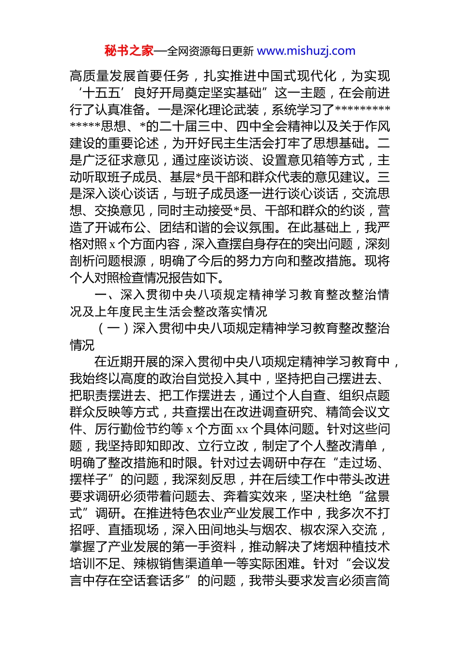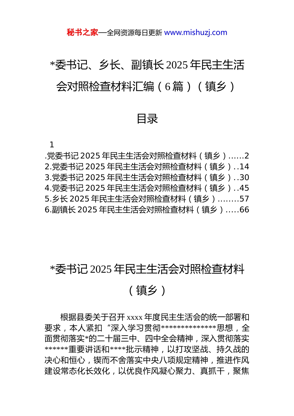 秘书之家—全网资源每日更新 www.mishuzj.com*委书记、乡长、副镇长 2025 年民主生活会对照检查材料汇编(6 篇)(镇乡)目录1.党委书记 2025 年民主生活会对照检查材料(镇乡)......22.党委书记 2025 年民主生活会对照检查材料(镇乡)..143.党委书记 2025 年民主生活会对照检查材料(镇乡)..304.党委书记 2025 年民主生活会对照检查材料(镇乡)..455.乡长 2025 年民主生活会对照检查材料(镇乡)........576.副镇长 2025 年民主生活会对照检查材料(镇乡).....66*委书记 2025 年民主生活会对照检查材料(镇乡)根据县委关于召开 xxxx 年度民主生活会的统一部署和要求,本人紧扣“深入学习贯彻**************思想,全面贯彻落实*的二十届三中、四中全会精神,深入贯彻落实******重要讲话和****批示精神,以打攻坚战、持久战的决心和恒心,锲而不舍落实中央八项规定精神,推进作风建设常态化长效化,以优良作风凝心聚力、真抓干,聚焦秘书之家—全网资源每日更新 www.mishuzj.com高质量发展首要任务,扎实推进中国式现代化,为实现‘十五五’良好开局奠定坚实基础”这一主题,在会前进行了认真准备。一是深化理论武装,系统学习了**************思想、*的二十届三中、四中全会精神以及关于作风建设的重要论述,为开好民主生活会打牢了思想基础。二是广泛征求意见,通过座谈访谈、设置意见箱等方式,主动听取班子成员、基层*员干部和群众代表的意见建议。三是深入谈心谈话,与班子成员逐一进行谈心谈话,交流思想、交换意见,同时主动接受*员、干部和群众的约谈,营造了开诚布公、团结和谐的会议氛围。在此基础上,我严格对照 x 个方面内容,深入查摆自身存在的突出问题,深刻剖析问题根源,明确了今后的努力方向和整改措施。现将个人对照检查情况报告如下。一、深入贯彻中央八项规定精神学习教育整改整治情况及上年度民主生活会整改落实情况(一)深入贯彻中央八项规定精神学习教育整改整治情况在近期开展的深入贯彻中央八项规定精神学习教育中,我始终以高度的政治自觉投入其中,坚持把自己摆进去、把职责摆进去、把工作摆进去,通过个人自查、组织点题群众反映等方式,共查摆出在改进调查研究、精简会议文件、厉行勤俭节约等 x 个方面 xx 个具体问题。针对这些问题,我坚持即知即改、立行立改,制定了个人整改清单,明确了整改措施和时限。针对过去调研中存在“走过场、摆样子”的问题,我深刻反思,并在后续工作中带头改进要求调研必须带着问题去、奔着实效来,坚决杜绝“盆景式”调研。在推进特色农业产业发展工作中,我多次不打招呼、直插现场,深入田间地头与烟农、椒农深入交流,掌握了产业发展的第一手资料,推动解决了烤烟种植技术培训不足、辣椒销售渠道单一等实际困难。针对“会议发言中存在空话套话多”的问题,我带头要求发言必须言简秘书之家—全网资源每日更新 www.mishuzj.com意赅、直面问题,汇报工作要多讲数据、多谈办法,少讲客套话、少穿靴戴帽。截至目前,查摆出的 xx 个问题已全部整改完成,并长期坚持。通过此次学习教育和整改整治我个人在思想认识上得到了再深化,在*性修养上得到了再锤炼,在工作作风上得到了再改进,有效推动了全镇作风建设向纵深发展。(二)xxxx 年度民主生活会整改落实情况在 xxxx 年度民主生活会上,我围绕“带头严守政治纪律和政治规矩、带头增强*性、带头在遵规守纪前提下勇于担责、带头履行全面从严治*政治责任”等 x 个方面,共查摆出个人问题 x 个。会后,我逐一制定了详实的整改措施,建立了整改台账,实行销号管理。一年来,我坚持把整改工作作为一项严肃的政治任务,以钉钉子精神逐项抓好落实。在强化理论武装方面,坚持完成了年度学习计划,理论联系实际的能力得到增强;在创新担当方面,主动作为积极破解了村集体经济发展动力不足的难题,通过 dj 引领和产业培育,有效提升了村集体经济效益;在履行管*治*责任方面,坚持严管厚爱结合,加大了对年轻干部的培养和监督力度。截至目前,上年度查摆的 x 个问题已全部整改到位,整改成果在推动全镇经济社会高质量发展中得到了体...