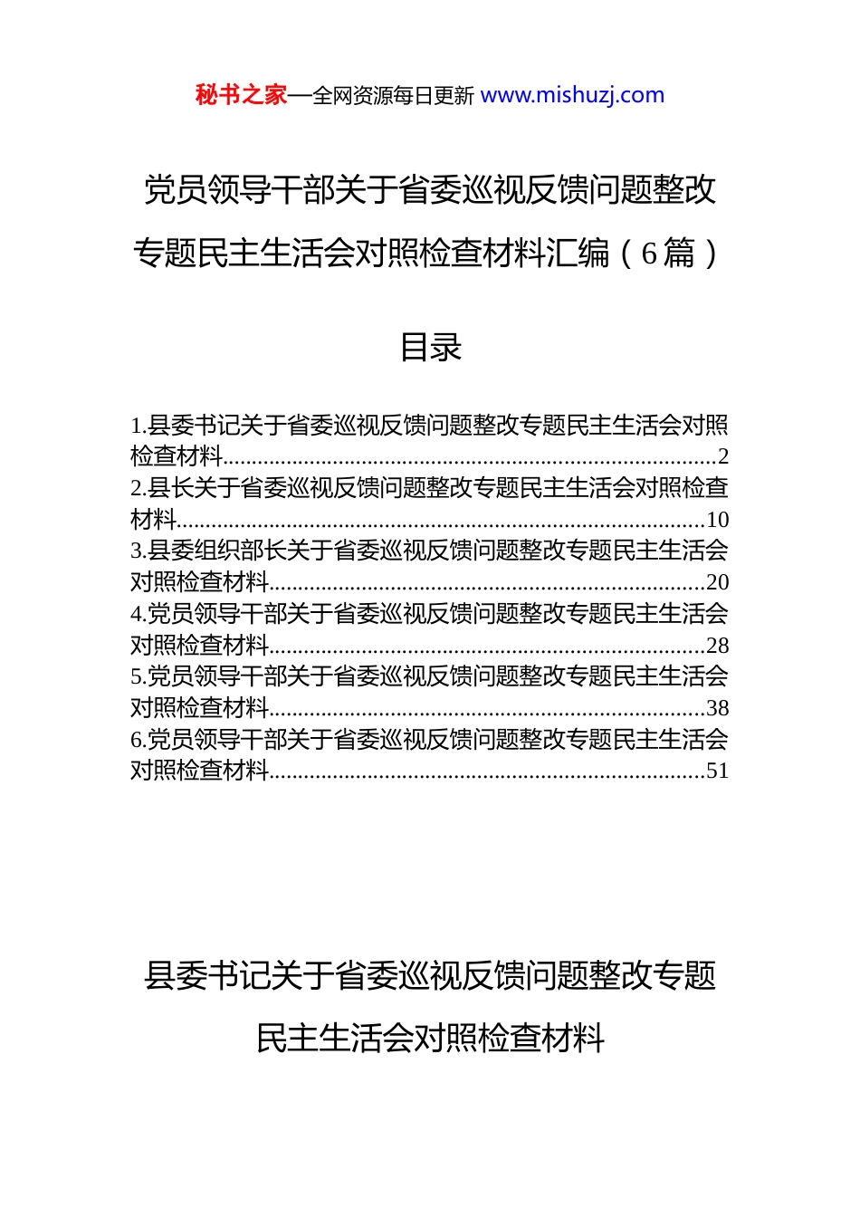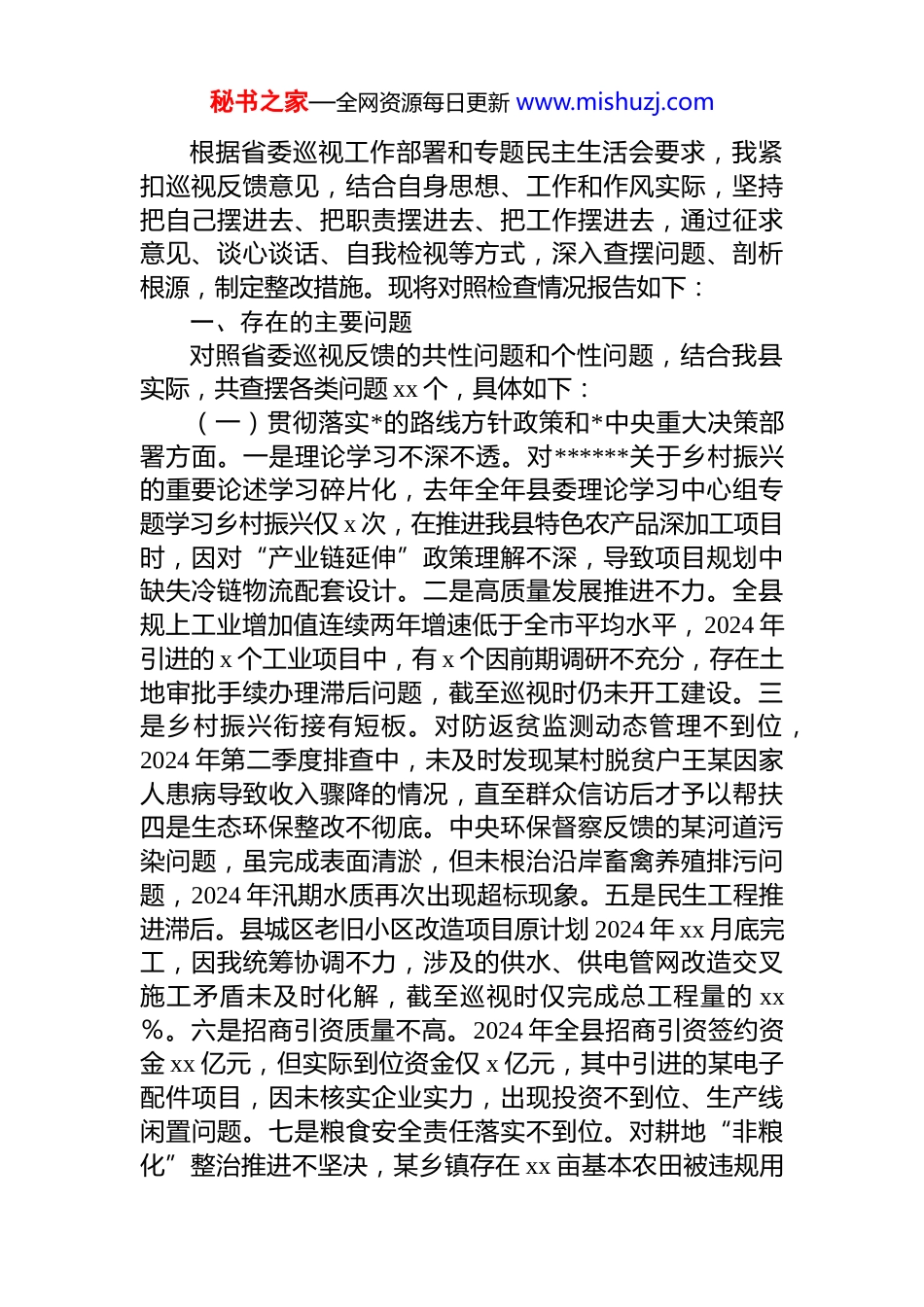 秘书之家—全网资源每日更新 www.mishuzj.com党员领导干部关于省委巡视反馈问题整改专题民主生活会对照检查材料汇编(6 篇)目录1.县委书记关于省委巡视反馈问题整改专题民主生活会对照检查材料.....................................................................................22.县长关于省委巡视反馈问题整改专题民主生活会对照检查材料...........................................................................................103.县委组织部长关于省委巡视反馈问题整改专题民主生活会对照检查材料...........................................................................204.党员领导干部关于省委巡视反馈问题整改专题民主生活会对照检查材料...........................................................................285.党员领导干部关于省委巡视反馈问题整改专题民主生活会对照检查材料...........................................................................386.党员领导干部关于省委巡视反馈问题整改专题民主生活会对照检查材料...........................................................................51县委书记关于省委巡视反馈问题整改专题民主生活会对照检查材料秘书之家—全网资源每日更新 www.mishuzj.com根据省委巡视工作部署和专题民主生活会要求,我紧扣巡视反馈意见,结合自身思想、工作和作风实际,坚持把自己摆进去、把职责摆进去、把工作摆进去,通过征求意见、谈心谈话、自我检视等方式,深入查摆问题、剖析根源,制定整改措施。现将对照检查情况报告如下:一、存在的主要问题对照省委巡视反馈的共性问题和个性问题,结合我县实际,共查摆各类问题 xx 个,具体如下:(一)贯彻落实*的路线方针政策和*中央重大决策部署方面。一是理论学习不深不透。对******关于乡村振兴的重要论述学习碎片化,去年全年县委理论学习中心组专题学习乡村振兴仅 x 次,在推进我县特色农产品深加工项目时,因对“产业链延伸”政策理解不深,导致项目规划中缺失冷链物流配套设计。二是高质量发展推进不力。全县规上工业增加值连续两年增速低于全市平均水平,2024 年引进的 x 个工业项目中,有 x 个因前期调研不充分,存在土地审批手续办理滞后问题,截至巡视时仍未开工建设。三是乡村振兴衔接有短板。对防返贫监测动态管理不到位,2024 年第二季度排查中,未及时发现某村脱贫户王某因家人患病导致收入骤降的情况,直至群众信访后才予以帮扶四是生态环保整改不彻底。中央环保督察反馈的某河道污染问题,虽完成表面清淤,但未根治沿岸畜禽养殖排污问题,2024 年汛期水质再次出现超标现象。五是民生工程推进滞后。县城区老旧小区改造项目原计划 2024 年 xx 月底完工,因我统筹协调不力,涉及的供水、供电管网改造交叉施工矛盾未及时化解,截至巡视时仅完成总工程量的 xx%。六是招商引资质量不高。2024 年全县招商引资签约资金 xx 亿元,但实际到位资金仅 x 亿元,其中引进的某电子配件项目,因未核实企业实力,出现投资不到位、生产线闲置问题。七是粮食安全责任落实不到位。对耕地“非粮化”整治推进不坚决,某乡镇存在 xx 亩基本农田被违规用秘书之家—全网资源每日更新 www.mishuzj.com于苗木种植,我在两次调研中发现问题但未督促彻底整改八是信访积案化解不及时。包保的某企业改制职工安置信访案,因担心引发群体事件而存在“等靠要”思想,拖延至巡视前才制定具体化解方案,历时超过 xx 个月。(二)落实全面从严治*主体责任方面。一是主体责任传导层层递减。对乡镇*委从严治*工作仅每年听取 x 次汇报,2024 年全县有 x 个乡镇出现党员干部酒驾问题,未及时开展专题警示教育。二是对“一把手”监督不力。对县住建局原局长在工程招标中的违规干预行为,前期已收到线索但未及时约谈提醒,直至上级纪委介入才配合调查。三是形式主义问题仍较突出。要求乡镇每月报送的 dj 材料达 xx类之多,某乡镇为应付检查,出现编造党员学习笔记的情况,我在督查时发现但未严肃追责。四是违规吃喝整治不彻底。2024...