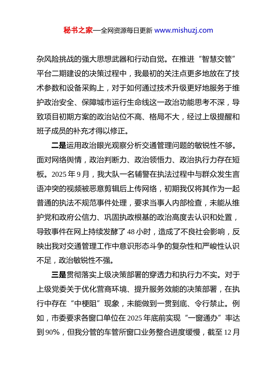 秘书之家—全网资源每日更新 www.mishuzj.com党支部书记 2025 年度民主生活会个人对照检查材料 根据**市纪委、市委组织部关于开好 2025 年度县以上党和国家机关党员领导干部民主生活会的通知要求,我紧扣本次民主生活会主题,在深入开展学习研讨的基础上,广泛征求了班子成员、分管部门、基层民警和群众代表的意见建议,并与班子成员、部分中层干部和民警代表逐一开展了谈心谈话。通过系统梳理、深刻反思,我进一步找准了自身在政治、思想、作风、能力、廉洁等方面存在的差距和不足。现将个人对照检查情况报告如下。一、存在的主要问题对照本次民主生活会明确的 5 个方面重点内容,我坚持把自己摆进去、把职责摆进去、把工作摆进去,深入查摆了自身存在的突出问题。(一)在带头强化政治忠诚、提高政治能力方面,政治站位的高度和深度有差距一是将“两个确立”融入血脉、铸入灵魂的自觉性不强。在思想深处,对“两个确-立”决定性意义的理解,有时停留于理论和概念层面,未能完全转化为指导交通管理实践、应对复秘书之家—全网资源每日更新 www.mishuzj.com杂风险挑战的强大思想武器和行动自觉。在推进“智慧交管”平台二期建设的决策过程中,我最初的关注点更多地放在了技术参数和设备采购上,对于如何通过技术升级更好地服务于维护政治安全、保障城市运行生命线这一政治功能思考不深,导致项目初期方案的政治站位不高、格局不大,经过上级提醒和班子成员的补充才得以修正。二是运用政治眼光观察分析交通管理问题的敏锐性不够。面对网络舆情,政治判断力、政治领悟力、政治执行力存在短板。2025 年 9 月,我大队一名辅警在执法过程中与群众发生言语冲突的视频被恶意剪辑后上传网络,初期我仅将其作为一起普通的执法不规范事件处理,要求当事人内部检查,未能从维护党和政府公信力、巩固执政根基的政治高度去认识和处置,导致事件在网上持续发酵了 48 小时,造成了不良社会影响,反映出我对交通管理工作中意识形态斗争的复杂性和严峻性认识不足,政治敏锐性不强。三是贯彻落实上级决策部署的穿透力和执行力不实。对于上级党委关于优化营商环境、提升服务效能的决策部署,在执行中存在“中梗阻”现象,未能做到一贯到底、令行禁止。例如,市委要求各窗口单位在 2025 年底前实现“一窗通办”率达到 90%,但我分管的车管所窗口业务整合进度缓慢,截至 12 月秘书之家—全网资源每日更新 www.mishuzj.com底,“通办”率仅为 78%,多项业务仍需群众在不同窗口间流转,平均办理时长超出全市平均水平 12 分钟,实质上是以“程序复杂”为由打了折扣、搞了变通,影响了党委决策的落地效果。(二)在带头固本培元、增强党性修养方面,理论武装的力度和广度有差距一是运用习近平新时代中国特色社会主义思想凝心铸魂不深。理论学习存在实用主义倾向,对业务工作直接相关的内容学得多、钻得深,而对其中蕴含的世界观、人生观、价值观“总开关”问题思考不透。在组织学习党的二十届四中全会精神时,我满足于通读会议公报和决议,对全会提出的新思想新论断,未能静下心来逐字逐句领悟其精髓要义,更未能紧密结合大队当前面临的队伍建设思想困惑、执法公信力瓶颈等问题进行深入思考,导致学习成果向思想自觉和党性修养的转化不佳。二是锤炼坚强党性、恪守党规党纪的自我要求不严。在日常工作中,有时不自觉地将自己等同于普通行政干部,党员的先锋模范意识有所淡化。对于党章中规定的党员义务,虽然能够做到基本遵守,但在“吃苦在前、享受在后”等更高标准的党性要求上做得不好。去年夏季连续高温期间,我更多的是通秘书之家—全网资源每日更新 www.mishuzj.com过电话调度、会议部署的方式要求一线民警战高温、保畅通,自己深入酷暑下的一线执勤点检查慰问仅有 3 次,时间累计不足 5 小时,与一线同志们同甘共苦、并肩战斗的先锋作用发挥不充分。三是砥砺理想信念、永葆精神追求的坚定性不足。在长期和平环境和繁重业务工作的双重影响下,有时会产生“船到码头车到站”的松劲思想,革命意志和奋斗精神有所消减。面对我市老城区“停车难”这一历史顽疾,尽管近年来采取...