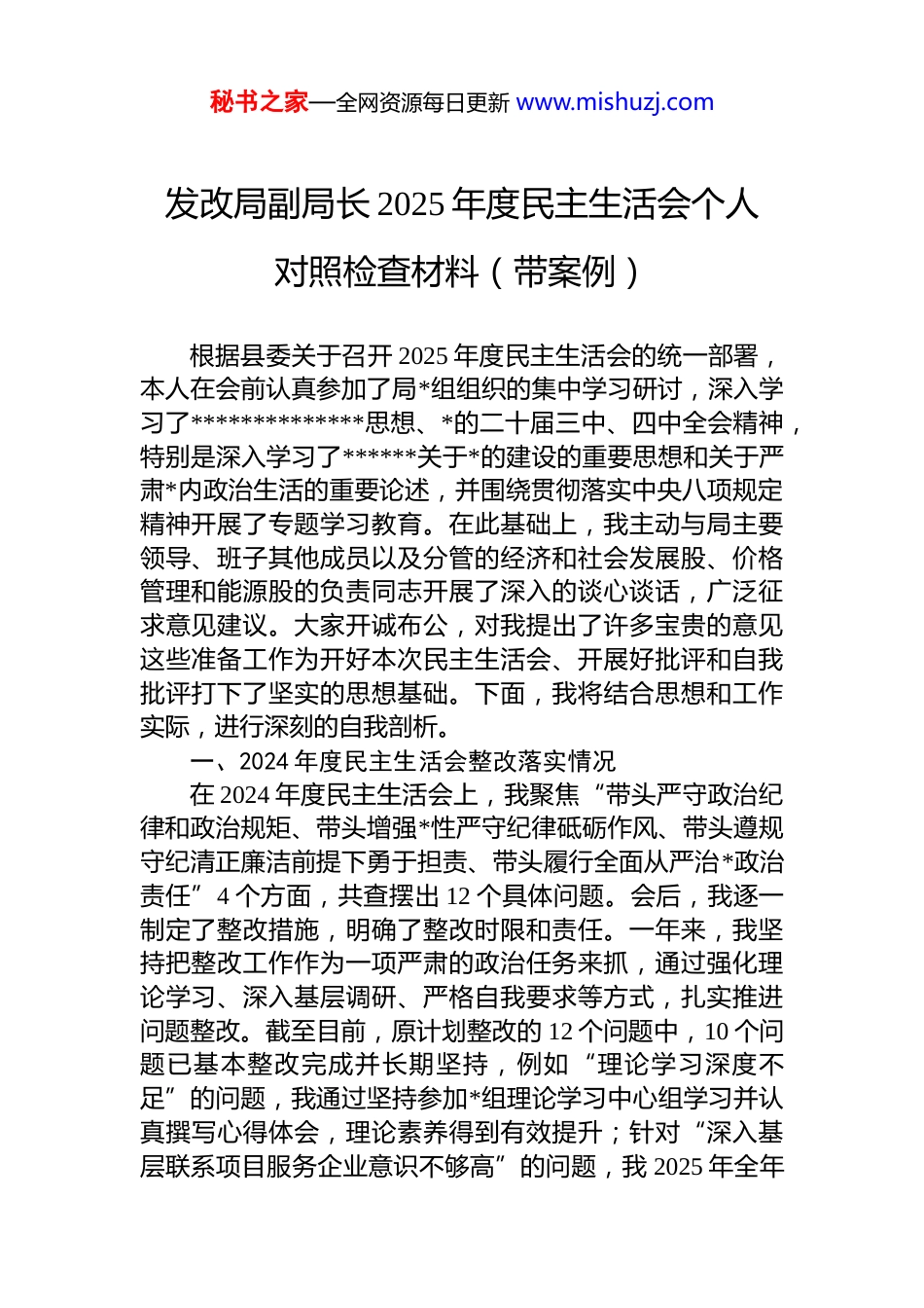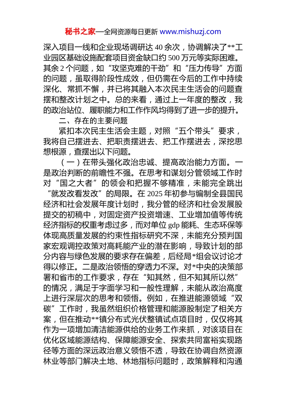 秘书之家—全网资源每日更新 www.mishuzj.com发改局副局长 2025 年度民主生活会个人对照检查材料(带案例)根据县委关于召开 2025 年度民主生活会的统一部署,本人在会前认真参加了局*组组织的集中学习研讨,深入学习了**************思想、*的二十届三中、四中全会精神,特别是深入学习了******关于*的建设的重要思想和关于严肃*内政治生活的重要论述,并围绕贯彻落实中央八项规定精神开展了专题学习教育。在此基础上,我主动与局主要领导、班子其他成员以及分管的经济和社会发展股、价格管理和能源股的负责同志开展了深入的谈心谈话,广泛征求意见建议。大家开诚布公,对我提出了许多宝贵的意见这些准备工作为开好本次民主生活会、开展好批评和自我批评打下了坚实的思想基础。下面,我将结合思想和工作实际,进行深刻的自我剖析。一、2024 年度民主生活会整改落实情况在 2024 年度民主生活会上,我聚焦“带头严守政治纪律和政治规矩、带头增强*性严守纪律砥砺作风、带头遵规守纪清正廉洁前提下勇于担责、带头履行全面从严治*政治责任”4 个方面,共查摆出 12 个具体问题。会后,我逐一制定了整改措施,明确了整改时限和责任。一年来,我坚持把整改工作作为一项严肃的政治任务来抓,通过强化理论学习、深入基层调研、严格自我要求等方式,扎实推进问题整改。截至目前,原计划整改的 12 个问题中,10 个问题已基本整改完成并长期坚持,例如“理论学习深度不足”的问题,我通过坚持参加*组理论学习中心组学习并认真撰写心得体会,理论素养得到有效提升;针对“深入基层联系项目服务企业意识不够高”的问题,我 2025 年全年秘书之家—全网资源每日更新 www.mishuzj.com深入项目一线和企业现场调研达 40 余次,协调解决了**工业园区基础设施配套项目资金缺口约 500 万元等实际困难。其余 2 个问题,如“攻坚克难的干劲”和“压力传导”方面的问题,虽取得阶段性成效,但仍需在今后的工作中持续深化、常抓不懈,并已将其融入本次民主生活会的问题查摆和整改计划之中。总的来看,通过上一年度的整改,我的政治站位、履职能力和工作作风均得到了进一步的提升。二、存在的主要问题紧扣本次民主生活会主题,对照“五个带头”要求,我将自己摆进去、把职责摆进去、把工作摆进去,深挖思想根源,查摆出以下问题。(一)在带头强化政治忠诚、提高政治能力方面。一是政治判断的前瞻性不强。在思考和谋划分管领域工作时对“国之大者”的领会和把握不够精准,未能完全跳出“就发改看发改”的局限。在 2025 年初参与编制全县国民经济和社会发展年度计划时,我分管的经济和社会发展股提交的初稿中,对固定资产投资增速、工业增加值等传统经济指标的权重考虑过多,而对单位 gdp 能耗、生态环保等体现高质量发展的约束性指标研究不深,未能充分预判国家宏观调控政策对高耗能产业的潜在影响,导致计划的部分内容与绿色发展的要求存在偏差,后经局*组会议讨论才得以修正。二是政治领悟的穿透力不深。对*中央的决策部署和省市的工作要求,存在“知其然,但不知其所以然”的情况,满足于字面学习和一般性理解,未能从政治高度上进行深层次的思考和领悟。例如,在推进能源领域“双碳”工作时,我虽然组织价格管理和能源股制定了相关方案,但在推动**镇分布式光伏整镇试点项目时,仅仅将其作为一项增加清洁能源供给的业务工作来抓,对该项目在优化区域能源结构、保障能源安全、探索共同富裕实现路径等方面的深远政治意义领悟不透,导致在协调自然资源林业等部门解决土地、林地指标问题时,政策解释和沟通秘书之家—全网资源每日更新 www.mishuzj.com协调的力度不够,影响了项目进度。三是政治执行的彻底性不够。在贯彻落实上级决策部署时,有时存在结合实际不够、行动迟缓的问题,未能做到令行禁止、不折不扣。2025 年三季度,市里发文要求强化对重要民生商品的价格监测和调控,特别是针对可能出现的季节性价格波动要做到提前预警、提前介入。但我对此项工作的紧迫性认识不足,仅要求价格管理和能源股按常规开展市场巡查和价格监测,未能立即组织力量对全县主要商超、农贸市场...