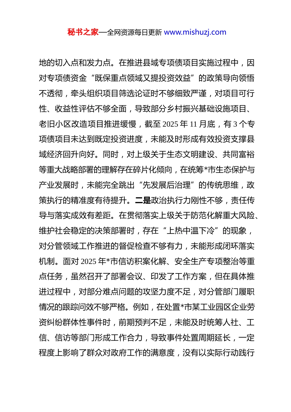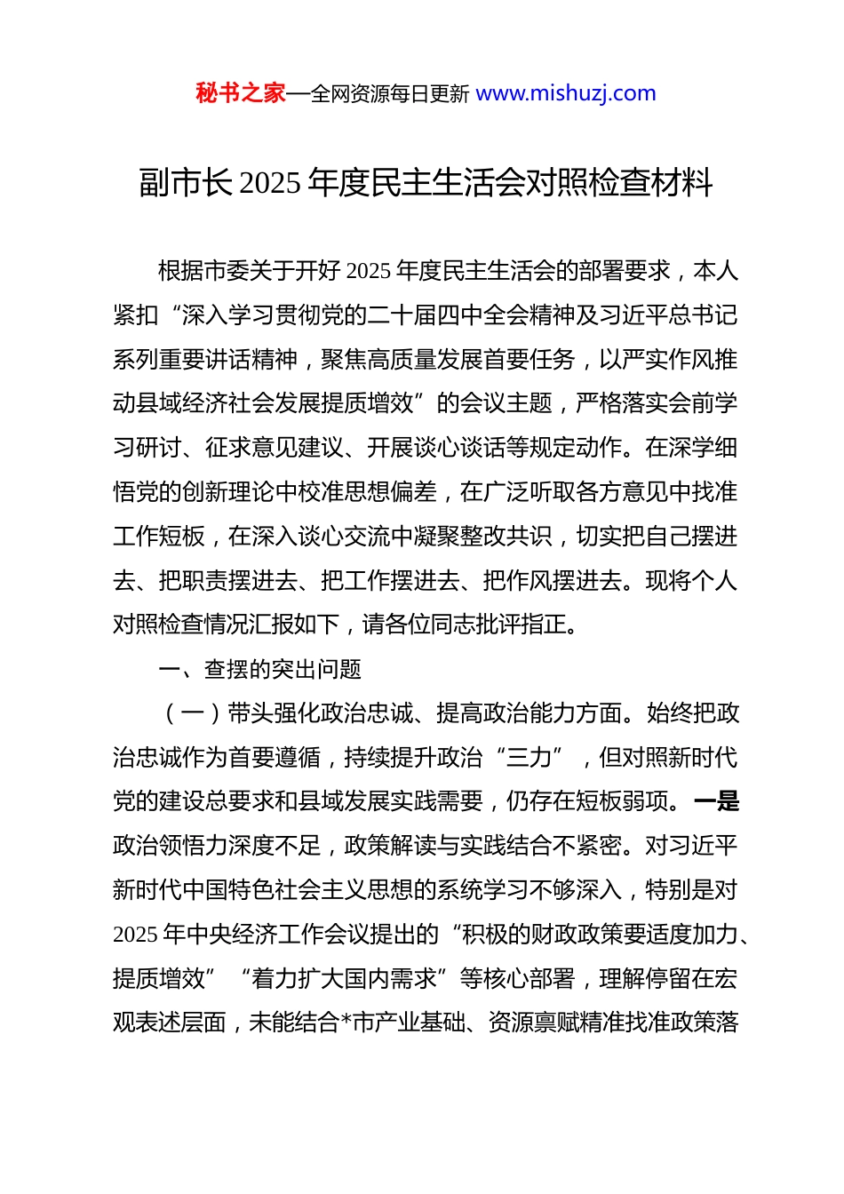 秘书之家—全网资源每日更新 www.mishuzj.com副市长 2025 年度民主生活会对照检查材料 根据市委关于开好 2025 年度民主生活会的部署要求,本人紧扣“深入学习贯彻党的二十届四中全会精神及习近平总书记系列重要讲话精神,聚焦高质量发展首要任务,以严实作风推动县域经济社会发展提质增效”的会议主题,严格落实会前学习研讨、征求意见建议、开展谈心谈话等规定动作。在深学细悟党的创新理论中校准思想偏差,在广泛听取各方意见中找准工作短板,在深入谈心交流中凝聚整改共识,切实把自己摆进去、把职责摆进去、把工作摆进去、把作风摆进去。现将个人对照检查情况汇报如下,请各位同志批评指正。一、查摆的突出问题(一)带头强化政治忠诚、提高政治能力方面。始终把政治忠诚作为首要遵循,持续提升政治“三力”,但对照新时代党的建设总要求和县域发展实践需要,仍存在短板弱项。一是政治领悟力深度不足,政策解读与实践结合不紧密。对习近平新时代中国特色社会主义思想的系统学习不够深入,特别是对2025 年中央经济工作会议提出的“积极的财政政策要适度加力、提质增效”“着力扩大国内需求”等核心部署,理解停留在宏观表述层面,未能结合*市产业基础、资源禀赋精准找准政策落秘书之家—全网资源每日更新 www.mishuzj.com地的切入点和发力点。在推进县域专项债项目实施过程中,因对专项债资金“既保重点领域又提投资效益”的政策导向领悟不透彻,牵头组织项目筛选论证时不够细致严谨,对项目可行性、收益性评估不够全面,导致部分乡村振兴基础设施项目、老旧小区改造项目推进缓慢,截至 2025 年 11 月底,有 3 个专项债项目未达到既定投资进度,未能及时形成有效投资支撑县域经济回升向好。同时,对上级关于生态文明建设、共同富裕等重大战略部署的理解存在碎片化倾向,在统筹*市生态保护与产业发展时,未能完全跳出“先发展后治理”的传统思维,政策执行的精准度有待提升。二是政治执行力刚性不够,责任传导与落实成效有差距。在贯彻落实上级关于防范化解重大风险、维护社会稳定的决策部署时,存在“上热中温下冷”的现象,对分管领域工作推进的督促检查不够有力,未能形成闭环落实机制。面对 2025 年*市信访积案化解、安全生产专项整治等重点任务,虽然召开了部署会议、印发了工作方案,但在具体推进过程中,对部分难点问题的攻坚力度不足,对分管部门履职情况的跟踪问效不够严格。例如,在处置*市某工业园区企业劳资纠纷群体性事件时,前期预判不足,未能及时统筹人社、工信、信访等部门形成工作合力,导致事件处置周期延长,一定程度上影响了群众对政府工作的满意度,没有以实际行动践行秘书之家—全网资源每日更新 www.mishuzj.com“两个维护”的政治要求。此外,在推进跨部门协作工作中,存在“等靠要”思想,主动协调、主动担当不够,部分上级部署的联动任务未能按时限要求完成。三是政治判断力精准性不足,风险防控与底线思维有欠缺。对新形势下意识形态领域风险点的研判不够全面,对市场复苏背景下行业内可能出现的错误言论、不良导向警惕性不高,对分管领域宣传思想阵地的管控不够严密。在统筹 2025 年*市“乡村文化旅游节”等大型活动举办过程中,过于注重活动成效展示,对活动现场的意识形态导向把关不够严格,未能提前预判并防范个别自媒体不实宣传、恶意炒作等潜在风险。同时,在防范化解经济领域风险方面,对县域中小企业经营困难、债务化解等问题的研究不够深入,对部分企业存在的安全生产隐患、环保达标压力等风险排查不够细致,未能及时提出系统性的防范化解措施,反映出政治判断力与分管工作需要还存在差距。(二)带头固本培元、增强党性方面。始终坚持以党性立身、以党性履职,但在常态化党性锤炼、党内政治生活质量提升等方面,仍存在一些薄弱环节。一是党内政治生活参与不够严实,批评与自我批评缺乏刀刃向内的勇气。对党内政治生活的重要性认识不够深刻,参与双重组织生活时存在应付心态,有时因工作繁忙缺席所在支部的学习研讨活动,即使参加也存秘书之家—全网资源每日更新 www.mishuzj.com在发言不深入、不具体的问题。在 2025...
