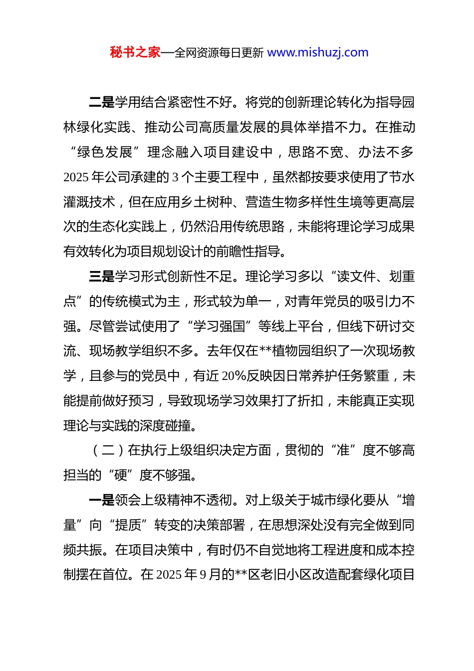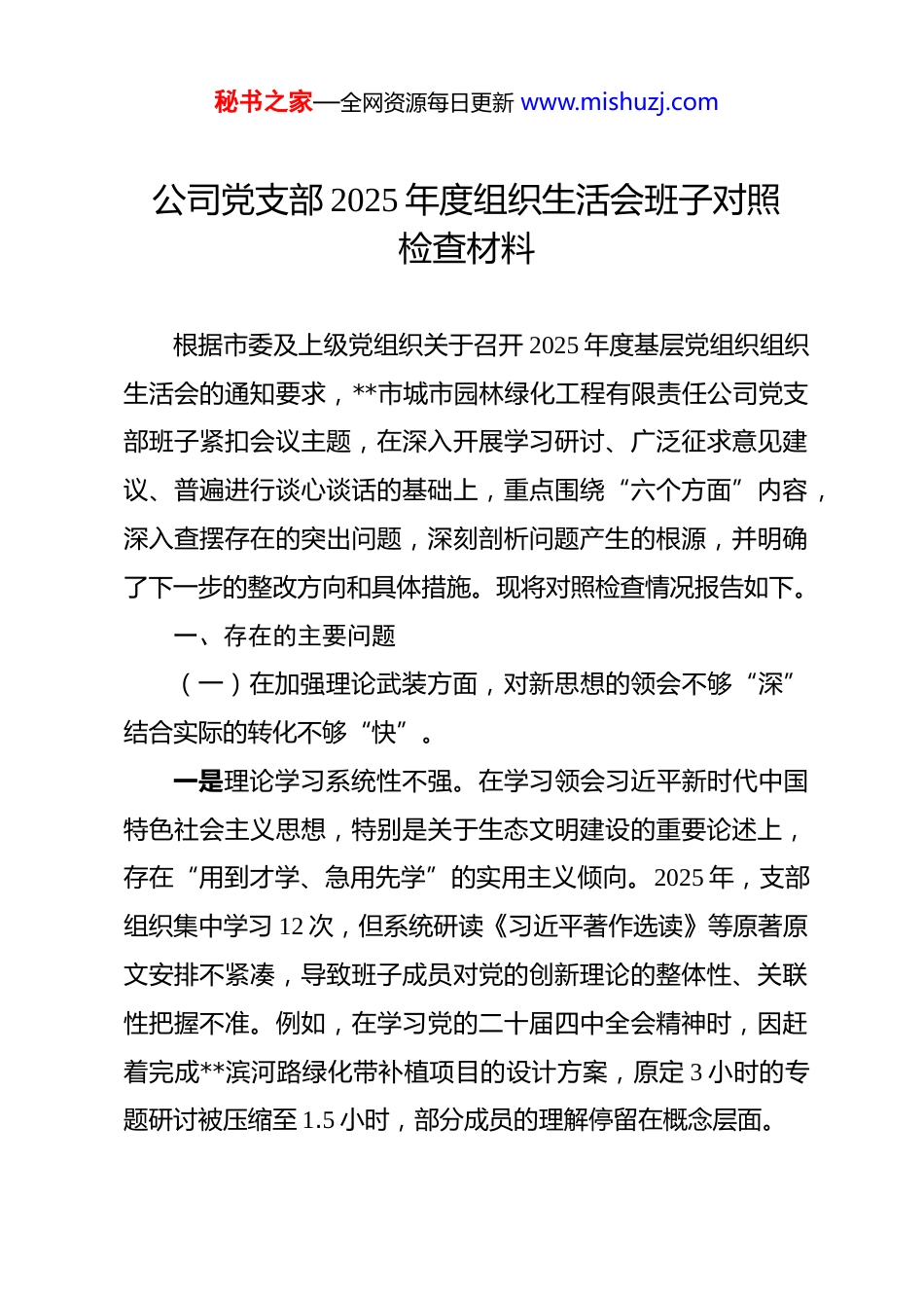 秘书之家—全网资源每日更新 www.mishuzj.com公司党支部 2025 年度组织生活会班子对照检查材料 根据市委及上级党组织关于召开 2025 年度基层党组织组织生活会的通知要求,**市城市园林绿化工程有限责任公司党支部班子紧扣会议主题,在深入开展学习研讨、广泛征求意见建议、普遍进行谈心谈话的基础上,重点围绕“六个方面”内容,深入查摆存在的突出问题,深刻剖析问题产生的根源,并明确了下一步的整改方向和具体措施。现将对照检查情况报告如下。一、存在的主要问题(一)在加强理论武装方面,对新思想的领会不够“深”结合实际的转化不够“快”。一是理论学习系统性不强。在学习领会习近平新时代中国特色社会主义思想,特别是关于生态文明建设的重要论述上,存在“用到才学、急用先学”的实用主义倾向。2025 年,支部组织集中学习 12 次,但系统研读《习近平著作选读》等原著原文安排不紧凑,导致班子成员对党的创新理论的整体性、关联性把握不准。例如,在学习党的二十届四中全会精神时,因赶着完成**滨河路绿化带补植项目的设计方案,原定 3 小时的专题研讨被压缩至 1.5 小时,部分成员的理解停留在概念层面。秘书之家—全网资源每日更新 www.mishuzj.com二是学用结合紧密性不好。将党的创新理论转化为指导园林绿化实践、推动公司高质量发展的具体举措不力。在推动“绿色发展”理念融入项目建设中,思路不宽、办法不多2025 年公司承建的 3 个主要工程中,虽然都按要求使用了节水灌溉技术,但在应用乡土树种、营造生物多样性生境等更高层次的生态化实践上,仍然沿用传统思路,未能将理论学习成果有效转化为项目规划设计的前瞻性指导。三是学习形式创新性不足。理论学习多以“读文件、划重点”的传统模式为主,形式较为单一,对青年党员的吸引力不强。尽管尝试使用了“学习强国”等线上平台,但线下研讨交流、现场教学组织不多。去年仅在**植物园组织了一次现场教学,且参与的党员中,有近 20%反映因日常养护任务繁重,未能提前做好预习,导致现场学习效果打了折扣,未能真正实现理论与实践的深度碰撞。(二)在执行上级组织决定方面,贯彻的“准”度不够高担当的“硬”度不够强。一是领会上级精神不透彻。对上级关于城市绿化要从“增量”向“提质”转变的决策部署,在思想深处没有完全做到同频共振。在项目决策中,有时仍不自觉地将工程进度和成本控制摆在首位。在 2025 年 9 月的**区老旧小区改造配套绿化项目秘书之家—全网资源每日更新 www.mishuzj.com中,面对上级提出的“口袋公园”建设要“一园一品、体现文化内涵”的要求,班子在初期方案中仍倾向于选择成本低、见效快的常规苗木快速覆盖,对文化元素的融入考虑不深,方案经上级提醒后才进行二次修改。二是执行工作纪律不坚决。在重大事项请示报告上存在不及时、不规范的问题。例如,公司工程部在**大道绿化养护中,发现一种新型病虫害可能影响超过 5 万平方米的绿地,部门负责人**同志自行决定采用一种未经充分验证的新农药进行防治,直到出现部分苗木不良反应后,才向支部班子和上级主管部门报告,违反了重大事项先请示后处置的规定,造成了不良影响。三是主动担当作为不充分。面对项目推进中的难点、堵点问题,存在等靠思想,攻坚克难的锐气不强。2025 年,在推进**西路沿线高压线下树木修剪工作中,因涉及与电力部门的协调难题,班子一度认为“难度太大、条件不成熟”,工作拖延了近两个月。最终在群众通过 12345 热线多次反映后,才下定决心集中力量予以解决,反映出在服务大局、主动破题方面的积极性创造性发挥不够。(三)在严格组织生活方面,执行制度的“严”度不够,开展批评的“辣”味不足。一是“三会一课”质量不高。存在以业务会议代替党支部秘书之家—全网资源每日更新 www.mishuzj.com会议的现象,党内政治生活的政治性、原则性体现不充分2025 年第四季度的支部党员大会,原定议程是讨论预备党员转正和民主评议党员,但会议用近一半时间讨论了来年春季的苗木采购计划,导致核心议程时间紧张,党员评议环节未能充分展开,批评与自我批评变成了“希望与建议”,冲淡了组织...