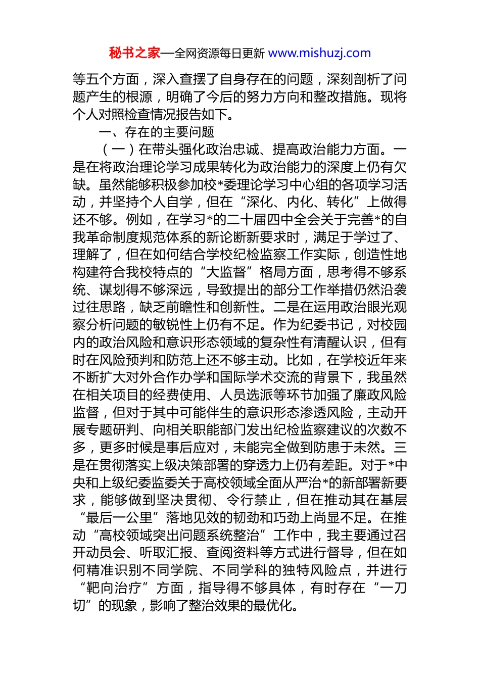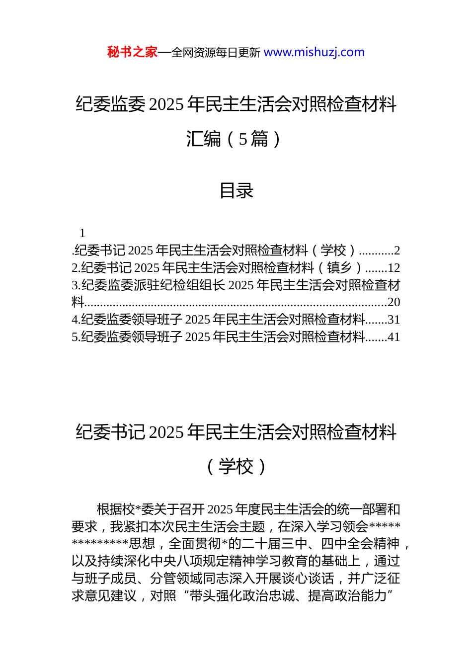 秘书之家—全网资源每日更新 www.mishuzj.com纪委监委 2025 年民主生活会对照检查材料汇编(5 篇)目录1.纪委书记 2025 年民主生活会对照检查材料(学校)...........22.纪委书记 2025 年民主生活会对照检查材料(镇乡).......123.纪委监委派驻纪检组组长 2025 年民主生活会对照检查材料...............................................................................................204.纪委监委领导班子 2025 年民主生活会对照检查材料.......315.纪委监委领导班子 2025 年民主生活会对照检查材料.......41纪委书记 2025 年民主生活会对照检查材料(学校)根据校*委关于召开 2025 年度民主生活会的统一部署和要求,我紧扣本次民主生活会主题,在深入学习领会**************思想,全面贯彻*的二十届三中、四中全会精神,以及持续深化中央八项规定精神学习教育的基础上,通过与班子成员、分管领域同志深入开展谈心谈话,并广泛征求意见建议,对照“带头强化政治忠诚、提高政治能力”秘书之家—全网资源每日更新 www.mishuzj.com等五个方面,深入查摆了自身存在的问题,深刻剖析了问题产生的根源,明确了今后的努力方向和整改措施。现将个人对照检查情况报告如下。一、存在的主要问题(一)在带头强化政治忠诚、提高政治能力方面。一是在将政治理论学习成果转化为政治能力的深度上仍有欠缺。虽然能够积极参加校*委理论学习中心组的各项学习活动,并坚持个人自学,但在“深化、内化、转化”上做得还不够。例如,在学习*的二十届四中全会关于完善*的自我革命制度规范体系的新论断新要求时,满足于学过了、理解了,但在如何结合学校纪检监察工作实际,创造性地构建符合我校特点的“大监督”格局方面,思考得不够系统、谋划得不够深远,导致提出的部分工作举措仍然沿袭过往思路,缺乏前瞻性和创新性。二是在运用政治眼光观察分析问题的敏锐性上仍有不足。作为纪委书记,对校园内的政治风险和意识形态领域的复杂性有清醒认识,但有时在风险预判和防范上还不够主动。比如,在学校近年来不断扩大对外合作办学和国际学术交流的背景下,我虽然在相关项目的经费使用、人员选派等环节加强了廉政风险监督,但对于其中可能伴生的意识形态渗透风险,主动开展专题研判、向相关职能部门发出纪检监察建议的次数不多,更多时候是事后应对,未能完全做到防患于未然。三是在贯彻落实上级决策部署的穿透力上仍有差距。对于*中央和上级纪委监委关于高校领域全面从严治*的新部署新要求,能够做到坚决贯彻、令行禁止,但在推动其在基层“最后一公里”落地见效的韧劲和巧劲上尚显不足。在推动“高校领域突出问题系统整治”工作中,我主要通过召开动员会、听取汇报、查阅资料等方式进行督导,但在如何精准识别不同学院、不同学科的独特风险点,并进行“靶向治疗”方面,指导得不够具体,有时存在“一刀切”的现象,影响了整治效果的最优化。秘书之家—全网资源每日更新 www.mishuzj.com(二)在带头固本培元、增强*性方面。一是在*性锤炼的“熔炉”中淬炼革命精神有所懈怠。长期在纪检监察岗位工作,面对形形色色的违纪违法案件,对*风廉政建设和反腐败斗争的长期性、复杂性、艰巨性有深刻认识。但有时也因工作繁忙、事务繁杂,不自觉地将这份神圣职责当作一项按部就班的日常工作来完成,内心深处那种“永远在路上”的革命热情和斗争精神有所减退,尤其是在处理一些程序性、事务性的信访举报件时,有时会产生“例行公事”的念头,缺少了对每一次监督执纪都如履薄冰、如临深渊的敬畏之心。二是在自我修养的严格自律上存在标准不高的情况。能够时刻绷紧廉洁自律这根弦,但在运用*性原则改造主观世界上还不够彻底。比如,虽然经常组织*员干部观看警示教育片、旁听职务犯罪案件庭审但在内心深处,有时会不自觉地以“旁观者”心态看案例,用“局外人”视角评判他人,把自己摆进去、把职责摆进去进行深刻反思和灵魂拷问的自觉性不强,未能真正做到每次警示教育都是一次深刻的*性洗礼和自我净化。三是在坚守共产*人精神追求的知行合一上存在差距。能够认真学习*章*规 dj,对理想信念的重要...