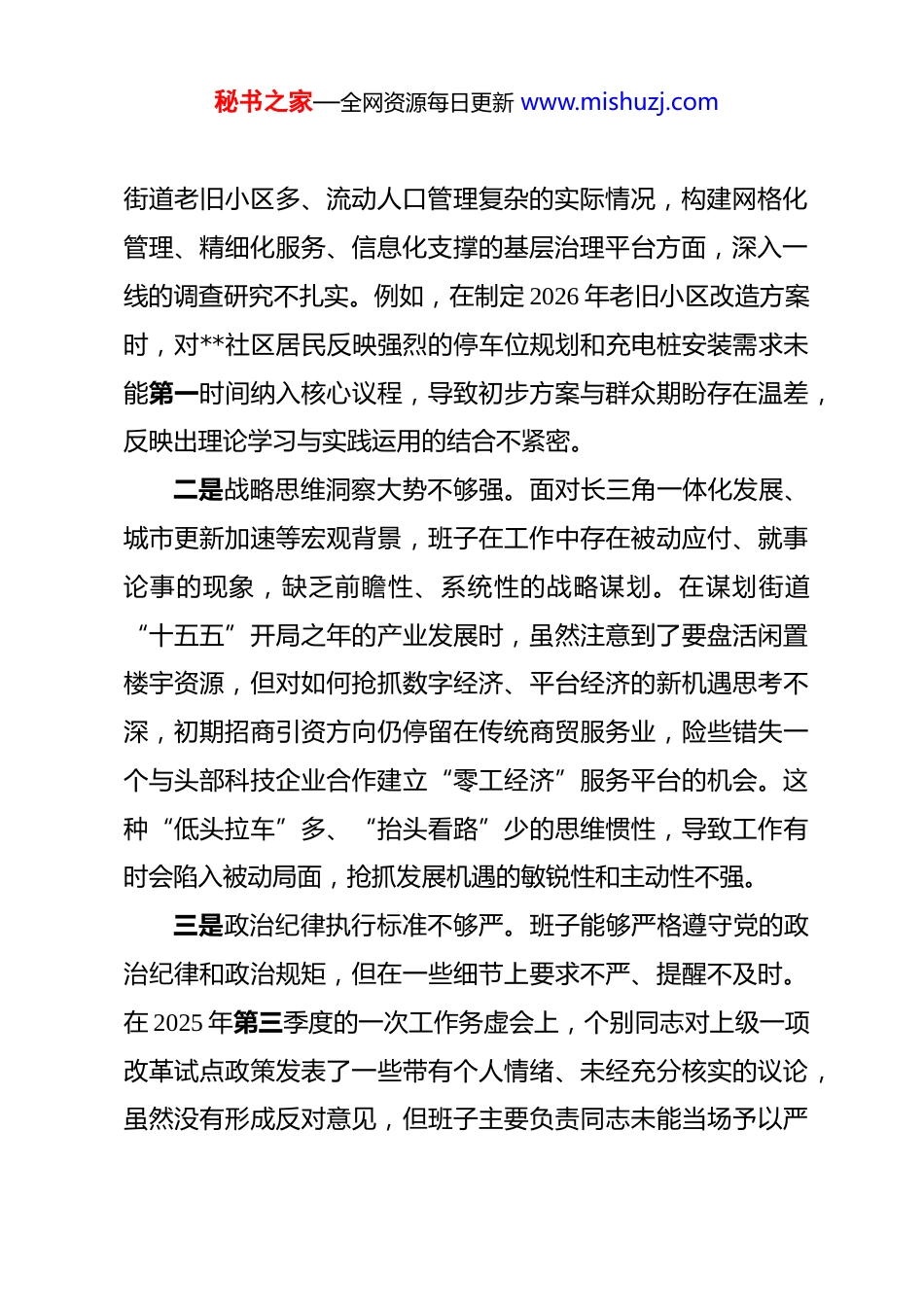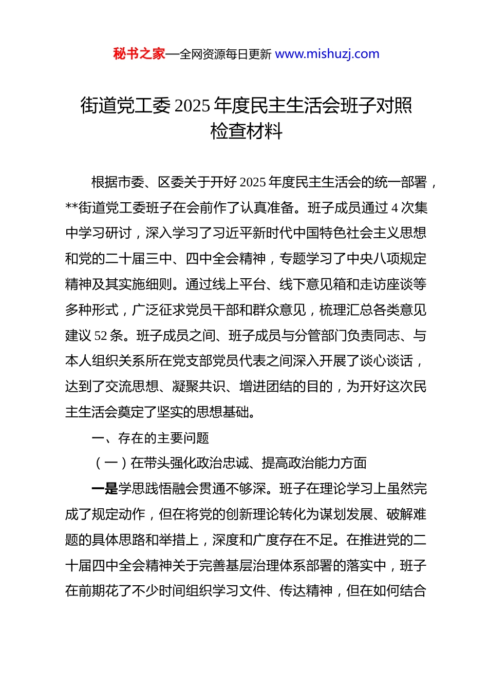 秘书之家—全网资源每日更新 www.mishuzj.com街道党工委 2025 年度民主生活会班子对照检查材料 根据市委、区委关于开好 2025 年度民主生活会的统一部署,**街道党工委班子在会前作了认真准备。班子成员通过 4 次集中学习研讨,深入学习了习近平新时代中国特色社会主义思想和党的二十届三中、四中全会精神,专题学习了中央八项规定精神及其实施细则。通过线上平台、线下意见箱和走访座谈等多种形式,广泛征求党员干部和群众意见,梳理汇总各类意见建议 52 条。班子成员之间、班子成员与分管部门负责同志、与本人组织关系所在党支部党员代表之间深入开展了谈心谈话,达到了交流思想、凝聚共识、增进团结的目的,为开好这次民主生活会奠定了坚实的思想基础。一、存在的主要问题(一)在带头强化政治忠诚、提高政治能力方面一是学思践悟融会贯通不够深。班子在理论学习上虽然完成了规定动作,但在将党的创新理论转化为谋划发展、破解难题的具体思路和举措上,深度和广度存在不足。在推进党的二十届四中全会精神关于完善基层治理体系部署的落实中,班子在前期花了不少时间组织学习文件、传达精神,但在如何结合秘书之家—全网资源每日更新 www.mishuzj.com街道老旧小区多、流动人口管理复杂的实际情况,构建网格化管理、精细化服务、信息化支撑的基层治理平台方面,深入一线的调查研究不扎实。例如,在制定 2026 年老旧小区改造方案时,对**社区居民反映强烈的停车位规划和充电桩安装需求未能第一时间纳入核心议程,导致初步方案与群众期盼存在温差,反映出理论学习与实践运用的结合不紧密。二是战略思维洞察大势不够强。面对长三角一体化发展、城市更新加速等宏观背景,班子在工作中存在被动应付、就事论事的现象,缺乏前瞻性、系统性的战略谋划。在谋划街道“十五五”开局之年的产业发展时,虽然注意到了要盘活闲置楼宇资源,但对如何抢抓数字经济、平台经济的新机遇思考不深,初期招商引资方向仍停留在传统商贸服务业,险些错失一个与头部科技企业合作建立“零工经济”服务平台的机会。这种“低头拉车”多、“抬头看路”少的思维惯性,导致工作有时会陷入被动局面,抢抓发展机遇的敏锐性和主动性不强。三是政治纪律执行标准不够严。班子能够严格遵守党的政治纪律和政治规矩,但在一些细节上要求不严、提醒不及时。在 2025 年第三季度的一次工作务虚会上,个别同志对上级一项改革试点政策发表了一些带有个人情绪、未经充分核实的议论,虽然没有形成反对意见,但班子主要负责同志未能当场予以严秘书之家—全网资源每日更新 www.mishuzj.com肃指正,而是会后私下提醒。这种“和风细雨”式的处理方式,虽然维护了同志间的和气,但在一定程度上削弱了政治纪律的刚性约束力,对一些苗头性、倾向性问题抓得不够紧、不够硬。(二)在带头固本培元、增强党性方面一是理想信念的“压舱石”作用不牢固。在面对复杂矛盾和艰巨任务时,班子成员的革命意志和奋斗精神偶有消减。街道在 2025 年启动了 100 项为民办实事项目,即“双 100”工程,但在推进过程中遇到资金紧张、部分居民不配合等多重困难时,班子内部一度出现了“缓一缓、等一等”的消极声音,少数同志产生了“多做多错、少做少错”的畏难情绪。这说明在严峻考验面前,将理想信念转化为攻坚克难强大动力的思想自觉和行动自觉还不牢固,精神之“钙”仍需持续补充。二是党性锤炼的“大熔炉”温度不高。批评和自我批评的武器运用得不充分、不经常,辣味不足、人情味有余。在 2025年上半年的组织生活会上,班子成员之间的相互批评多以工作建议代替思想交锋,满足于“指出了问题、提出了希望”,缺少“红脸出汗、排毒治病”的尖锐和深刻。比如,对分管城管工作的同志,批评意见只是“市容管理要再精细一些”,而没有点明其在整治**路占道经营问题上决心不大、措施不硬的实质,导致问题未能得到根治。秘书之家—全网资源每日更新 www.mishuzj.com三是思想防线的“防火墙”构建不严密。对社会上的一些错误思潮和不良风气,班子成员虽能保持警惕,但进行坚决斗争和深入剖析的自觉性不强。个别班子成员在非工作场合,对网...