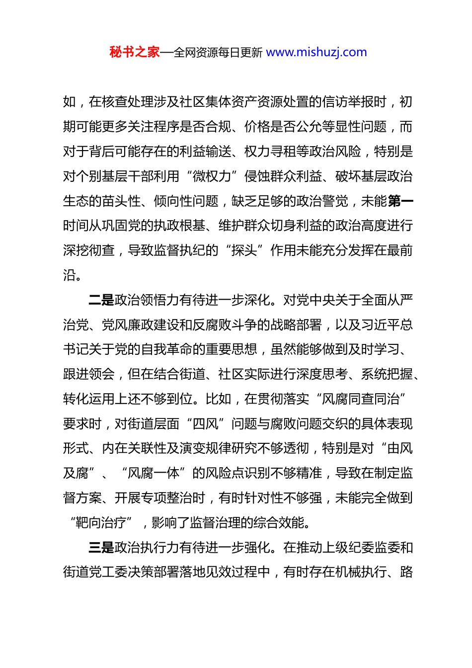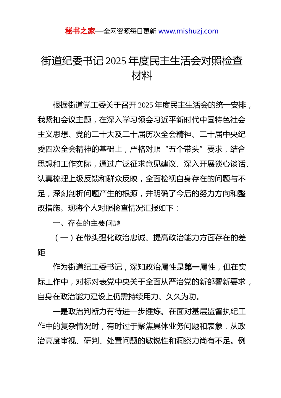 秘书之家—全网资源每日更新 www.mishuzj.com街道纪委书记 2025 年度民主生活会对照检查材料 根据街道党工委关于召开 2025 年度民主生活会的统一安排,我紧扣会议主题,在深入学习领会习近平新时代中国特色社会主义思想、党的二十大及二十届历次全会精神、二十届中央纪委四次全会精神的基础上,严格对照“五个带头”要求,结合思想和工作实际,通过广泛征求意见建议、深入开展谈心谈话、认真梳理上级反馈和群众反映,全面检视自身存在的问题与不足,深刻剖析问题产生的根源,并明确了今后的努力方向和整改措施。现将个人对照检查情况汇报如下:一、存在的主要问题(一)在带头强化政治忠诚、提高政治能力方面存在的差距作为街道纪工委书记,深知政治属性是第一属性,但在实际工作中,对标对表党中央关于全面从严治党的新部署新要求,自身在政治能力建设上仍需持续用力、久久为功。一是政治判断力有待进一步锤炼。在面对基层监督执纪工作中的复杂情况时,有时过于聚焦具体业务问题和表象,从政治高度审视、研判、处置问题的敏锐性和洞察力尚有不足。例秘书之家—全网资源每日更新 www.mishuzj.com如,在核查处理涉及社区集体资产资源处置的信访举报时,初期可能更多关注程序是否合规、价格是否公允等显性问题,而对于背后可能存在的利益输送、权力寻租等政治风险,特别是对个别基层干部利用“微权力”侵蚀群众利益、破坏基层政治生态的苗头性、倾向性问题,缺乏足够的政治警觉,未能第一时间从巩固党的执政根基、维护群众切身利益的政治高度进行深挖彻查,导致监督执纪的“探头”作用未能充分发挥在最前沿。二是政治领悟力有待进一步深化。对党中央关于全面从严治党、党风廉政建设和反腐败斗争的战略部署,以及习近平总书记关于党的自我革命的重要思想,虽然能够做到及时学习、跟进领会,但在结合街道、社区实际进行深度思考、系统把握、转化运用上还不够到位。比如,在贯彻落实“风腐同查同治”要求时,对街道层面“四风”问题与腐败问题交织的具体表现形式、内在关联性及演变规律研究不够透彻,特别是对“由风及腐”、“风腐一体”的风险点识别不够精准,导致在制定监督方案、开展专项整治时,有时针对性不够强,未能完全做到“靶向治疗”,影响了监督治理的综合效能。三是政治执行力有待进一步强化。在推动上级纪委监委和街道党工委决策部署落地见效过程中,有时存在机械执行、路秘书之家—全网资源每日更新 www.mishuzj.com径依赖的问题,创造性开展工作的意识和能力有待提升。例如,在开展安全生产领域监督执纪问责工作时,初期可能习惯于沿用过去的监督检查模式,侧重于检查台账、听取汇报,而对于如何运用“嵌入式”监督、大数据监督等方式,精准发现安全生产责任不落实、隐患排查整治流于形式等深层次问题,思考谋划不够深入,监督的穿透力、震慑力未能完全体现,存在一定的“中梗阻”现象。(二)在带头强化理论武装、筑牢思想根基方面存在的差距深知理论上的成熟是政治上坚定的基础,但在将学习成果转化为推动工作的实际能力上,还存在学用脱节、转化不足的问题。一是理论学习的系统性和深入性有欠缺。虽然能够坚持参加集体学习并开展个人自学,但对党的创新理论,特别是关于全面从严治党、纪检监察工作高质量发展的重要论述,缺乏“钻进去”的韧劲和“悟透彻”的功夫。学习有时满足于“读过了”“学过了”,对其中蕴含的立场、观点、方法掌握不够系统全面,未能完全做到融会贯通。例如,学习《中国共产党纪律处分条例》等党内法规时,有时侧重于条款记忆,对其修订的背景、精神实质和实践要求的理解不够深刻,导致在实际秘书之家—全网资源每日更新 www.mishuzj.com运用中可能出现把握尺度不够精准的情况。二是学以致用、指导实践的效果不够理想。将学习成果转化为谋划工作的思路、破解难题的办法、推动发展的能力尚有不足。比如,面对街道“熟人社会”监督难、社区纪检委员(监察信息员)作用发挥不充分等长期存在的难点问题,虽然学习了相关理论和先进地区经验,但在如何结合本街道实际,创新监督机制、整合监督力量、提升基层监督质效方面,缺乏突破性的思路...