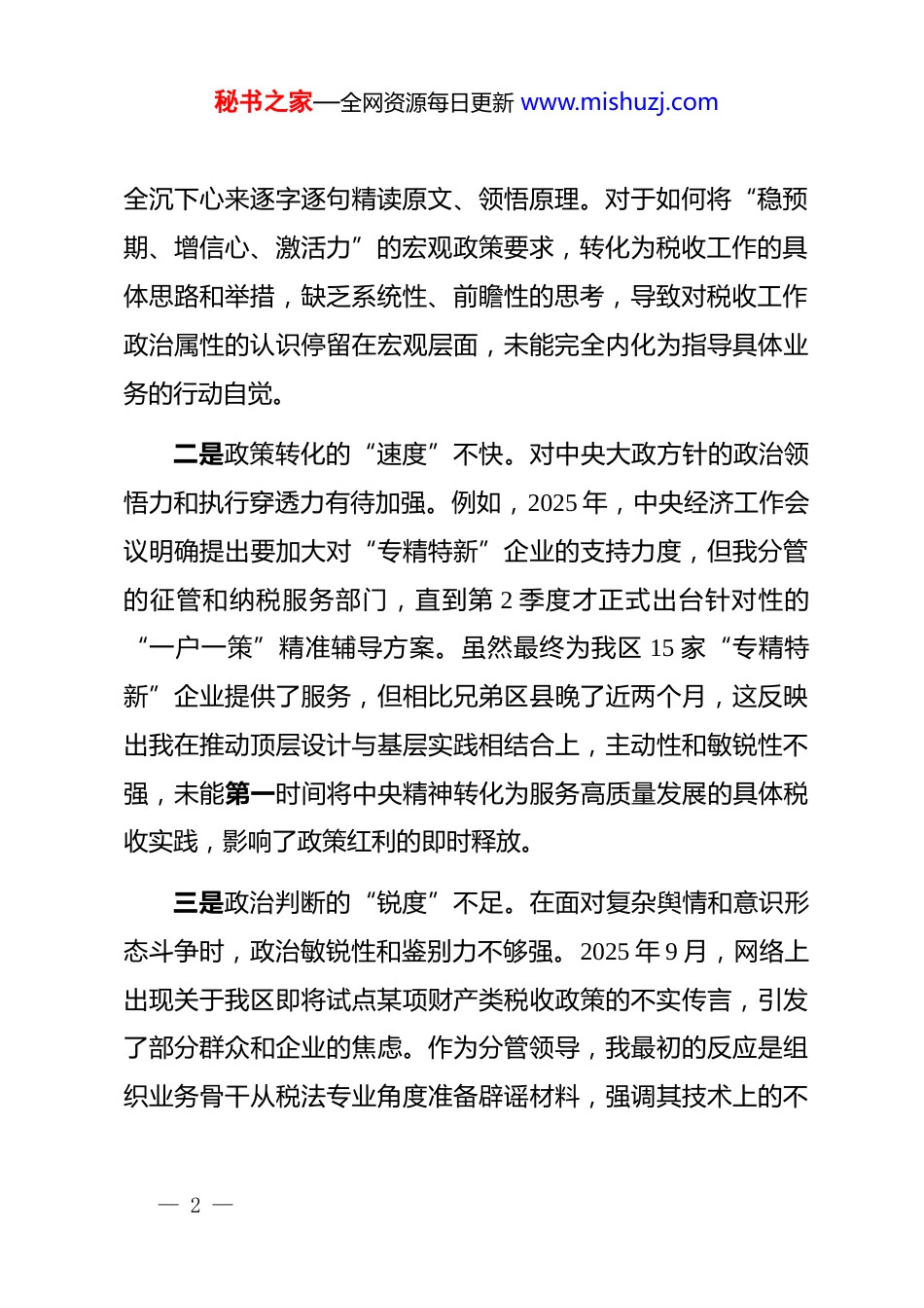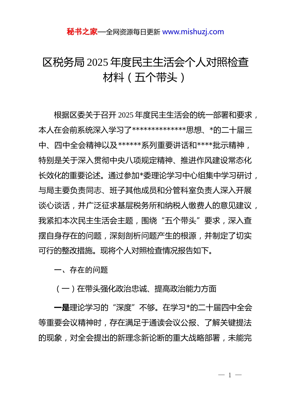秘书之家—全网资源每日更新 www.mishuzj.com区税务局 2025 年度民主生活会个人对照检查材料(五个带头)根据区委关于召开 2025 年度民主生活会的统一部署和要求,本人在会前系统深入学习了**************思想、*的二十届三中、四中全会精神以及******系列重要讲话和****批示精神,特别是关于深入贯彻中央八项规定精神、推进作风建设常态化长效化的重要论述。通过参加*委理论学习中心组集中学习研讨,与局主要负责同志、班子其他成员和分管科室负责人深入开展谈心谈话,并广泛征求基层税务所和纳税人缴费人的意见建议,我紧扣本次民主生活会主题,围绕“五个带头”要求,深入查摆自身存在的问题,深刻剖析问题产生的根源,并制定了切实可行的整改措施。现将个人对照检查情况报告如下。一、存在的问题(一)在带头强化政治忠诚、提高政治能力方面一是理论学习的“深度”不够。在学习*的二十届四中全会等重要会议精神时,存在满足于通读会议公报、了解关键提法的现象,对全会提出的新理念新论断的重大战略部署,未能完— 1 —秘书之家—全网资源每日更新 www.mishuzj.com全沉下心来逐字逐句精读原文、领悟原理。对于如何将“稳预期、增信心、激活力”的宏观政策要求,转化为税收工作的具体思路和举措,缺乏系统性、前瞻性的思考,导致对税收工作政治属性的认识停留在宏观层面,未能完全内化为指导具体业务的行动自觉。二是政策转化的“速度”不快。对中央大政方针的政治领悟力和执行穿透力有待加强。例如,2025 年,中央经济工作会议明确提出要加大对“专精特新”企业的支持力度,但我分管的征管和纳税服务部门,直到第 2 季度才正式出台针对性的“一户一策”精准辅导方案。虽然最终为我区 15 家“专精特新”企业提供了服务,但相比兄弟区县晚了近两个月,这反映出我在推动顶层设计与基层实践相结合上,主动性和敏锐性不强,未能第一时间将中央精神转化为服务高质量发展的具体税收实践,影响了政策红利的即时释放。三是政治判断的“锐度”不足。在面对复杂舆情和意识形态斗争时,政治敏锐性和鉴别力不够强。2025 年 9 月,网络上出现关于我区即将试点某项财产类税收政策的不实传言,引发了部分群众和企业的焦虑。作为分管领导,我最初的反应是组织业务骨干从税法专业角度准备辟谣材料,强调其技术上的不— 2 —秘书之家—全网资源每日更新 www.mishuzj.com可行性,而忽视了第一时间从维护社会稳定、安定人心的政治高度去研判和应对。这种重业务、轻政治的惯性思维,导致我们在引导舆论、消除社会疑虑的斗争中一度陷入被动。(二)在带头固本培元、增强*性方面一是价值追求的“坐标”有偏移。在世界观、人生观、价值观这个“总开关”问题上,存在不自觉地以事务主义代替*性原则的倾向。在工作中,有时片面追求税收收入、征管效率等显性指标,而对税收工作背后的人民性体悟不深。2025 年第三季度组织税费收入期间,为确保完成当期收入目标,我曾催促征管部门加紧对**科技有限公司的历史欠税进行清缴。该公司当时正面临供应链中断的短期流动性困难,虽然我们的执法行为完全合法合规,但简单化的处理方式险些成为压垮这家雇佣了 50 多名员工的企业的“最后一根稻草”。这件事深刻暴露了我在践行“为民收税”理念时,未能完全站稳人民立场。二是组织生活的“炉温”不够高。对参加双重组织生活的重要性认识不足,有时以工作繁忙为由,思想上不自觉地将业务会议置于组织生活之上。经查,2025 年度,我所在的第一*支部共组织了 12 次主题*日活动和专题学习,我因参加上级会议、处理紧急公务等原因请假 2 次,虽然履行了请假手续,但— 3 —秘书之家—全网资源每日更新 www.mishuzj.com反映出我未能正确处理工学矛盾,没有把参加组织生活作为加强*性锻炼、接受*员监督的硬约束,*员的先锋模范作用发挥不充分。三是自我革命的“刀锋”不够利。在开展批评和自我批评时,存在“爱惜羽毛”的思想,剖析自身问题不够深入、不够彻底。在年终总结和述职述廉报告中,往往讲成绩头头是道,摆问题则点到为止,多以客观因素作为解释,缺少主动揭短亮丑、深挖思想根源的勇气...