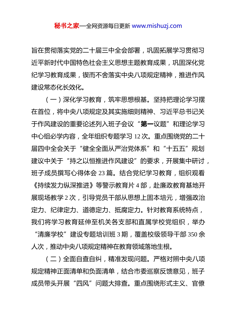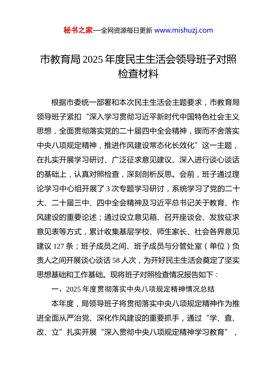 秘书之家—全网资源每日更新 www.mishuzj.com市教育局 2025 年度民主生活会领导班子对照检查材料 根据市委统一部署和本次民主生活会主题要求,市教育局领导班子紧扣“深入学习贯彻习近平新时代中国特色社会主义思想,全面贯彻落实党的二十届四中全会精神,锲而不舍落实中央八项规定精神,推进作风建设常态化长效化”这一主题,在扎实开展学习研讨、广泛征求意见建议、深入进行谈心谈话的基础上,认真对照检查,深刻剖析反思。会前,班子通过理论学习中心组开展了 3 次专题学习研讨,系统学习了党的二十大、二十届三中、四中全会精神及习近平总书记关于教育、作风建设的重要论述;通过设立意见箱、召开座谈会、发放征求意见表等方式,累计收集基层学校、师生家长、社会各界意见建议 127 条;班子成员之间、班子成员与分管处室(单位)负责人之间开展谈心谈话 58 人次,为开好民主生活会奠定了坚实思想基础和工作基础。现将班子对照检查情况报告如下:一、2025 年度贯彻落实中央八项规定精神情况总结本年度,局领导班子将贯彻落实中央八项规定精神作为推进全面从严治党、深化作风建设的重要抓手,通过“学、查、改、立”扎实开展“深入贯彻中央八项规定精神学习教育”,秘书之家—全网资源每日更新 www.mishuzj.com旨在贯彻落实党的二十届三中全会部署,巩固拓展学习贯彻习近平新时代中国特色社会主义思想主题教育成果,巩固深化党纪学习教育成果,锲而不舍落实中央八项规定精神,推进作风建设常态化长效化。(一)深化学习教育,筑牢思想根基。坚持把理论学习摆在首位,将中央八项规定及其实施细则精神、习近平总书记关于作风建设的重要论述列入班子会议“第一议题”和理论学习中心组必学内容,全年组织专题学习 12 次。重点围绕党的二十届四中全会关于“健全全面从严治党体系”和“十五五”规划建议中关于“持之以恒推进作风建设”的要求,开展集中研讨,班子成员撰写心得体会 23 篇。结合党纪学习教育,组织观看《持续发力纵深推进》等警示教育片 4 部,赴廉政教育基地开展现场教学 2 次,引导党员干部从思想上固本培元,增强政治定力、纪律定力、道德定力、抵腐定力。针对教育系统特点,我们将学习教育延伸至机关各支部和直属学校党组织,举办“清廉学校”建设专题培训班 3 期,覆盖校级领导干部 350 余人次,推动中央八项规定精神在教育领域落地生根。(二)全面自查自纠,精准发现问题。严格对照中央八项规定精神正面清单和负面清单,结合市委巡察反馈意见,班子成员带头开展“四风”问题大排查。重点围绕形式主义、官僚秘书之家—全网资源每日更新 www.mishuzj.com主义新表现,如调研“走马观花”、文件会议“空转”、服务群众“冷硬横推”等问题进行自查。全年班子主动精简合并会议 35%,压缩文件简报 28%,清理规范各类督查检查考核事项5 项。我们紧盯关键领域,对 2023 年以来涉及招生录取、项目招标、设备采购、经费使用等方面的信访举报和审计线索进行“起底式”复盘,排查出潜在廉政风险点 17 个。结合全国查处违反中央八项规定精神问题数据(如 2025 年 9 月全国查处问题28640 起,其中不担当、不作为等问题占比高),我们深刻警醒,聚焦履职尽责、服务发展方面的“软钉子”问题,建立了班子和个人问题整改台账,实行销号管理。(三)狠抓整改落实,务求工作实效。针对查摆出的问题和巡察反馈意见,班子坚决扛起整改主体责任,制定整改方案,明确责任分工和完成时限。在整治形式主义为基层减负方面,我们推行“无会日”“无扰周”,建立基层学校反映问题“直通车”机制,2025 年受理并办结基层减负类诉求 43 件。在纠治享乐主义、奢靡之风方面,我们开展了办公用房、公务用车、公务接待专项检查“回头看”,未发现反弹回潮问题。我们坚持将整改与推动中心工作结合,例如,针对“深入基层不够”问题,班子成员全年累计下校调研 189 天,现场解决学校扩建征地、师资短缺等实际困难 67 项;针对“服务群众‘最后一公秘书之家—全网资源每日更新 www.mishuzj.com里’”问题,优化了“阳光入学”服务平台,实现了义务教育阶段...