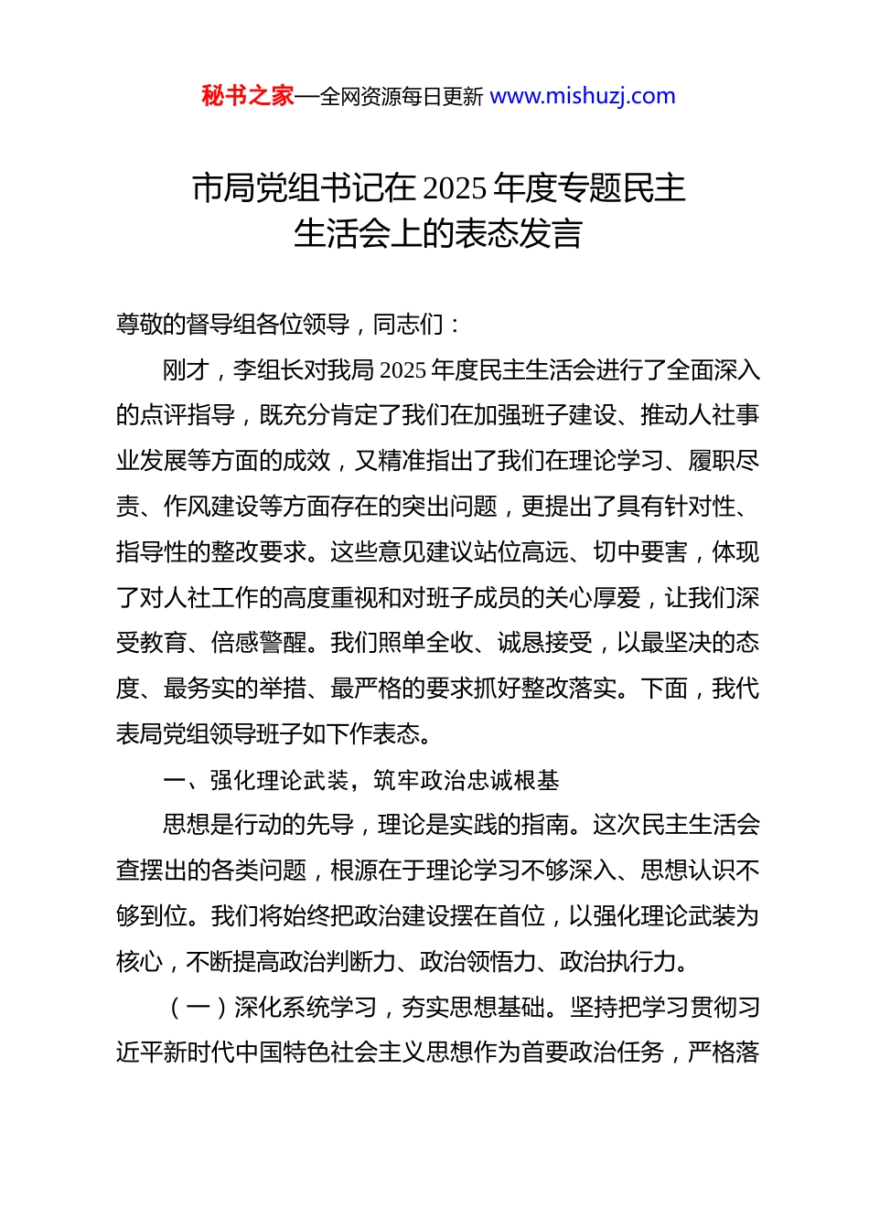 秘书之家—全网资源每日更新 www.mishuzj.com市局党组书记在 2025 年度专题民主生活会上的表态发言 尊敬的督导组各位领导,同志们:刚才,李组长对我局 2025 年度民主生活会进行了全面深入的点评指导,既充分肯定了我们在加强班子建设、推动人社事业发展等方面的成效,又精准指出了我们在理论学习、履职尽责、作风建设等方面存在的突出问题,更提出了具有针对性、指导性的整改要求。这些意见建议站位高远、切中要害,体现了对人社工作的高度重视和对班子成员的关心厚爱,让我们深受教育、倍感警醒。我们照单全收、诚恳接受,以最坚决的态度、最务实的举措、最严格的要求抓好整改落实。下面,我代表局党组领导班子如下作表态。一、强化理论武装,筑牢政治忠诚根基思想是行动的先导,理论是实践的指南。这次民主生活会查摆出的各类问题,根源在于理论学习不够深入、思想认识不够到位。我们将始终把政治建设摆在首位,以强化理论武装为核心,不断提高政治判断力、政治领悟力、政治执行力。(一)深化系统学习,夯实思想基础。坚持把学习贯彻习近平新时代中国特色社会主义思想作为首要政治任务,严格落秘书之家—全网资源每日更新 www.mishuzj.com实“第一议题”制度,将党的二十大及二十届四中全会精神、习近平总书记关于人力资源和社会保障工作的重要论述以纳入党组理论学习中心组学习计划,做到学深悟透、融会贯通。班子成员带头读原著、学原文、悟原理,带头参加集中学习、专题研讨和辅导培训,每月至少开展 1 次专题学习研讨,每季度撰写 1 篇高质量学习心得,切实把学习成效转化为坚定理想信念、加强党性修养的政治自觉。(二)创新学习方式,提升学习实效。完善学习制度体系,丰富学习载体形式,通过“线上+线下”“集中学习+个人自学”“专题研讨+实地调研”相结合的方式,组织开展人社政策解读、业务技能培训、先进典型宣讲等活动,增强学习的针对性和实效性。建立健全学习成果转化机制,围绕就业优先、社保改革、人才引育、劳动关系和谐等重点工作,开展专题调研走访,将学习成果转化为解决实际问题、推动人社事业高质量发展的实际本领。(三)强化政治引领,凝聚发展合力。教育引导全体党员干部深刻领悟“两个确立”的决定性意义,增强“四个意识”、坚定“四个自信”、做到“两个维护”,始终在思想上政治上行动上同以习近平同志为核心的党中央保持高度一致。把政治理论学习与人社工作实际紧密结合,切实把思想和行动统一到秘书之家—全网资源每日更新 www.mishuzj.com市委、市政府的决策部署上来,以理论上的清醒保证政治上的坚定,以思想上的统一保证行动上的一致,凝聚起推动人社事业发展的强大合力。二、坚持较真碰硬,永葆党内政治生活活力批评与自我批评是我们党的优良传统和政治优势,是解决党内矛盾、保持党的肌体健康的有力武器。我们将以这次民主生活会为契机,把批评与自我批评的好作风、好做法坚持下去,不断增强党组班子的凝聚力、战斗力和向心力。(一)严肃开展批评,提升党内生活质量。班子成员要带头弘扬自我革命精神,对自身存在的问题敢于“亮剑”,勇于解剖自己、深挖根源,做到自我批评不护短、不遮丑、触及灵魂;对同志存在的问题要出于公心、着眼帮助,本着对事业、对同志高度负责的态度,做到相互批评实事求是、真点问题、点真问题,坚决杜绝“好人主义”“一团和气”。通过常态化开展批评与自我批评,不断净化思想、锤炼党性、改进作风。(二)健全长效机制,规范党内政治生活。严格执行民主集中制,坚持集体领导和个人分工负责相结合,完善党组议事决策规则,对重大政策制定、重要项目安排、大额资金使用等事项,严格按照“集体领导、民主集中、个别酝酿、会议决定”的原则集体研究决定,不断增强党内政治生活的政治性、秘书之家—全网资源每日更新 www.mishuzj.com时代性、原则性、战斗性。坚持民主生活会、组织生活会、“三会一课”等制度不动摇,推动党内政治生活常态化、规范化、制度化。(三)加强团结协作,营造良好政治生态。班子成员之间要牢固树立“一盘棋”思想,既要各司其职、各负其责,又要相互支持、密切配合,形成...
