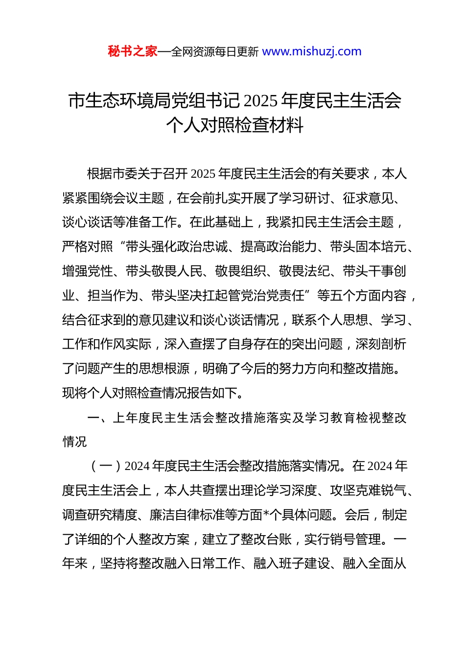 秘书之家—全网资源每日更新 www.mishuzj.com市生态环境局党组书记 2025 年度民主生活会个人对照检查材料 根据市委关于召开 2025 年度民主生活会的有关要求,本人紧紧围绕会议主题,在会前扎实开展了学习研讨、征求意见、谈心谈话等准备工作。在此基础上,我紧扣民主生活会主题,严格对照“带头强化政治忠诚、提高政治能力、带头固本培元、增强党性、带头敬畏人民、敬畏组织、敬畏法纪、带头干事创业、担当作为、带头坚决扛起管党治党责任”等五个方面内容,结合征求到的意见建议和谈心谈话情况,联系个人思想、学习、工作和作风实际,深入查摆了自身存在的突出问题,深刻剖析了问题产生的思想根源,明确了今后的努力方向和整改措施。现将个人对照检查情况报告如下。一、上年度民主生活会整改措施落实及学习教育检视整改情况(一)2024 年度民主生活会整改措施落实情况。在 2024 年度民主生活会上,本人共查摆出理论学习深度、攻坚克难锐气、调查研究精度、廉洁自律标准等方面*个具体问题。会后,制定了详细的个人整改方案,建立了整改台账,实行销号管理。一年来,坚持将整改融入日常工作、融入班子建设、融入全面从秘书之家—全网资源每日更新 www.mishuzj.com严治党全过程。一是聚焦理论武装抓深化。严格执行个人学习计划,年内参加局党组理论学习中心组学习*次,围绕生态文明思想、全国生态环境保护大会精神等主题,撰写学习心得、理论文章和调研报告*篇。注重学用结合,努力将学习成果转化为推动绿色低碳发展、深入打好污染防治攻坚战的具体思路,在谋划本市“无废城市”建设、生态保护补偿机制创新等工作中,尝试运用党的创新理论蕴含的立场观点方法分析矛盾、解决问题,政策理论水平与实践结合能力得到一定强化。二是聚焦担当尽责促实效。直面生态环境领域历史遗留问题和复杂挑战,牵头推进了*工业园区环境污染系统整治、*流域生态修复工程等重点难点任务。在应对*次生环境风险隐患、化解*“邻避”问题等工作中,主动靠前指挥,组织专题攻坚,通过完善应急预案、强化公众沟通、引入第三方评估等举措,取得了阶段性进展。但在推动产业结构深度绿色转型、跨区域跨流域环境协同治理等涉及深层次矛盾的问题上,破解的力度和系统性仍有待加强。三是聚焦作风转变求扎实。带头贯彻落实中央八项规定及其实施细则精神,大力整治文山会海,2024 年全局性会议、发文数量同比分别下降*%和*%。增加“四不两直”式调研频次,围绕“环境信访问题源头治理”“环保产业发展瓶颈”等课题开展蹲点调研,推动解决了*区域异味扰民、*企业危废处秘书之家—全网资源每日更新 www.mishuzj.com置难等一批群众和企业关切的实际问题。但调研的深度、精准度和成果转化效率仍有提升空间,解剖麻雀、举一反三做得不够。四是聚焦纪律规矩严要求。严格遵守党的政治纪律和政治规矩,认真履行“一岗双责”,加强对分管领域和身边人员的廉政教育、监督提醒。严格执行领导干部个人有关事项报告制度,规范操办婚丧喜庆事宜。在环保项目审批、专项资金分配、执法处罚等关键环节,坚持集体决策、依法依规,自觉抵制说情风、打招呼。截至目前,上年度查摆的*个问题均已完成整改并持续巩固,但自我革命精神需长期保持,作风建设需常抓不懈。(二)深入贯彻中央八项规定精神学习教育查摆问题整改情况。在深入贯彻中央八项规定精神学习教育中,本人坚持以身作则,带头深入学习、带头查摆问题、带头整改落实,通过对照反思、相互提醒、听取意见等方式,共查摆出调查研究、会议活动、文件简报、公务接待等方面*个具体问题。针对这些问题,均建立了整改清单,明确了时限和标准,做到立行立改、真改实改。例如,针对以往调研有时存在“走经典路线、看示范样板”的问题,深刻反思并坚决纠正,在后续关于大气污染防治精细化管理、农村黑臭水体治理等调研中,坚持随机选点、直插现场,深入企业和村庄一线了解真实情况,听取各方不同秘书之家—全网资源每日更新 www.mishuzj.com声音,掌握了大量第一手资料,推动完善了污染源在线监控管理和农村生活污水治理设施运维机制。针对“会议效率有待提高,有时议而不决”...