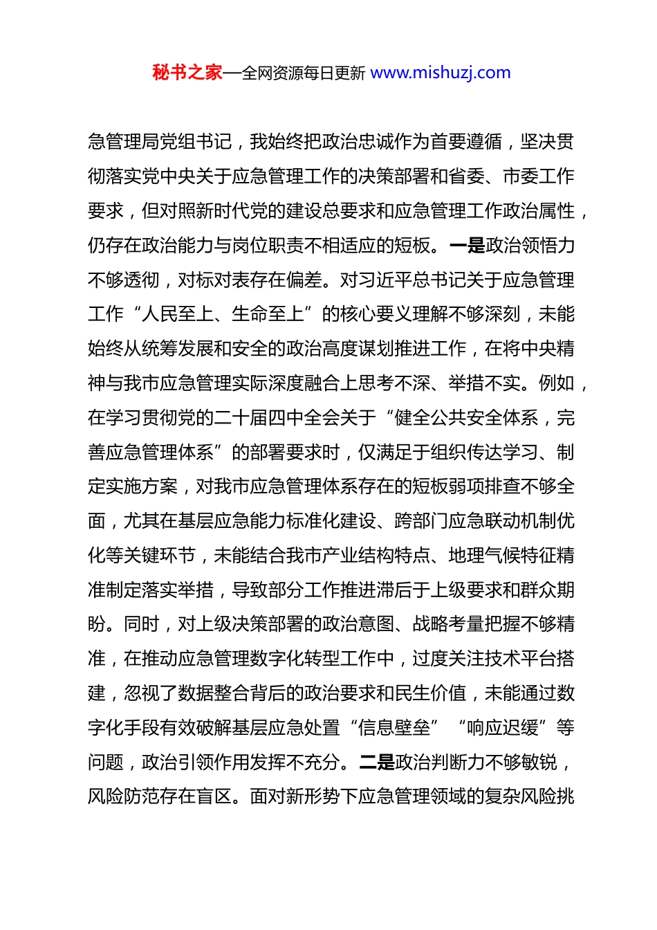 秘书之家—全网资源每日更新 www.mishuzj.com市直单位主要领导 2025 年度民主生活会对照检查材料 根据市委关于召开 2025 年度民主生活会的部署要求,会前,我紧扣会议主题,系统学习了党的二十届四中全会、中央经济工作会议及习近平总书记关于应急管理、安全生产、防灾减灾救灾工作的重要论述,深入研读了新修订《中国共产党章程》《中国共产党党组工作条例》及深入贯彻中央八项规定精神学习教育相关文件精神。通过座谈访谈、征求意见、谈心谈话等方式,广泛听取基层单位、党员干部、群众代表及服务对象的意见建议,全面梳理自身思想、工作、作风等方面情况。会上,我将秉持实事求是、坦诚相见的原则,紧扣“学思想、强党性、重实践、建新功”总要求,围绕“带头强化政治忠诚、提高政治能力,带头固本培元、增强党性,带头敬畏人民、敬畏组织、敬畏法纪,带头干事创业、担当作为,带头坚决扛起管党治党责任”五个核心方面,深入查摆自身存在的问题,深刻剖析问题根源,制定切实整改举措。现将对照检查情况汇报如下,恳请各位同志批评指正。一、存在的主要问题(一)带头强化政治忠诚、提高政治能力方面。作为市应秘书之家—全网资源每日更新 www.mishuzj.com急管理局党组书记,我始终把政治忠诚作为首要遵循,坚决贯彻落实党中央关于应急管理工作的决策部署和省委、市委工作要求,但对照新时代党的建设总要求和应急管理工作政治属性,仍存在政治能力与岗位职责不相适应的短板。一是政治领悟力不够透彻,对标对表存在偏差。对习近平总书记关于应急管理工作“人民至上、生命至上”的核心要义理解不够深刻,未能始终从统筹发展和安全的政治高度谋划推进工作,在将中央精神与我市应急管理实际深度融合上思考不深、举措不实。例如,在学习贯彻党的二十届四中全会关于“健全公共安全体系,完善应急管理体系”的部署要求时,仅满足于组织传达学习、制定实施方案,对我市应急管理体系存在的短板弱项排查不够全面,尤其在基层应急能力标准化建设、跨部门应急联动机制优化等关键环节,未能结合我市产业结构特点、地理气候特征精准制定落实举措,导致部分工作推进滞后于上级要求和群众期盼。同时,对上级决策部署的政治意图、战略考量把握不够精准,在推动应急管理数字化转型工作中,过度关注技术平台搭建,忽视了数据整合背后的政治要求和民生价值,未能通过数字化手段有效破解基层应急处置“信息壁垒”“响应迟缓”等问题,政治引领作用发挥不充分。二是政治判断力不够敏锐,风险防范存在盲区。面对新形势下应急管理领域的复杂风险挑秘书之家—全网资源每日更新 www.mishuzj.com战,运用政治眼光分析研判风险隐患的能力不足,对一些苗头性、倾向性问题警惕性不高,未能及时从政治高度洞察潜在风险。2025 年汛期,我市部分山区出现短时强降雨,在前期风险研判中,我更多关注地质灾害点的常规防控,对山区小型水库、河道支流等隐蔽性风险点排查不够细致,对极端天气可能引发的次生灾害预判不足,导致在突发暴雨时,部分区域出现险情处置被动局面。此外,在统筹推进安全生产专项整治行动中,对危化品、矿山等高危行业领域的显性风险整治力度较大,但对小微企业、城乡结合部作坊等监管薄弱环节的隐性风险重视不够,未能从维护社会稳定的政治高度统筹推进全领域风险防控,反映出政治判断力与“防风险、保安全”的核心职责要求存在差距。三是政治执行力不够坚决,贯彻落实存在落差。在推动上级应急管理决策部署落地见效过程中,存在“重部署、轻落实”“重形式、轻实效”的现象,部分工作未能一抓到底、善作善成。例如,在落实省委关于“加强基层应急救援队伍建设”的要求时,虽组织召开了专题会议、印发了工作方案,但在具体推进中,对县(区)应急救援队伍人员配备、装备更新、训练演练等情况跟踪督导不够严格,对存在的经费保障不足、专业能力薄弱等问题协调解决不及时,导致部分基层应急救援队伍“建而不用、用而不精”,未能充分发挥应急处置前沿阵秘书之家—全网资源每日更新 www.mishuzj.com地作用。同时,在统筹协调跨部门、跨领域应急工作时,存在畏难情绪,对一些职责边界模糊...