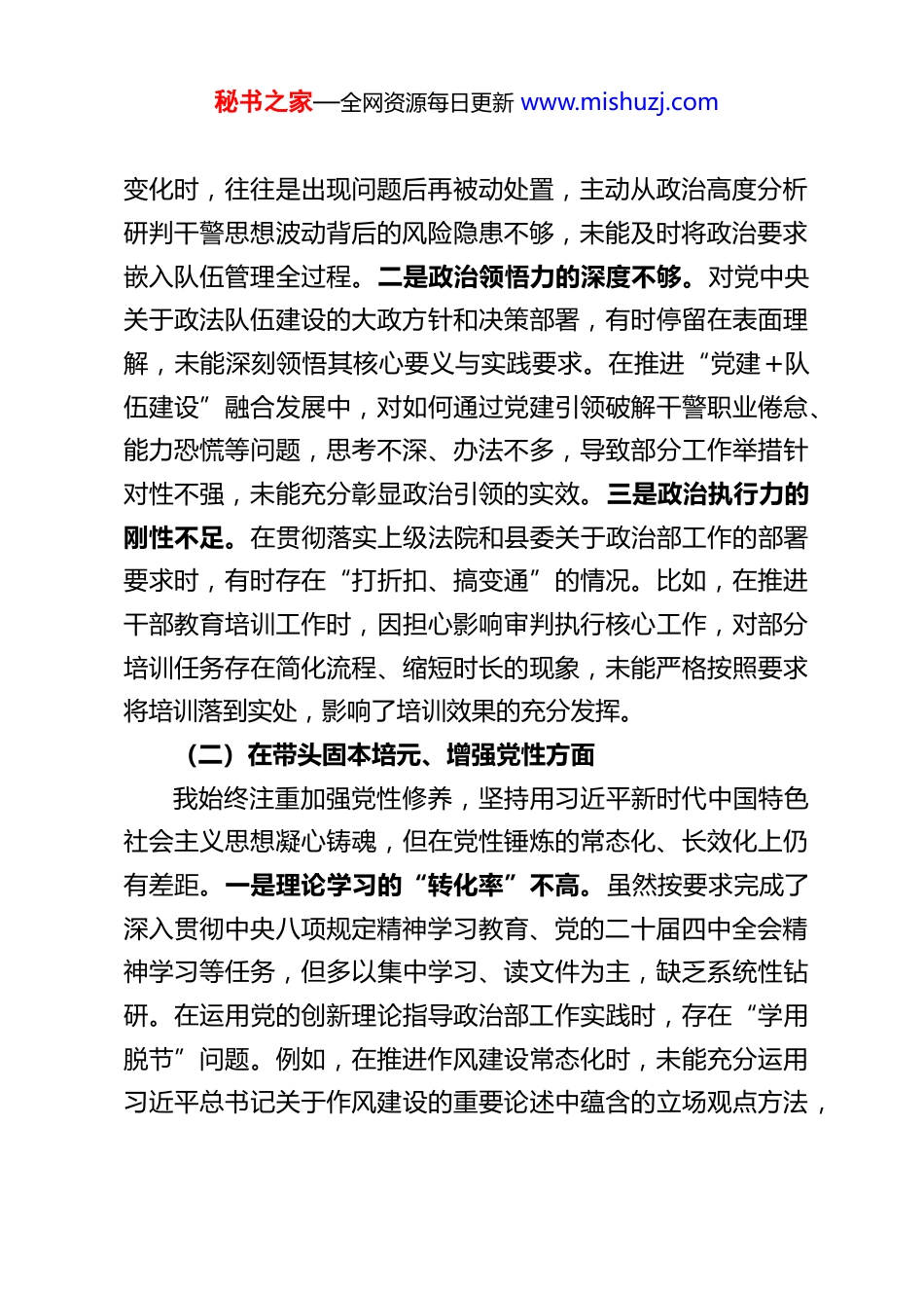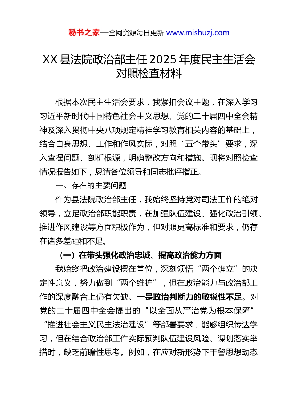 秘书之家—全网资源每日更新 www.mishuzj.comXX 县法院政治部主任 2025 年度民主生活会对照检查材料根据本次民主生活会要求,我紧扣会议主题,在深入学习习近平新时代中国特色社会主义思想、党的二十届四中全会精神及深入贯彻中央八项规定精神学习教育相关内容的基础上,结合自身思想、工作和作风实际,对照“五个带头”要求,深入查摆问题、剖析根源,明确整改方向和措施。现将对照检查情况报告如下,恳请各位领导和同志批评指正。一、存在的主要问题作为县法院政治部主任,我始终坚持党对司法工作的绝对领导,立足政治部职能职责,在加强队伍建设、强化政治引领、推进作风建设等方面积极作为,但对照更高标准和要求,仍存在诸多差距和不足。(一)在带头强化政治忠诚、提高政治能力方面我始终把政治建设摆在首位,深刻领悟“两个确立”的决定性意义,努力做到“两个维护”,但在政治能力与政治部工作的深度融合上仍有欠缺。一是政治判断力的敏锐性不足。对党的二十届四中全会提出的“以全面从严治党为根本保障”“推进社会主义民主法治建设”等部署要求,能够组织传达学习,但在结合政治部工作实际预判队伍建设风险、谋划落实举措时,缺乏前瞻性思考。例如,在应对新形势下干警思想动态秘书之家—全网资源每日更新 www.mishuzj.com变化时,往往是出现问题后再被动处置,主动从政治高度分析研判干警思想波动背后的风险隐患不够,未能及时将政治要求嵌入队伍管理全过程。二是政治领悟力的深度不够。对党中央关于政法队伍建设的大政方针和决策部署,有时停留在表面理解,未能深刻领悟其核心要义与实践要求。在推进“党建+队伍建设”融合发展中,对如何通过党建引领破解干警职业倦怠、能力恐慌等问题,思考不深、办法不多,导致部分工作举措针对性不强,未能充分彰显政治引领的实效。三是政治执行力的刚性不足。在贯彻落实上级法院和县委关于政治部工作的部署要求时,有时存在“打折扣、搞变通”的情况。比如,在推进干部教育培训工作时,因担心影响审判执行核心工作,对部分培训任务存在简化流程、缩短时长的现象,未能严格按照要求将培训落到实处,影响了培训效果的充分发挥。(二)在带头固本培元、增强党性方面我始终注重加强党性修养,坚持用习近平新时代中国特色社会主义思想凝心铸魂,但在党性锤炼的常态化、长效化上仍有差距。一是理论学习的“转化率”不高。虽然按要求完成了深入贯彻中央八项规定精神学习教育、党的二十届四中全会精神学习等任务,但多以集中学习、读文件为主,缺乏系统性钻研。在运用党的创新理论指导政治部工作实践时,存在“学用脱节”问题。例如,在推进作风建设常态化时,未能充分运用习近平总书记关于作风建设的重要论述中蕴含的立场观点方法,秘书之家—全网资源每日更新 www.mishuzj.com对如何破解形式主义、官僚主义顽疾,缺乏突破性思路和有效举措。二是党性锻炼的“日常性”松懈。能够按时参加民主生活会、组织生活会等集体党性锻炼活动,但以普通党员身份深入所在支部参与组织生活、开展谈心谈话、进行批评与自我批评时,往往流于形式,缺乏“动真碰硬”的勇气。在日常工作中,有时存在“重业务、轻党性”的倾向,将更多精力放在干部选拔、绩效考核等具体业务上,对自身和干警的党性修养提升关注不够。三是精神追求的“坚守度”不足。在面对工作中的困难和压力时,有时会产生懈怠情绪,缺乏老一辈共产党人艰苦奋斗、攻坚克难的精神。在推进政治部繁重工作任务时,偶尔会出现“求稳怕乱”的思想,缺乏主动担当、锐意进取的劲头,未能始终以饱满的精神状态践行共产党人的精神追求。(三)在带头敬畏人民、敬畏组织、敬畏法纪方面我始终牢记党的宗旨,严守组织纪律和法律法规,但在践行“三个敬畏”的深度和广度上仍有不足。一是敬畏人民的理念树得不牢。虽然能够落实“四下基层”制度,但在深入基层、联系群众方面存在“走过场”现象。开展干警家访、走访群众时,往往是提前安排路线、预设问题,与基层干警、群众面对面交流的深度不够,未能真正倾听他们的心声、了解他们的急难愁盼。在推进司法为民相关队伍建设工作时,更多考虑的是完成上...
