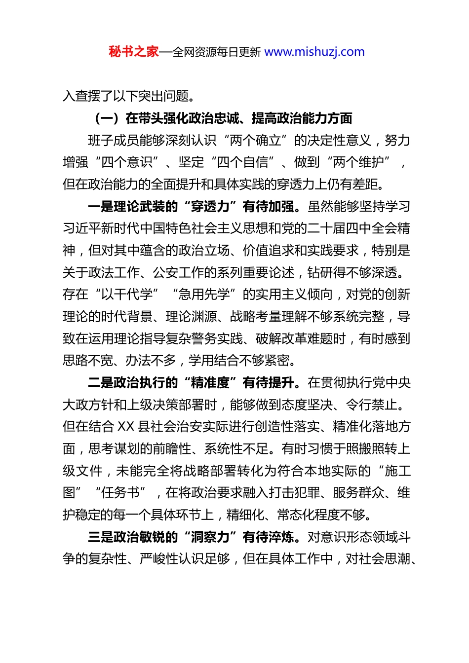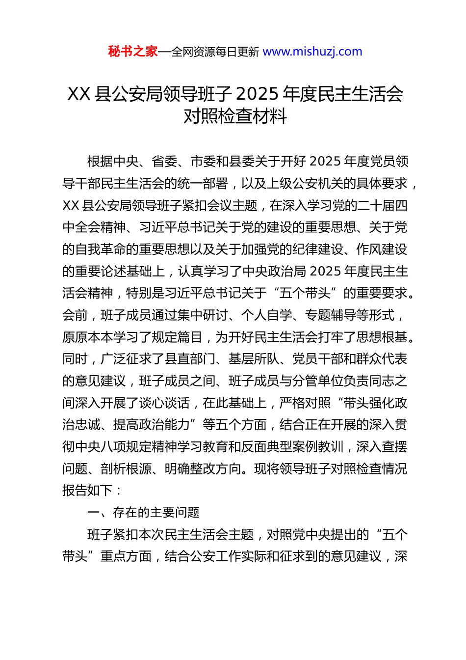 秘书之家—全网资源每日更新 www.mishuzj.comXX 县公安局领导班子 2025 年度民主生活会对照检查材料根据中央、省委、市委和县委关于开好 2025 年度党员领导干部民主生活会的统一部署,以及上级公安机关的具体要求,XX 县公安局领导班子紧扣会议主题,在深入学习党的二十届四中全会精神、习近平总书记关于党的建设的重要思想、关于党的自我革命的重要思想以及关于加强党的纪律建设、作风建设的重要论述基础上,认真学习了中央政治局 2025 年度民主生活会精神,特别是习近平总书记关于“五个带头”的重要要求。会前,班子成员通过集中研讨、个人自学、专题辅导等形式,原原本本学习了规定篇目,为开好民主生活会打牢了思想根基。同时,广泛征求了县直部门、基层所队、党员干部和群众代表的意见建议,班子成员之间、班子成员与分管单位负责同志之间深入开展了谈心谈话,在此基础上,严格对照“带头强化政治忠诚、提高政治能力”等五个方面,结合正在开展的深入贯彻中央八项规定精神学习教育和反面典型案例教训,深入查摆问题、剖析根源、明确整改方向。现将领导班子对照检查情况报告如下:一、存在的主要问题班子紧扣本次民主生活会主题,对照党中央提出的“五个带头”重点方面,结合公安工作实际和征求到的意见建议,深秘书之家—全网资源每日更新 www.mishuzj.com入查摆了以下突出问题。(一)在带头强化政治忠诚、提高政治能力方面班子成员能够深刻认识“两个确立”的决定性意义,努力增强“四个意识”、坚定“四个自信”、做到“两个维护”,但在政治能力的全面提升和具体实践的穿透力上仍有差距。一是理论武装的“穿透力”有待加强。虽然能够坚持学习习近平新时代中国特色社会主义思想和党的二十届四中全会精神,但对其中蕴含的政治立场、价值追求和实践要求,特别是关于政法工作、公安工作的系列重要论述,钻研得不够深透。存在“以干代学”“急用先学”的实用主义倾向,对党的创新理论的时代背景、理论渊源、战略考量理解不够系统完整,导致在运用理论指导复杂警务实践、破解改革难题时,有时感到思路不宽、办法不多,学用结合不够紧密。二是政治执行的“精准度”有待提升。在贯彻执行党中央大政方针和上级决策部署时,能够做到态度坚决、令行禁止。但在结合 XX 县社会治安实际进行创造性落实、精准化落地方面,思考谋划的前瞻性、系统性不足。有时习惯于照搬照转上级文件,未能完全将战略部署转化为符合本地实际的“施工图”“任务书”,在将政治要求融入打击犯罪、服务群众、维护稳定的每一个具体环节上,精细化、常态化程度不够。三是政治敏锐的“洞察力”有待淬炼。对意识形态领域斗争的复杂性、严峻性认识足够,但在具体工作中,对社会思潮、秘书之家—全网资源每日更新 www.mishuzj.com网络舆情中可能隐含的政治风险、稳定隐患,有时见事不够早、鉴别不够准、反应不够快。尤其是在新媒体环境下,对涉警舆情背后可能存在的深层次政治意图或社会矛盾,缺乏足够的预判能力和一抓到底、消除隐患的斗争韧劲。四是保持战略定力的“持久性”有待巩固。面对艰巨繁重的公安保卫任务和不断出现的新风险新挑战,班子成员能够保持总体上的信心和定力。但在面对一些长期存在的治安顽疾或短期内难以取得突破的改革难题时,个别同志偶尔会产生畏难情绪或“绕道走”的想法,攻坚克难的锐气和“一张蓝图绘到底”的恒心有所减弱,未能时时处处展现出“任凭风浪起,稳坐钓鱼台”的战略清醒和政治坚定。(二)在带头固本培元、增强党性方面班子成员注重加强党性修养,坚守共产党人精神追求,但对照党章党规党纪的高标准,在党性锤炼的主动性和纯粹性上仍需持续用力。一是党性修养的“主动锤炼”意识不足。能够参加党的组织生活,但在运用批评与自我批评武器进行思想交锋、净化灵魂方面,“辣味”依然不足。自我批评有时避重就轻,相互批评多以工作建议代替思想帮助,“好人主义”思想仍未根除。将党性修养融入日常、抓在经常的自觉性不够,未能时时以党性原则正心明道、修身律己,世界观、人生观、价值观“总开关”拧得不够紧。秘书之家—全网资源每日更新 www.mishuzj.com二是...