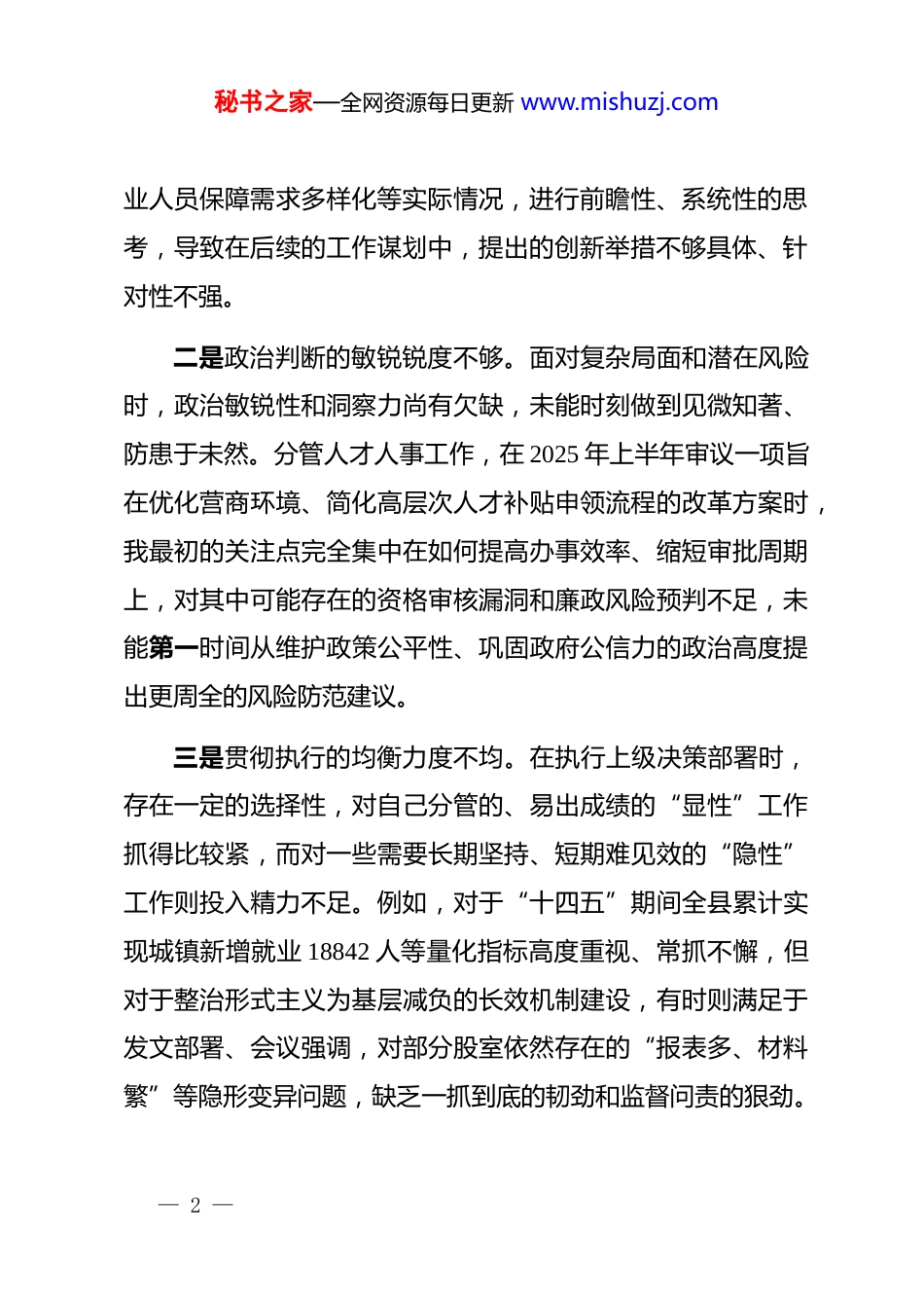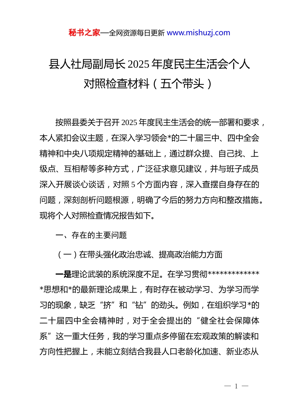 秘书之家—全网资源每日更新 www.mishuzj.com县人社局副局长 2025 年度民主生活会个人对照检查材料(五个带头)按照县委关于召开 2025 年度民主生活会的统一部署和要求,本人紧扣会议主题,在深入学习领会*的二十届三中、四中全会精神和中央八项规定精神的基础上,通过群众提、自己找、上级点、互相帮等多种方式,广泛征求意见建议,并与班子成员深入开展谈心谈话,对照 5 个方面内容,深入查摆自身存在的问题,深刻剖析问题根源,明确了今后的努力方向和整改措施。现将个人对照检查情况报告如下。一、存在的主要问题(一)在带头强化政治忠诚、提高政治能力方面一是理论武装的系统深度不足。在学习贯彻**************思想和*的最新理论成果上,有时存在被动学习、为学习而学习的现象,缺乏“挤”和“钻”的劲头。例如,在组织学习*的二十届四中全会精神时,对于全会提出的“健全社会保障体系”这一重大任务,我的学习重点多停留在宏观政策的解读和方向性把握上,未能立刻结合我县人口老龄化加速、新业态从— 1 —秘书之家—全网资源每日更新 www.mishuzj.com业人员保障需求多样化等实际情况,进行前瞻性、系统性的思考,导致在后续的工作谋划中,提出的创新举措不够具体、针对性不强。二是政治判断的敏锐锐度不够。面对复杂局面和潜在风险时,政治敏锐性和洞察力尚有欠缺,未能时刻做到见微知著、防患于未然。分管人才人事工作,在 2025 年上半年审议一项旨在优化营商环境、简化高层次人才补贴申领流程的改革方案时,我最初的关注点完全集中在如何提高办事效率、缩短审批周期上,对其中可能存在的资格审核漏洞和廉政风险预判不足,未能第一时间从维护政策公平性、巩固政府公信力的政治高度提出更周全的风险防范建议。三是贯彻执行的均衡力度不均。在执行上级决策部署时,存在一定的选择性,对自己分管的、易出成绩的“显性”工作抓得比较紧,而对一些需要长期坚持、短期难见效的“隐性”工作则投入精力不足。例如,对于“十四五”期间全县累计实现城镇新增就业 18842 人等量化指标高度重视、常抓不懈,但对于整治形式主义为基层减负的长效机制建设,有时则满足于发文部署、会议强调,对部分股室依然存在的“报表多、材料繁”等隐形变异问题,缺乏一抓到底的韧劲和监督问责的狠劲。— 2 —秘书之家—全网资源每日更新 www.mishuzj.com(二)在带头固本培元、增强*性修养方面一是理想信念的淬炼偶有松懈。面对当前人社领域改革发展的繁重任务,特别是社会保险基金监管压力持续增大的新形势,偶尔会产生畏难情绪和“歇歇脚”的想法。在推进社保基金风险防控体系建设的过程中,面对数据壁垒多、核查难度大等现实困难,也曾一度有过“但求无过、稳妥推进”的保守心态,缺乏了革命前辈那种“敢教日月换新天”的豪情壮志和攻坚克难的坚定意志。二是*性分析的剖析偶有保留。在参加组织生活会、开展批评与自我批评时,虽然能够坦陈自身存在的不足,但有时“辣味”不够,未能真正做到“红脸出汗”。对于一些深层次的思想问题,习惯于用工作问题代替思想问题,用客观原因代替主观原因。比如,在反思我县事业单位人事制度改革推进速度偏慢的问题时,我更多地强调了外部环境和历史遗留因素,而对自己内心深处求稳怕乱、不敢大刀阔斧改革的真实思想剖析不够深刻、触及灵魂不够。三是道德品行的修养偶有忽视。日常工作中,有时过于注重业务指标的完成,对个人道德情操的涵养有所放松。在处理紧急和繁杂事务时,偶尔会表现出急躁情绪,对下属的指导缺— 3 —秘书之家—全网资源每日更新 www.mishuzj.com乏足够的耐心。例如,在一次为筹备全县就业工作推进会而连续加班期间,面对一名年轻同志提交的会议材料存在较多瑕疵,我没有和风细雨地帮助其分析问题、指点方法,而是语气严厉地予以批评,虽然是出于对工作负责,但方式方法过于简单,未能体现出对同志的关心爱护和*员领导干部应有的道德风范。(三)在带头敬畏人民、敬畏组织、敬畏法纪方面一是服务群众的宗旨意识有所淡化。虽然能够坚持落实“四下基层”制度,但调研的深度和效果有待提升。有时下基层存在“走马观花”现...