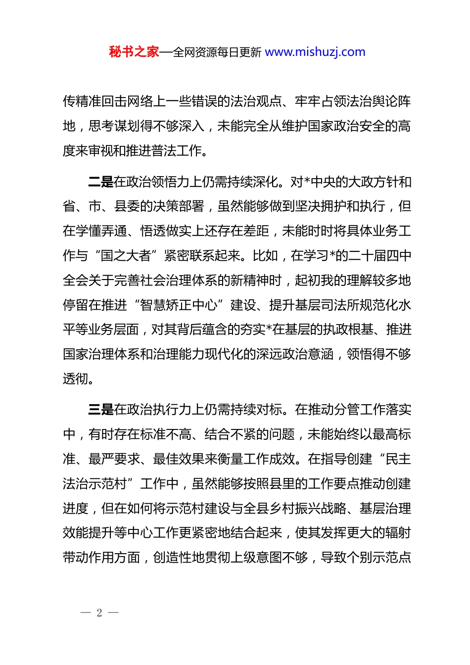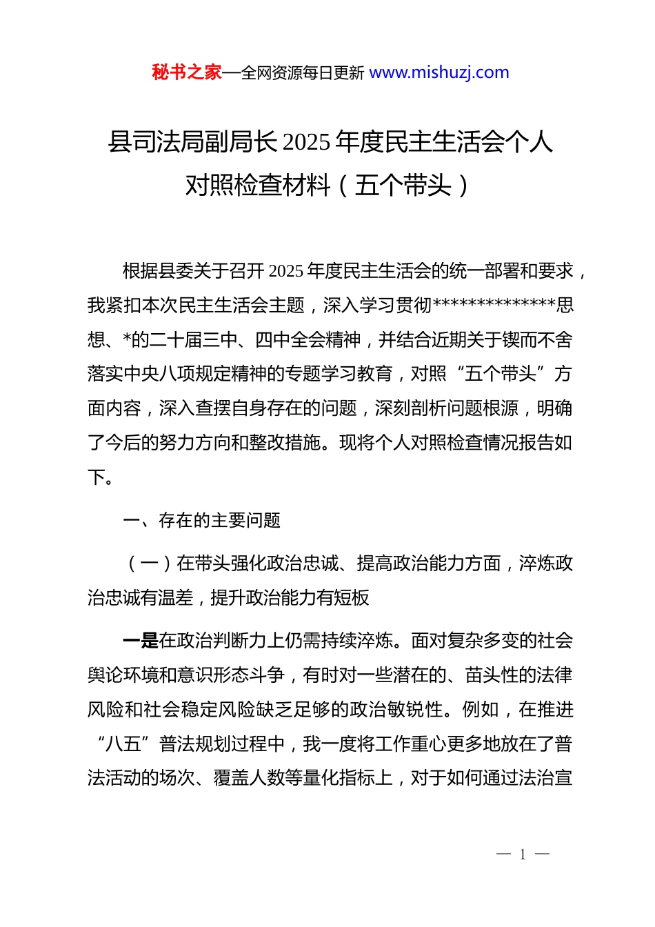 秘书之家—全网资源每日更新 www.mishuzj.com县司法局副局长 2025 年度民主生活会个人对照检查材料(五个带头)根据县委关于召开 2025 年度民主生活会的统一部署和要求,我紧扣本次民主生活会主题,深入学习贯彻**************思想、*的二十届三中、四中全会精神,并结合近期关于锲而不舍落实中央八项规定精神的专题学习教育,对照“五个带头”方面内容,深入查摆自身存在的问题,深刻剖析问题根源,明确了今后的努力方向和整改措施。现将个人对照检查情况报告如下。一、存在的主要问题(一)在带头强化政治忠诚、提高政治能力方面,淬炼政治忠诚有温差,提升政治能力有短板一是在政治判断力上仍需持续淬炼。面对复杂多变的社会舆论环境和意识形态斗争,有时对一些潜在的、苗头性的法律风险和社会稳定风险缺乏足够的政治敏锐性。例如,在推进“八五”普法规划过程中,我一度将工作重心更多地放在了普法活动的场次、覆盖人数等量化指标上,对于如何通过法治宣— 1 —秘书之家—全网资源每日更新 www.mishuzj.com传精准回击网络上一些错误的法治观点、牢牢占领法治舆论阵地,思考谋划得不够深入,未能完全从维护国家政治安全的高度来审视和推进普法工作。二是在政治领悟力上仍需持续深化。对*中央的大政方针和省、市、县委的决策部署,虽然能够做到坚决拥护和执行,但在学懂弄通、悟透做实上还存在差距,未能时时将具体业务工作与“国之大者”紧密联系起来。比如,在学习*的二十届四中全会关于完善社会治理体系的新精神时,起初我的理解较多地停留在推进“智慧矫正中心”建设、提升基层司法所规范化水平等业务层面,对其背后蕴含的夯实*在基层的执政根基、推进国家治理体系和治理能力现代化的深远政治意涵,领悟得不够透彻。三是在政治执行力上仍需持续对标。在推动分管工作落实中,有时存在标准不高、结合不紧的问题,未能始终以最高标准、最严要求、最佳效果来衡量工作成效。在指导创建“民主法治示范村”工作中,虽然能够按照县里的工作要点推动创建进度,但在如何将示范村建设与全县乡村振兴战略、基层治理效能提升等中心工作更紧密地结合起来,使其发挥更大的辐射带动作用方面,创造性地贯彻上级意图不够,导致个别示范点— 2 —秘书之家—全网资源每日更新 www.mishuzj.com的创建特色不够鲜明,与市、省级的更高要求相比存在一定差距。(二)在带头固本培元、增强*性方面,锤炼坚强*性有惰性,筑牢思想根基有松动一是理论学习的系统性和穿透性不强。在学习**************思想上,有时满足于“任务式”学习,存在“用到才学、急用先学”的现象,缺乏“挤”和“钻”的劲头。例如,在筹备一次面向全县人民调解员的业务培训前,我会重点翻阅关于“枫桥经验”的论述,但未能将此与*的群众路线发展史、国家治理现代化等理论进行系统性关联思考,导致理论学习的深度和广度不足,未能完全将蕴含其中的立场、观点、方法转化为指导工作的强大思想武器。二是*性锤炼的自觉性主动性不够。在严格的*内政治生活中锻炼*性的自觉性还不够强,有时存在以事务性工作交流代替严肃思想交锋的情况。在一次讨论“智慧矫正中心”建设方案的*组会上,我的发言内容完全集中在技术参数、预算控制和施工进度上,而忽视了从这次技术革新出发,深入剖析自身在践行以人民为中心的执法理念、推动司法文明进步方面的*性要求和思想差距,*性剖析的“辣味”不足。— 3 —秘书之家—全网资源每日更新 www.mishuzj.com三是价值追求的纯粹性坚定性偶有偏差。在政绩观上,未能完全摆脱“显性”与“隐性”的思维束缚,对一些打基础、利长远但短期内不易出成效的工作,投入的精力相对不足。相较于组织一场声势浩大的“法律八进”集中宣传活动,我有时对于逐一审核社区矫正对象的档案材料、耐心细致地开展个别化矫正这类基础性工作,在思想深处会不自觉地产生一丝懈怠,这反映出自己的世界观、人生观、价值观这个“总开关”拧得还不够紧。(三)在带头敬畏人民、敬畏组织、敬畏法纪方面,践行群众路线有距离,严守纪律规矩有差距一是深入基层联系群众未能真正“沉下去”。虽然能够坚持落实“四下基层”制度...