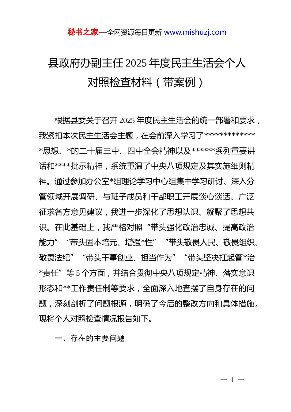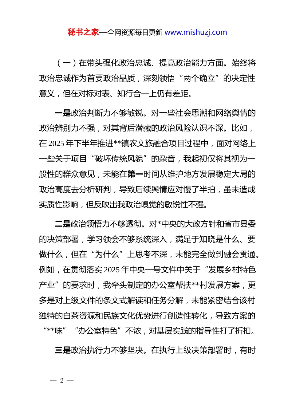 秘书之家—全网资源每日更新 www.mishuzj.com县政府办副主任 2025 年度民主生活会个人对照检查材料(带案例)根据县委关于召开 2025 年度民主生活会的统一部署和要求,我紧扣本次民主生活会主题,在会前深入学习了**************思想、*的二十届三中、四中全会精神以及******系列重要讲话和****批示精神,系统重温了中央八项规定及其实施细则精神。通过参加办公室*组理论学习中心组集中学习研讨、深入分管领域开展调研、与班子成员和干部职工开展谈心谈话、广泛征求各方意见建议,我进一步深化了思想认识、凝聚了思想共识。在此基础上,我严格对照“带头强化政治忠诚、提高政治能力”“带头固本培元、增强*性”“带头敬畏人民、敬畏组织、敬畏法纪”“带头干事创业、担当作为”“带头坚决扛起管*治*责任”等 5 个方面,并结合贯彻中央八项规定精神、落实意识形态和**工作责任制等要求,全面深入地查摆了自身存在的问题,深刻剖析了问题根源,明确了今后的整改方向和具体措施。现将个人对照检查情况报告如下。一、存在的主要问题— 1 —秘书之家—全网资源每日更新 www.mishuzj.com(一)在带头强化政治忠诚、提高政治能力方面。始终将政治忠诚作为首要政治品质,深刻领悟“两个确立”的决定性意义,但在对标对表、知行合一上仍有差距。一是政治判断力不够敏锐。对一些社会思潮和网络舆情的政治辨别力不强,对其背后潜藏的政治风险认识不深。比如,在 2025 年下半年推进**镇农文旅融合项目过程中,面对网络上一些关于项目“破坏传统风貌”的杂音,我起初仅将其视为一般性的群众意见,未能在第一时间从维护地方发展稳定大局的政治高度去分析研判,导致后续舆情应对慢了半拍,虽未造成实质性影响,但反映出我政治嗅觉的敏锐性不强。二是政治领悟力不够透彻。对*中央的大政方针和省市县委的决策部署,学习领会不够系统深入,满足于知晓是什么、要做什么,但在“为什么”上思考不深,未能完全做到融会贯通。例如,在贯彻落实 2025 年中央一号文件中关于“发展乡村特色产业”的要求时,我牵头制定的办公室帮扶**村发展方案,更多是对上级文件的条文式解读和任务分解,未能紧密结合该村独特的白茶资源和民族文化优势进行创造性转化,导致方案的“**味”“办公室特色”不浓,对基层实践的指导性打了折扣。三是政治执行力不够坚决。在执行上级决策部署时,有时— 2 —秘书之家—全网资源每日更新 www.mishuzj.com存在“等一等、看一看”的想法,未能做到令行禁止、立说立行。2025 年 10 月,县委要求各单位报送数字化改革服务乡村振兴的典型案例,我考虑到当时办公室牵头的几个项目正处在攻坚期,数据和成效尚不突出,便将此事暂缓,想着等项目成熟了再报送,结果错过了最佳报送时机。这实质上是执行力打了折扣,缺乏“不等不靠、主动作为”的政治担当。(二)在带头固本培元、增强*性方面。坚持用**************思想凝心铸魂,但理论武装的系统性和实践性结合不紧。一是理论学习的深度不够。对新思想、新理论的学习,有时停留在“读过了”“学过了”的层面,系统性研读、钻研式思考不够。2025 年全年,我虽然完成了规定的学习任务,撰写了 4 篇学习心得,但对照检查发现,自己更多是关注了与分管工作直接相关的章节,对“五位一体”总体布局、“四个全面”战略布局中其他领域的理论学习投入精力不均,知识体系存在短板。二是*性锤炼的自觉性不强。在*性分析和自我剖析上对自己“下猛药”不够,有时以工作繁忙为由,参加支部组织生活的主动性打了折扣。去年第三季度,我因连续参与筹备全县几个重大会议,曾有 2 次未能全程参加所在*支部的“三会一课”,— 3 —秘书之家—全网资源每日更新 www.mishuzj.com仅以书面形式请假,这反映出我在处理工学矛盾时,未能始终把加强*性锻炼摆在首位。三是理想信念的根基不牢。面对乡村振兴工作中的复杂矛盾和繁重任务,偶尔会产生畏难情绪和“歇歇脚”的念头。在推进**村集体经济发展项目时,初期因土地流转问题遇到部分村民阻力,连续开了几次协调会效果不彰,我一度产生了“这个项目是不是太急了”的动摇思想,虽然最终...