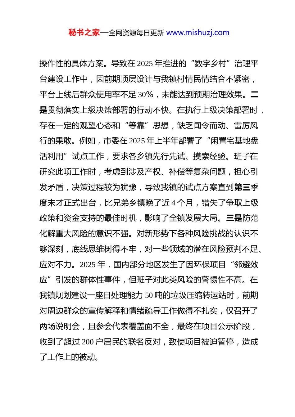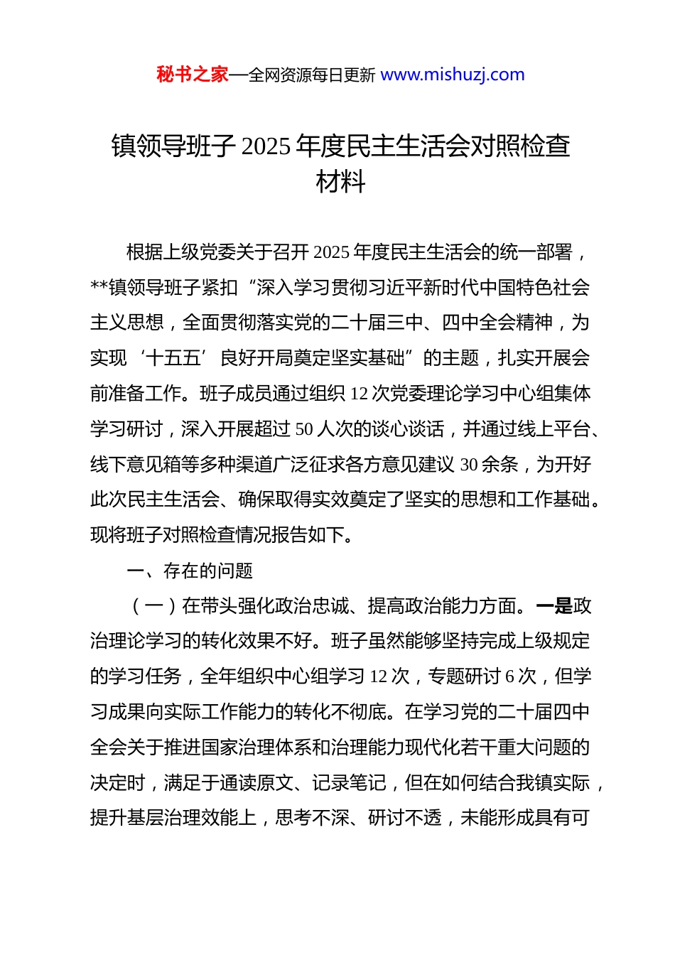 秘书之家—全网资源每日更新 www.mishuzj.com镇领导班子 2025 年度民主生活会对照检查材料 根据上级党委关于召开 2025 年度民主生活会的统一部署,**镇领导班子紧扣“深入学习贯彻习近平新时代中国特色社会主义思想,全面贯彻落实党的二十届三中、四中全会精神,为实现‘十五五’良好开局奠定坚实基础”的主题,扎实开展会前准备工作。班子成员通过组织 12 次党委理论学习中心组集体学习研讨,深入开展超过 50 人次的谈心谈话,并通过线上平台、线下意见箱等多种渠道广泛征求各方意见建议 30 余条,为开好此次民主生活会、确保取得实效奠定了坚实的思想和工作基础。现将班子对照检查情况报告如下。一、存在的问题(一)在带头强化政治忠诚、提高政治能力方面。一是政治理论学习的转化效果不好。班子虽然能够坚持完成上级规定的学习任务,全年组织中心组学习 12 次,专题研讨 6 次,但学习成果向实际工作能力的转化不彻底。在学习党的二十届四中全会关于推进国家治理体系和治理能力现代化若干重大问题的决定时,满足于通读原文、记录笔记,但在如何结合我镇实际,提升基层治理效能上,思考不深、研讨不透,未能形成具有可秘书之家—全网资源每日更新 www.mishuzj.com操作性的具体方案。导致在 2025 年推进的“数字乡村”治理平台建设工作中,因前期顶层设计与我镇村情民情结合不紧密,平台上线后群众使用率不足 30%,未能达到预期治理效果。二是贯彻落实上级决策部署的行动不快。在执行上级决策部署时,存在一定的观望心态和“等靠”思想,缺乏闻令而动、雷厉风行的果敢。例如,市委在 2025 年上半年部署了“闲置宅基地盘活利用”试点工作,要求各乡镇先行先试、摸索经验。班子在研究此项工作时,考虑到涉及产权、补偿等复杂问题,担心引发矛盾,决策过程较为犹豫,导致我镇的试点方案直到第三季度末才正式出台,比兄弟乡镇晚了近 4 个月,错失了争取上级政策和资金支持的最佳时机,影响了全镇发展大局。三是防范化解重大风险的意识不强。对新形势下各种风险挑战的认识不够深刻,底线思维树得不牢,对一些领域的潜在风险预判不足、应对不力。2025 年,国内部分地区发生了因环保项目“邻避效应”引发的群体性事件,但班子对此类风险的警惕性不高。在我镇规划建设一座日处理能力 50 吨的垃圾压缩转运站时,前期对周边群众的宣传解释和情绪疏导工作做得不扎实,仅召开了两场说明会,且参会代表覆盖面不全,最终在项目公示阶段,收到了超过 200 户居民的联名反对,致使项目被迫暂停,造成了工作上的被动。秘书之家—全网资源每日更新 www.mishuzj.com(二)在带头固本培元、增强党性方面。一是理想信念的淬炼锤炼不深。部分班子成员在长期和平环境和相对稳定的工作中,革命意志和奋斗精神有所消磨,共产党人精神追求的“钙”补得不及时、不充足。在面对 2025 年全镇财政收入增长乏力、可用财力紧张的困境时,个别同志表现出畏难情绪和消极心态,在班子会议上强调客观困难多,主观能动性发挥不够,缺乏“越是艰险越向前”的斗争锐气,没有拿出切实有效的开源节流、增收节支的硬措施。二是党性原则的自我约束不严。在严肃认真的党内政治生活锤炼上有所松懈,自我革命的精神弱化。部分班子成员以业务工作繁忙为由,全年参加所在党支部的组织生活会次数少于 6 次,没有完全做到以普通党员身份接受党组织的教育和监督。在开展批评和自我批评时,有时还存在“爱惜羽毛”的思想,对其他同志的批评点到为止,对自己的问题的剖析避重就轻,党内政治生活的“辣味”不足,没有真正起到红脸出汗、排毒治病的效果。三是党纪学习教育融入日常不够。虽然组织了对新修订的《中国共产党纪律处分条例》的专题学习,但未能真正做到内化于心、外化于行。在日常工作中,对党规党纪的敬畏之心体现不充分。例如,在 2025年一次公务接待中,负责同志对陪餐人数和接待标准把关不严,超出了规定人数 2 人,虽然金额不大,但反映出纪律意识这根秘书之家—全网资源每日更新 www.mishuzj.com弦绷得不紧,没有把遵规守纪的要求时时刻刻记在心上、落实到具体行动中。(三)在带头...