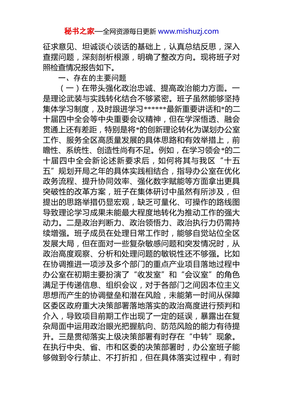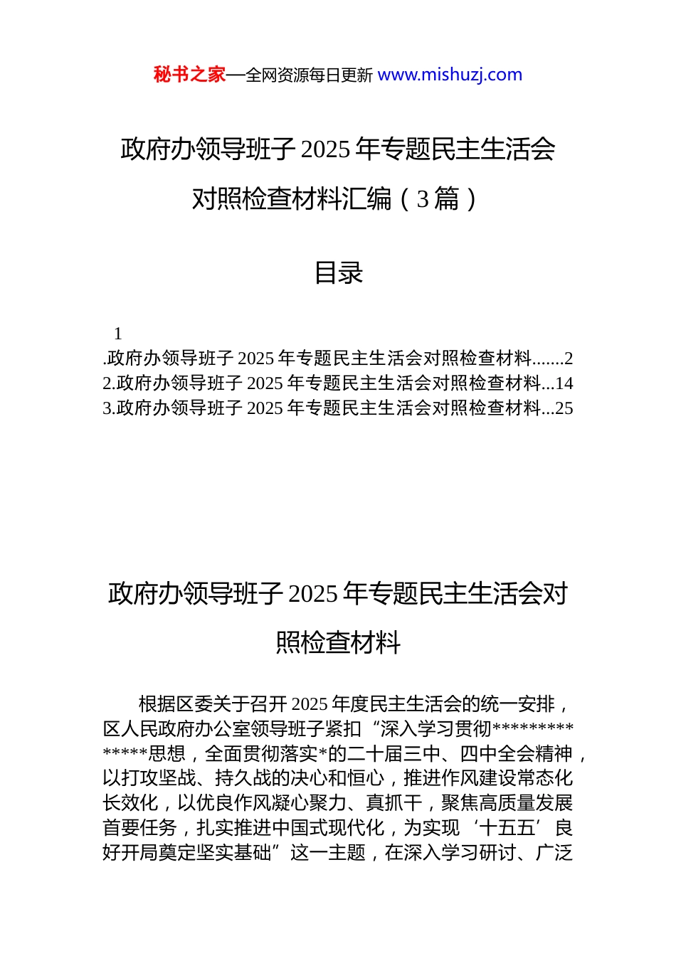 秘书之家—全网资源每日更新 www.mishuzj.com政府办领导班子 2025 年专题民主生活会对照检查材料汇编(3 篇)目录1.政府办领导班子 2025 年专题民主生活会对照检查材料.......22.政府办领导班子 2025 年专题民主生活会对照检查材料...143.政府办领导班子 2025 年专题民主生活会对照检查材料...25政府办领导班子 2025 年专题民主生活会对照检查材料根据区委关于召开 2025 年度民主生活会的统一安排,区人民政府办公室领导班子紧扣“深入学习贯彻**************思想,全面贯彻落实*的二十届三中、四中全会精神,以打攻坚战、持久战的决心和恒心,推进作风建设常态化长效化,以优良作风凝心聚力、真抓干,聚焦高质量发展首要任务,扎实推进中国式现代化,为实现‘十五五’良好开局奠定坚实基础”这一主题,在深入学习研讨、广泛秘书之家—全网资源每日更新 www.mishuzj.com征求意见、坦诚谈心谈话的基础上,认真总结反思,深入查摆问题,深刻剖析根源,明确了整改方向。现将班子对照检查情况报告如下。一、存在的主要问题(一)在带头强化政治忠诚、提高政治能力方面。一是理论武装与实践转化结合不够紧密。班子虽然能够坚持集体学习制度,及时跟进学习******最新重要讲话和*的二十届四中全会等中央重要会议精神,但在学深悟透、融会贯通上还有差距,特别是将*的创新理论转化为谋划办公室工作、服务全区高质量发展的具体思路和有效举措上,前瞻性、系统性、创造性尚有不足。例如,在学习领会*的二十届四中全会新论述新要求后,如何将其与我区“十五五”规划开局之年的具体实践相结合,指导办公室在优化政务流程、提升协同效率、强化数字赋能等方面拿出更具突破性的改革方案,班子在集体研讨中虽然有所涉及,但提出的思路举措仍显宏观,缺乏可量化、可操作的路线图导致理论学习成果未能最大程度地转化为推动工作的强大动力。二是政治判断力、政治领悟力、政治执行力仍需持续增强。班子成员在处理日常工作时,能够自觉站位全区发展大局,但在面对一些复杂敏感问题和突发情况时,从政治高度观察、分析和处理问题的敏锐性还不够强。比如在协调推进一项涉及多个部门的重点产业项目落地过程中办公室在初期主要扮演了“收发室”和“会议室”的角色满足于传递信息、组织会议,对于各部门之间因本位主义思想而产生的协调壁垒和潜在风险,未能第一时间从保障区委区政府重大决策部署落地落实的政治高度进行预判和介入,导致项目前期工作出现了一定的延误,暴露出在复杂局面中运用政治眼光把握航向、防范风险的能力有待提升。三是贯彻落实上级决策部署有时存在“中转”现象。在执行中央、省、市和区委的决策部署时,办公室班子能够做到令行禁止、不打折扣,但在具体落实过程中,有时秘书之家—全网资源每日更新 www.mishuzj.com满足于“发通知、转文件、提要求”,在结合我区实际、进行深度“二次加工”、制定更具针对性和操作性的实施细则方面用心用力不足。去年在推动一项优化营商环境的政策时,办公室虽然及时将上级文件转发至各相关单位,但未能牵头组织力量,针对我区企业反映强烈的一些堵点难点问题,深入研究制定符合 xx 实际的配套措施,导致政策的“最后一公里”未能完全打通,部分企业对政策的获得感不强。(二)在带头固本培元、增强*性方面。一是*性锤炼融入日常工作不够深入。班子成员能够自觉加强*性修养,但在纷繁复杂的日常事务中,有时存在“重业务、轻 dj”的倾向,未能时刻将*性锻炼贯穿于处理每一项工作、解决每一个问题的全过程。在面对急难险重任务时,虽然能够迎难而上,但偶尔也会滋生畏难发愁、急躁焦虑的情绪。例如,在去年汛期应对突发强降雨过程中,办公室承担着大量的统筹协调和信息报送工作,面对巨大的工作压力和紧迫的时间要求,个别班子成员在与基层单位沟通时语气较为生硬,虽然是出于工作急切的公心,但也反映出在极限考验下,运用*性原则修身律己、保持平和心态的修为尚有不足。二是*内政治生活“辣味”尚显不足。虽然能够严格执行“三会一课”、民主生活会、组织生活会等制度,但在开展批评与自我批评时,有时还存在“你好我好大家好”的...