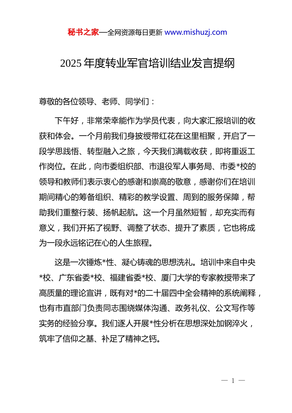 秘书之家—全网资源每日更新 www.mishuzj.com2025 年度转业军官培训结业发言提纲尊敬的各位领导、老师、同学们:下午好,非常荣幸能作为学员代表,向大家汇报培训的收获和体会。一个月前我们身披绶带红花在这里相聚,开启了一段学思践悟、转型融入之旅,今天我们满载收获,即将重返工作岗位。在此,向市委组织部、市退役军人事务局、市委*校的领导和教师们表示衷心的感谢和崇高的敬意,感谢你们在培训期间精心的筹备组织、精彩的教学设置、周到的服务保障,帮助我们重整行装、扬帆起航。这一个月虽然短暂,却充实而有意义,我们开拓了视野、调整了状态、提升了素质,它也将成为一段永远铭记在心的人生旅程。这是一次锤炼*性、凝心铸魂的思想洗礼。培训中来自中央*校、广东省委*校、福建省委*校、厦门大学的专家教授带来了高质量的理论宣讲,既有对*的二十届四中全会精神的系统阐释,也有市直部门负责同志围绕媒体沟通、政务礼仪、公文写作等实务的经验分享。我们逐人开展*性分析在思想深处加钢淬火,筑牢了信仰之基、补足了精神之钙。— 1 —秘书之家—全网资源每日更新 www.mishuzj.com这是一次开拓视野、充电蓄能的见学之旅。在大亚湾石化园区,我们为江州高质量发展的成就倍感自豪;在谷文昌干部学院,我们将谷公“心中有*、心中有民、心中有责、心中有戒”的初心与担当扎根心底;在福建,我们沿着***走过的闽山闽水,调研澳角村蓝碳经济、石铺村文明乡风经验,为江州改革发展寻觅他山之石。在“四下基层”实践中,我们的足迹遍及村镇,访谈驻村干部、走访扶贫产业、参加义务劳动,沉淀了助力乡村振兴的思考。这是一次交流沟通、互学互鉴的思维启迪。有全市优秀专业军官代表为我们传经解惑,大家畅所欲言军转干部怎样适应地方工作。深入研讨“红树林生态保护修复”,加深了对江州发展定位、机遇挑战的深刻认识。在自我推介、分享经历、交流体会中我慢慢调整心态、重塑自我,也和大家结成了深厚的友谊。下一步,我们将以本次培训为启点,将思想伟力转化为实干担当,将培训收获落实到具体行动,切实做好培训“下半篇文章”。一是在深学深悟上下功夫。坚持做到学与思相结合、学与用相结合、学与创相结合,立足岗位、终生学习、不断提高。二是在真抓实干上求实效。把干事创业作为一种精神境界— 2 —秘书之家—全网资源每日更新 www.mishuzj.com和工作追求,以谦虚、谨慎、务实的工作态度,在新的岗位上再创佳绩。三是在自警自省中强*性。时刻牢记培训中重温的初心使命,践行正确政绩观,将执政为民、服务群众作为一切工作的出发点和落脚点。毕业不是结束,而是新的开始。一朝从军终赤诚,不坠今生青云志!祝愿同学们满载着培训收获回归岗位,在今后的人生道路上开创新局面、干出新业绩、取得新进步,充分展现我们退役军人的责任、担当与荣耀,贡献军转力量!— 3 —