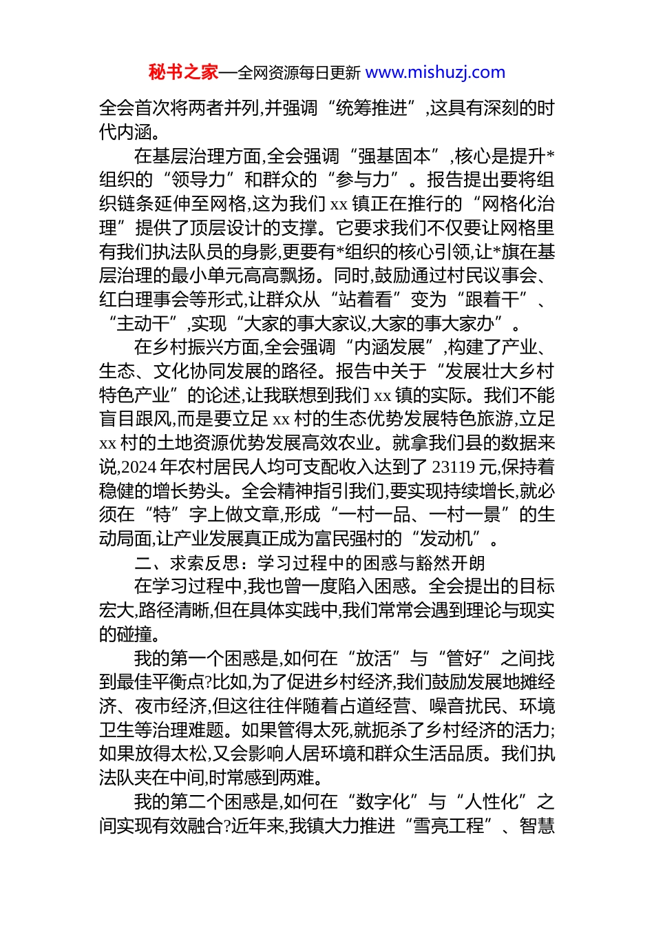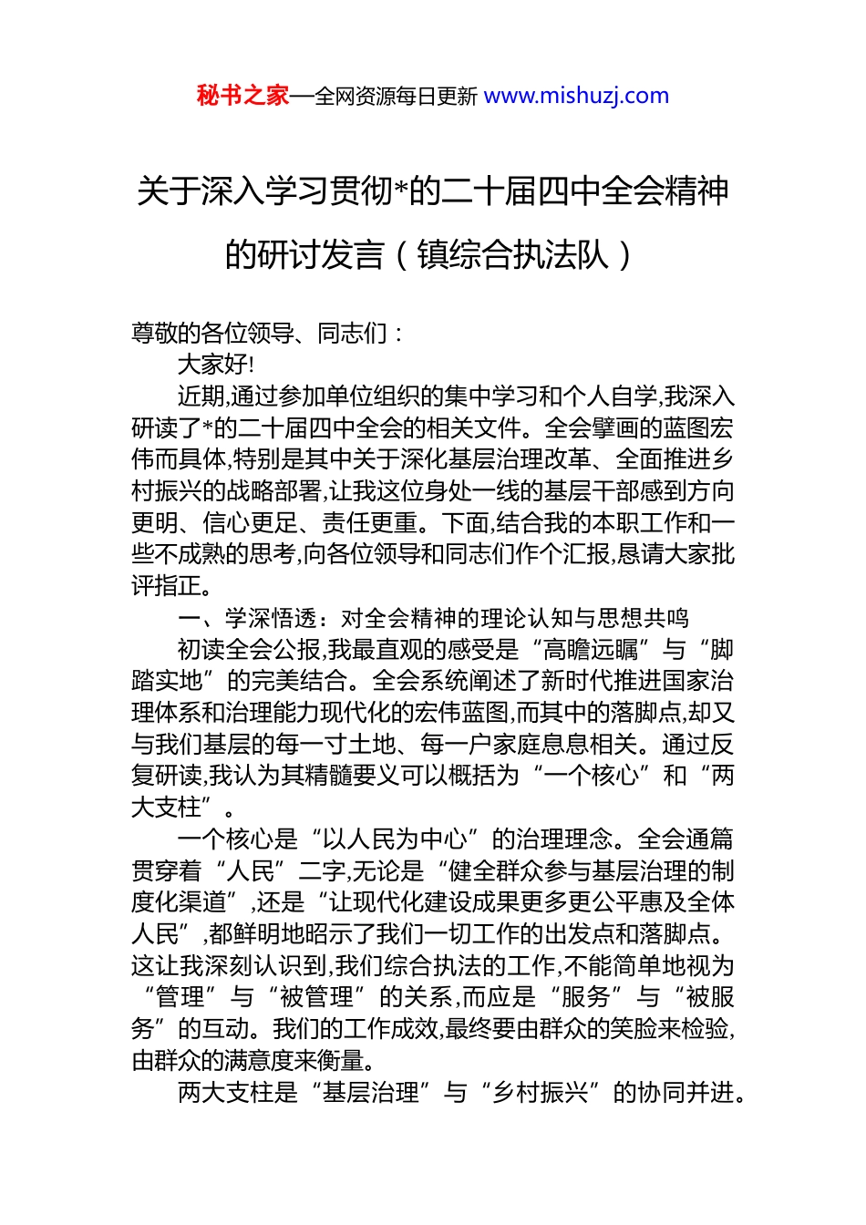 秘书之家—全网资源每日更新 www.mishuzj.com关于深入学习贯彻*的二十届四中全会精神的研讨发言(镇综合执法队)尊敬的各位领导、同志们:大家好!近期,通过参加单位组织的集中学习和个人自学,我深入研读了*的二十届四中全会的相关文件。全会擘画的蓝图宏伟而具体,特别是其中关于深化基层治理改革、全面推进乡村振兴的战略部署,让我这位身处一线的基层干部感到方向更明、信心更足、责任更重。下面,结合我的本职工作和一些不成熟的思考,向各位领导和同志们作个汇报,恳请大家批评指正。一、学深悟透:对全会精神的理论认知与思想共鸣初读全会公报,我最直观的感受是“高瞻远瞩”与“脚踏实地”的完美结合。全会系统阐述了新时代推进国家治理体系和治理能力现代化的宏伟蓝图,而其中的落脚点,却又与我们基层的每一寸土地、每一户家庭息息相关。通过反复研读,我认为其精髓要义可以概括为“一个核心”和“两大支柱”。一个核心是“以人民为中心”的治理理念。全会通篇贯穿着“人民”二字,无论是“健全群众参与基层治理的制度化渠道”,还是“让现代化建设成果更多更公平惠及全体人民”,都鲜明地昭示了我们一切工作的出发点和落脚点。这让我深刻认识到,我们综合执法的工作,不能简单地视为“管理”与“被管理”的关系,而应是“服务”与“被服务”的互动。我们的工作成效,最终要由群众的笑脸来检验,由群众的满意度来衡量。两大支柱是“基层治理”与“乡村振兴”的协同并进。秘书之家—全网资源每日更新 www.mishuzj.com全会首次将两者并列,并强调“统筹推进”,这具有深刻的时代内涵。在基层治理方面,全会强调“强基固本”,核心是提升*组织的“领导力”和群众的“参与力”。报告提出要将组织链条延伸至网格,这为我们 xx 镇正在推行的“网格化治理”提供了顶层设计的支撑。它要求我们不仅要让网格里有我们执法队员的身影,更要有*组织的核心引领,让*旗在基层治理的最小单元高高飘扬。同时,鼓励通过村民议事会、红白理事会等形式,让群众从“站着看”变为“跟着干”、“主动干”,实现“大家的事大家议,大家的事大家办”。在乡村振兴方面,全会强调“内涵发展”,构建了产业、生态、文化协同发展的路径。报告中关于“发展壮大乡村特色产业”的论述,让我联想到我们 xx 镇的实际。我们不能盲目跟风,而是要立足 xx 村的生态优势发展特色旅游,立足xx 村的土地资源优势发展高效农业。就拿我们县的数据来说,2024 年农村居民人均可支配收入达到了 23119 元,保持着稳健的增长势头。全会精神指引我们,要实现持续增长,就必须在“特”字上做文章,形成“一村一品、一村一景”的生动局面,让产业发展真正成为富民强村的“发动机”。二、求索反思:学习过程中的困惑与豁然开朗在学习过程中,我也曾一度陷入困惑。全会提出的目标宏大,路径清晰,但在具体实践中,我们常常会遇到理论与现实的碰撞。我的第一个困惑是,如何在“放活”与“管好”之间找到最佳平衡点?比如,为了促进乡村经济,我们鼓励发展地摊经济、夜市经济,但这往往伴随着占道经营、噪音扰民、环境卫生等治理难题。如果管得太死,就扼杀了乡村经济的活力;如果放得太松,又会影响人居环境和群众生活品质。我们执法队夹在中间,时常感到两难。我的第二个困惑是,如何在“数字化”与“人性化”之间实现有效融合?近年来,我镇大力推进“雪亮工程”、智慧秘书之家—全网资源每日更新 www.mishuzj.com社区等数字化治理手段,通过 ai 识别算法等技术,大大提升了监管效率。但我也在工作中发现,一些老年村民不会使用智能手机,无法通过 app 反映问题或享受便捷服务,数字化的“快车”似乎把他们甩在了后面。冰冷的摄像头和数据,如何才能拥有服务群众的“温度”?带着这些困惑,我重新回到全会精神中去寻找答案。我发现,答案其实就在“系统观念”和“人民至上”这八个字里。对于第一个困惑,全会强调“共建共治共享”,这启发我,执法队不能唱“独角戏”,而应搭建平台,引导商户、居民、村委会等多方主体共同参与制定管理规约,通过“柔性执法”和“说理式执法”,在发展与规范中寻求最大公约数。对于第二个困惑,“人民至上”提醒我们,技术是工具,不是目的。推广数字化治...
