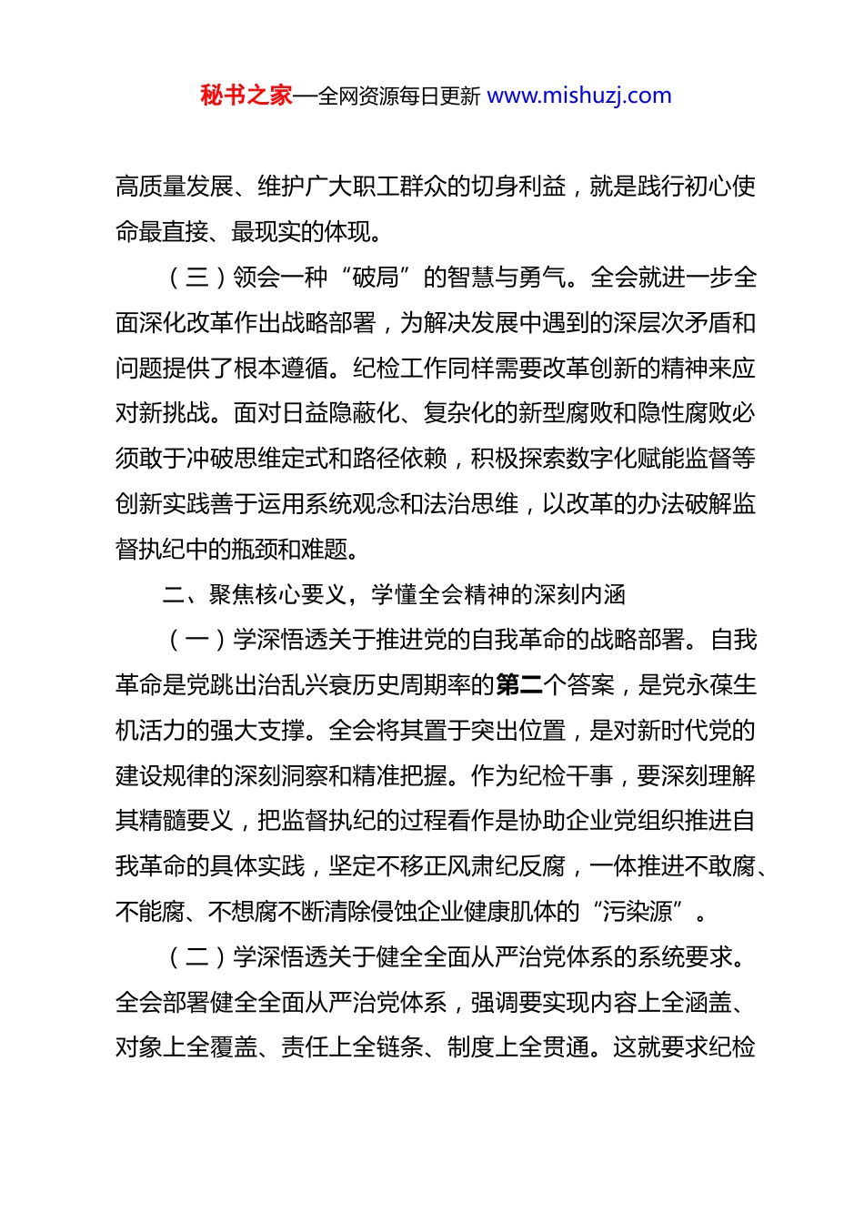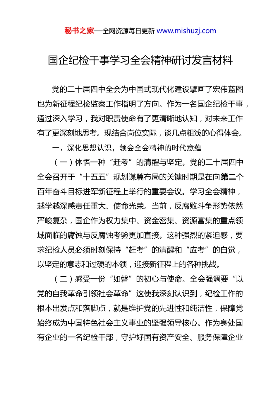 秘书之家—全网资源每日更新 www.mishuzj.com国企纪检干事学习全会精神研讨发言材料 党的二十届四中全会为中国式现代化建设擘画了宏伟蓝图也为新征程纪检监察工作指明了方向。作为一名国企纪检干事,通过深入学习,我对职责使命有了更清晰地认知,对未来工作有了更深刻地思考。现结合岗位实际,谈几点粗浅的心得体会。一、深化思想认识,领会全会精神的时代意蕴(一)体悟一种“赶考”的清醒与坚定。党的二十届四中全会召开于“十五五”规划谋篇布局的关键时期是在向第二个百年奋斗目标进军新征程上举行的重要会议。学习全会精神,越学越深感责任重大、使命光荣。当前,反腐败斗争形势依然严峻复杂,国企作为权力集中、资金密集、资源富集的重点领域面临的腐蚀与反腐蚀考验更加直接。这种强烈的紧迫感,要求纪检人员必须时刻保持“赶考”的清醒和“应考”的自觉,以坚定的意志和过硬的本领,迎接新征程上的各种挑战。(二)感受一份“如磐”的初心与使命。全会强调要“以党的自我革命引领社会革命”这使我深刻认识到,纪检工作的根本出发点和落脚点,就是维护党的先进性和纯洁性,保障党始终成为中国特色社会主义事业的坚强领导核心。作为身处国有企业的一名纪检干部,守护好国有资产安全、服务保障企业秘书之家—全网资源每日更新 www.mishuzj.com高质量发展、维护广大职工群众的切身利益,就是践行初心使命最直接、最现实的体现。(三)领会一种“破局”的智慧与勇气。全会就进一步全面深化改革作出战略部署,为解决发展中遇到的深层次矛盾和问题提供了根本遵循。纪检工作同样需要改革创新的精神来应对新挑战。面对日益隐蔽化、复杂化的新型腐败和隐性腐败必须敢于冲破思维定式和路径依赖,积极探索数字化赋能监督等创新实践善于运用系统观念和法治思维,以改革的办法破解监督执纪中的瓶颈和难题。二、聚焦核心要义,学懂全会精神的深刻内涵(一)学深悟透关于推进党的自我革命的战略部署。自我革命是党跳出治乱兴衰历史周期率的第二个答案,是党永葆生机活力的强大支撑。全会将其置于突出位置,是对新时代党的建设规律的深刻洞察和精准把握。作为纪检干事,要深刻理解其精髓要义,把监督执纪的过程看作是协助企业党组织推进自我革命的具体实践,坚定不移正风肃纪反腐,一体推进不敢腐、不能腐、不想腐不断清除侵蚀企业健康肌体的“污染源”。(二)学深悟透关于健全全面从严治党体系的系统要求。全会部署健全全面从严治党体系,强调要实现内容上全涵盖、对象上全覆盖、责任上全链条、制度上全贯通。这就要求纪检秘书之家—全网资源每日更新 www.mishuzj.com工作不能满足于查办个案、就事论事,必须坚持系统观念,注重标本兼治。要推动党内监督与其他各类监督贯通协同,将监督融入企业治理的各个方面和全部流程,努力实现“查处一案、警示一片、治理一域”的综合效果。(三)学深悟透关于服务保障高质量发展的实践路径。全会擘画的“十五五”规划,其核心目标就是推动高质量发展。纪检工作作为企业发展的“护航员”,必须紧紧围绕这个中心任务来谋划和展开。要通过做实做细政治监督,确保党中央关于国资国企改革发展的最新战略部署在企业不折不扣落实到位。通过精准有效的监督执纪,为企业深化改革、创新发展清除障碍、加油鼓劲,持续营造风清气正的政治生态和干事创业的发展环境。三、勇于担当作为,践行全会精神的实践要求(一)在强化政治监督上做到精准有力。要将学习成果转化为推动工作的具体措施和实际成效。紧盯企业采购招标、项目投资、选人用人等关键环节和重点岗位,对有令不行、有禁不止,搞变通、打折扣等违背政治纪律和政治规矩的人和事,坚决亮剑、严肃查处,以精准有力的监督保障全会精神在企业落地生根,确保企业发展始终沿着正确的政治方向前进。(二)在提升履职能力上做到规范专业。全会对干部队伍秘书之家—全网资源每日更新 www.mishuzj.com建设提出了新的更高要求。2025 年恰逢“纪检监察工作规范化法治化正规化建设年”,要以此为契机,带头学习《中国共产党纪律处分条例》《国有企业管理人员处分条例》等党纪国法,不断强化法治意识、程序意识和证...