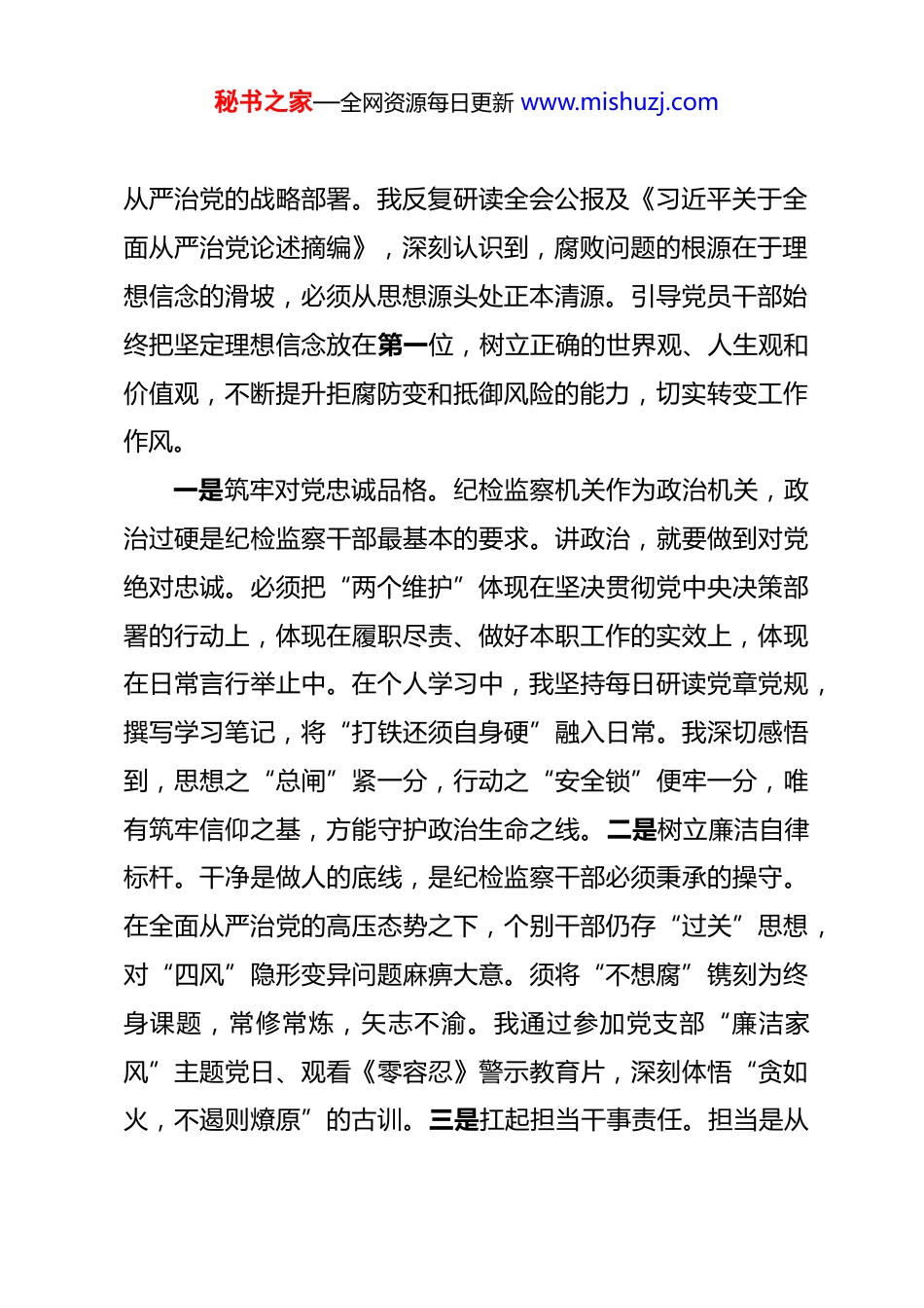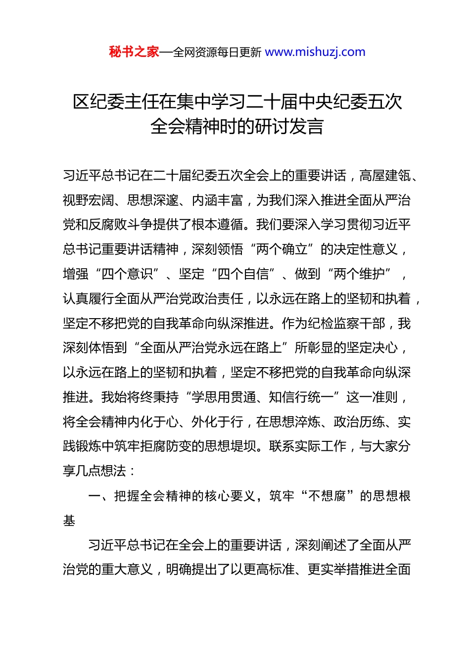 秘书之家—全网资源每日更新 www.mishuzj.com区纪委主任在集中学习二十届中央纪委五次全会精神时的研讨发言 习近平总书记在二十届纪委五次全会上的重要讲话,高屋建瓴、视野宏阔、思想深邃、内涵丰富,为我们深入推进全面从严治党和反腐败斗争提供了根本遵循。我们要深入学习贯彻习近平总书记重要讲话精神,深刻领悟“两个确立”的决定性意义,增强“四个意识”、坚定“四个自信”、做到“两个维护”,认真履行全面从严治党政治责任,以永远在路上的坚韧和执着,坚定不移把党的自我革命向纵深推进。作为纪检监察干部,我深刻体悟到“全面从严治党永远在路上”所彰显的坚定决心,以永远在路上的坚韧和执着,坚定不移把党的自我革命向纵深推进。我始将终秉持“学思用贯通、知信行统一”这一准则,将全会精神内化于心、外化于行,在思想淬炼、政治历练、实践锻炼中筑牢拒腐防变的思想堤坝。联系实际工作,与大家分享几点想法:一、把握全会精神的核心要义,筑牢“不想腐”的思想根基习近平总书记在全会上的重要讲话,深刻阐述了全面从严治党的重大意义,明确提出了以更高标准、更实举措推进全面秘书之家—全网资源每日更新 www.mishuzj.com从严治党的战略部署。我反复研读全会公报及《习近平关于全面从严治党论述摘编》,深刻认识到,腐败问题的根源在于理想信念的滑坡,必须从思想源头处正本清源。引导党员干部始终把坚定理想信念放在第一位,树立正确的世界观、人生观和价值观,不断提升拒腐防变和抵御风险的能力,切实转变工作作风。一是筑牢对党忠诚品格。纪检监察机关作为政治机关,政治过硬是纪检监察干部最基本的要求。讲政治,就要做到对党绝对忠诚。必须把“两个维护”体现在坚决贯彻党中央决策部署的行动上,体现在履职尽责、做好本职工作的实效上,体现在日常言行举止中。在个人学习中,我坚持每日研读党章党规,撰写学习笔记,将“打铁还须自身硬”融入日常。我深切感悟到,思想之“总闸”紧一分,行动之“安全锁”便牢一分,唯有筑牢信仰之基,方能守护政治生命之线。二是树立廉洁自律标杆。干净是做人的底线,是纪检监察干部必须秉承的操守。在全面从严治党的高压态势之下,个别干部仍存“过关”思想,对“四风”隐形变异问题麻痹大意。须将“不想腐”镌刻为终身课题,常修常炼,矢志不渝。我通过参加党支部“廉洁家风”主题党日、观看《零容忍》警示教育片,深刻体悟“贪如火,不遏则燎原”的古训。三是扛起担当干事责任。担当是从秘书之家—全网资源每日更新 www.mishuzj.com政准则,是纪检监察干部成事之要。担当,就要责任和本领过硬,我始终把使命放在心上,把责任扛在肩上,在敢于担当中历练提高。在勇于担当的实际行动中坚定理想信念,立足本职岗位做好该做的事情,遇事不推诿、不退避,面对大是大非敢于亮剑,面对矛盾敢于迎难而上,面对危险敢于挺身而出,面对失误敢于承担责任,面对歪风邪气敢于坚决斗争。二、明确三个“更加”的实施路径,扎紧“不能腐”的制度笼子习近平总书记在全会讲话中提出了三个“更加”的重要要求,为全面从严治党指明了方向。三个“更加”的强调是在关键历史节点上的一次总动员,既刀刃向内解决突出问题,又着眼长远健全机制。这要求各级领导干部不仅要有高度的政治自觉和执行力,还要具备高超的治理智慧和专业能力。唯有如此,才能使三个“更加”真正更好的转化推动经济社会高质量发展,增进人民福祉的生动实践和扎实成果,确保中央的决策部署落地生根,枝繁叶茂,硕果累累。结合纪检监察工作来说,把权力关进制度笼子,关键在于构建“决策科学、执行坚决、监督有力”的权力运行机制,让权力在阳光下运行。一是完善决策制度。严格执行“三重一大”决策制度,重大事项由领导班子集体研究决定,防止个人秘书之家—全网资源每日更新 www.mishuzj.com专断和“一言堂”。针对工程建设、物资采购、资金使用等权力集中的领域,强化权力运行全过程留痕管理,推动重大事项决策全流程公开。要持续完善法规制度体系,堵住权力运行的监管盲区。坚持制度面前人人平等,对“闯红灯”“翻栅栏”的行为严肃查处,不搞特权、不设例外。唯有制度...
