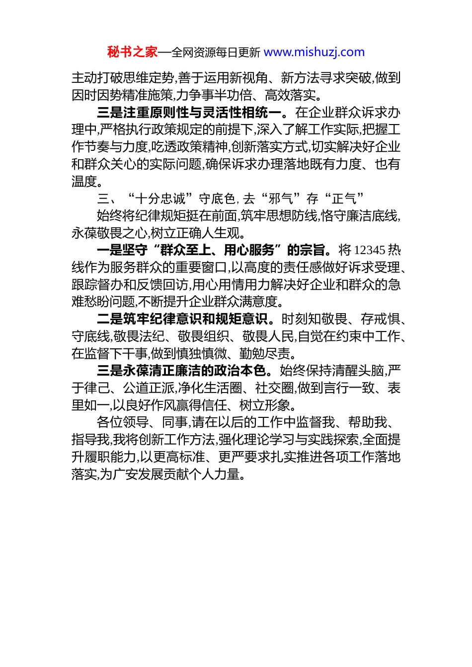 秘书之家—全网资源每日更新 www.mishuzj.com以执着砺心 以智慧促行 以忠诚履职——市市民工作服务中心衷心感谢组织的信任与关怀,也由衷感谢各位领导、同事一直以来对我的指导、帮助与支持。本次职务晋升,对我而言既是鼓励,也是责任,更是鞭策,今后的工作中,我将以此为新的起点,主要做到以下三个方面。一、“三分执着”砺心性,去“骄气”存“谦气”始终保持谦逊好学、脚踏实地的工作态度,视能力不足为最大危机,甘当“小学生”,以勤补拙、以恒促能。一是政治能力要过硬。始终把讲政治、守规矩摆在首位,不断提高政治判断力、政治领悟力、政治执行力,坚决服从组织安排,确保各项工作方向不偏、落实有力。二是专业知识要精通。主动参加各类培训学习,努力成为懂政策、懂业务、懂基层、懂服务、懂创新的实干型干部,尤其要加强对营商环境、社会保障、政务服务等领域新政策、新要求的学习研究,深化理解把握,并以此推动 12345热线服务理念与机制创新。三是综合素质要提高。时刻保持“本领恐慌”,主动向先进科室、岗位标兵看齐,学习他们处理复杂问题、推动工作落实的有效方法,着力提升协调解难、高效办事的能力。二、“五分智慧”促作为,去“莽气”存“灵气”在工作中自觉践行“踏实肯干、埋头苦干、科学巧干、真抓实干”的精神,既要保持干劲,更要注重方法、提升效能。一是强化系统思维,做到谋划在前。开展工作前注重整体规划和阶段性部署,明确目标任务与关键环节,做到胸中有全局、手中有重点,从源头上提升工作的条理性和协调性。二是坚持思路清晰、灵活应变。面对新情况、新问题,秘书之家—全网资源每日更新 www.mishuzj.com主动打破思维定势,善于运用新视角、新方法寻求突破,做到因时因势精准施策,力争事半功倍、高效落实。三是注重原则性与灵活性相统一。在企业群众诉求办理中,严格执行政策规定的前提下,深入了解工作实际,把握工作节奏与力度,吃透政策精神,创新落实方式,切实解决好企业和群众关心的实际问题,确保诉求办理落地既有力度、也有温度。三、“十分忠诚”守底色,去“邪气”存“正气”始终将纪律规矩挺在前面,筑牢思想防线,恪守廉洁底线,永葆敬畏之心,树立正确人生观。一是坚守“群众至上、用心服务”的宗旨。将 12345 热线作为服务群众的重要窗口,以高度的责任感做好诉求受理、跟踪督办和反馈回访,用心用情用力解决好企业和群众的急难愁盼问题,不断提升企业群众满意度。二是筑牢纪律意识和规矩意识。时刻知敬畏、存戒惧、守底线,敬畏法纪、敬畏组织、敬畏人民,自觉在约束中工作、在监督下干事,做到慎独慎微、勤勉尽责。三是永葆清正廉洁的政治本色。始终保持清醒头脑,严于律己、公道正派,净化生活圈、社交圈,做到言行一致、表里如一,以良好作风赢得信任、树立形象。各位领导、同事,请在以后的工作中监督我、帮助我、指导我,我将创新工作方法,强化理论学习与实践探索,全面提升履职能力,以更高标准、更严要求扎实推进各项工作落地落实,为广安发展贡献个人力量。