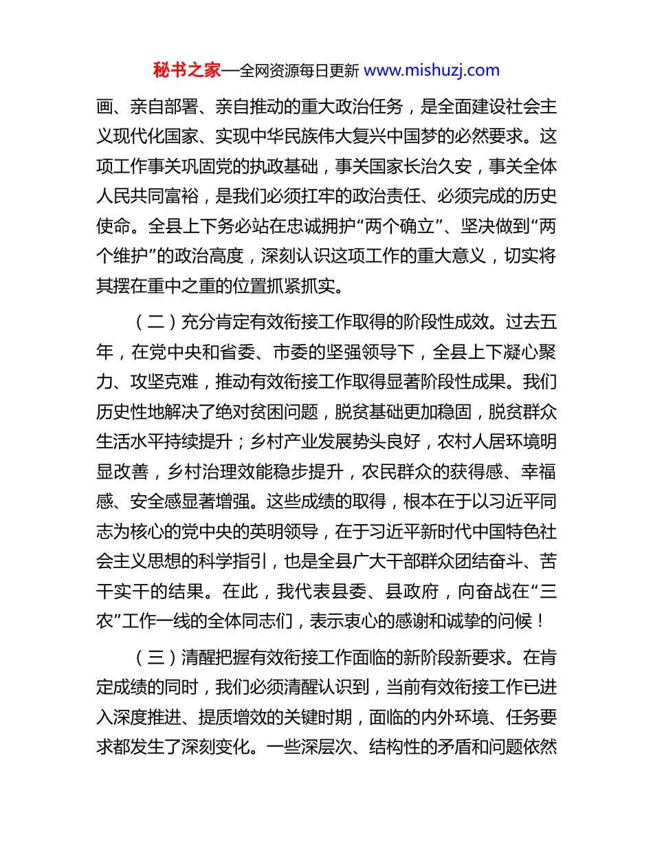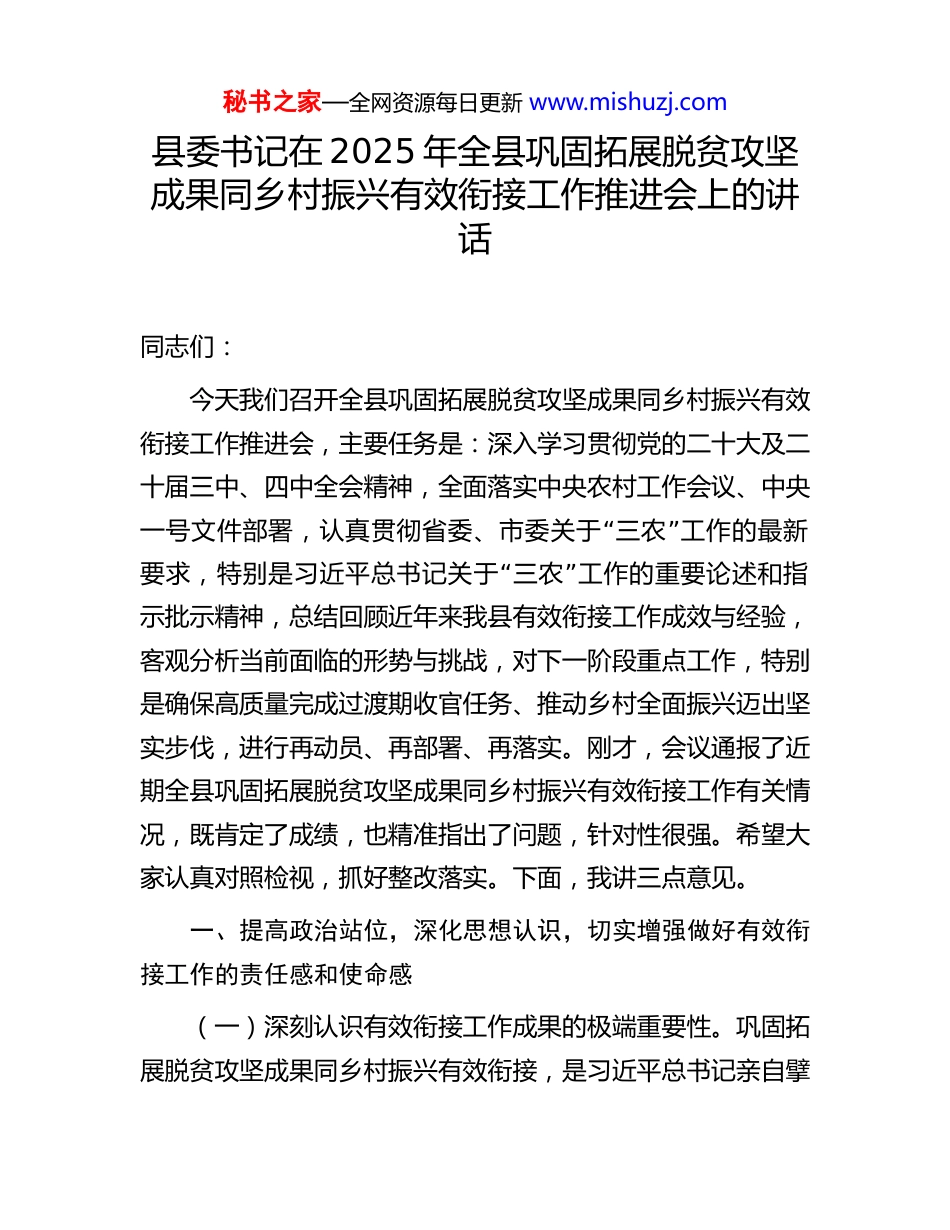 秘书之家—全网资源每日更新 www.mishuzj.com县委书记在 2025 年全县巩固拓展脱贫攻坚成果同乡村振兴有效衔接工作推进会上的讲话同志们:今天我们召开全县巩固拓展脱贫攻坚成果同乡村振兴有效衔接工作推进会,主要任务是:深入学习贯彻党的二十大及二十届三中、四中全会精神,全面落实中央农村工作会议、中央“”一号文件部署,认真贯彻省委、市委关于 三农 工作的最新“”要求,特别是习近平总书记关于 三农 工作的重要论述和指示批示精神,总结回顾近年来我县有效衔接工作成效与经验,客观分析当前面临的形势与挑战,对下一阶段重点工作,特别是确保高质量完成过渡期收官任务、推动乡村全面振兴迈出坚实步伐,进行再动员、再部署、再落实。刚才,会议通报了近期全县巩固拓展脱贫攻坚成果同乡村振兴有效衔接工作有关情况,既肯定了成绩,也精准指出了问题,针对性很强。希望大家认真对照检视,抓好整改落实。下面,我讲三点意见。一、提高政治站位,深化思想认识,切实增强做好有效衔接工作的责任感和使命感(一)深刻认识有效衔接工作成果的极端重要性。巩固拓展脱贫攻坚成果同乡村振兴有效衔接,是习近平总书记亲自擘秘书之家—全网资源每日更新 www.mishuzj.com画、亲自部署、亲自推动的重大政治任务,是全面建设社会主义现代化国家、实现中华民族伟大复兴中国梦的必然要求。这项工作事关巩固党的执政基础,事关国家长治久安,事关全体人民共同富裕,是我们必须扛牢的政治责任、必须完成的历史“”“使命。全县上下务必站在忠诚拥护 两个确立 、坚决做到 两”个维护 的政治高度,深刻认识这项工作的重大意义,切实将其摆在重中之重的位置抓紧抓实。(二)充分肯定有效衔接工作取得的阶段性成效。过去五年,在党中央和省委、市委的坚强领导下,全县上下凝心聚力、攻坚克难,推动有效衔接工作取得显著阶段性成果。我们历史性地解决了绝对贫困问题,脱贫基础更加稳固,脱贫群众生活水平持续提升;乡村产业发展势头良好,农村人居环境明显改善,乡村治理效能稳步提升,农民群众的获得感、幸福感、安全感显著增强。这些成绩的取得,根本在于以习近平同志为核心的党中央的英明领导,在于习近平新时代中国特色社会主义思想的科学指引,也是全县广大干部群众团结奋斗、苦“干实干的结果。在此,我代表县委、县政府,向奋战在 三”农 工作一线的全体同志们,表示衷心的感谢和诚挚的问候!(三)清醒把握有效衔接工作面临的新阶段新要求。在肯定成绩的同时,我们必须清醒认识到,当前有效衔接工作已进入深度推进、提质增效的关键时期,面临的内外环境、任务要求都发生了深刻变化。一些深层次、结构性的矛盾和问题依然秘书之家—全网资源每日更新 www.mishuzj.com突出,工作中还存在不少短板弱项。我们决不能有丝毫松劲懈怠、喘口气歇歇脚的想法,必须进一步增强紧迫感、责任感,以更高的标准、更实的举措、更硬的作风,推动有效衔接工作不断走深走实。二、坚持问题导向,精准研判形势,清醒认识有效衔接工作面临的挑战与短板(一)防返贫致贫风险依然不容忽视。虽然我们建立了防止返贫动态监测和帮扶机制,但部分脱贫户和监测对象发展基础仍然薄弱,自我发展能力不足,抵御风险能力不强。当前经济面临下行压力,部分脱贫劳动力稳岗就业存在困难,就业帮扶的稳定性和质量有待提升。一些产业帮扶项目受市场波动、技术支撑、经营管理等因素影响,效益不够稳定,带动脱贫群众持续增收的后劲有待增强。因病、因学、因灾等返贫致贫风险点依然存在,监测预警和快速响应机制需要进一步优化。(二)乡村产业振兴基础尚不牢固。部分乡村产业存在规模偏小、布局分散、链条较短等问题,特色优势不够鲜明,市场竞争力不强。农产品加工转化率总体不高,精深加工不足,品牌建设滞后,产品附加值有待挖掘提升。农村一二三产业融合发展不够深入,新产业新业态新模式培育发展相对缓慢,对县域经济发展的支撑作用有待加强。产业发展面临的要素制约依然明显,在土地保障、资金投入、技术人才引进等方面还存秘书之家—全网资源每日更新 www.mishuzj.com在瓶颈。(三)农村基础设施和公共服务存...
