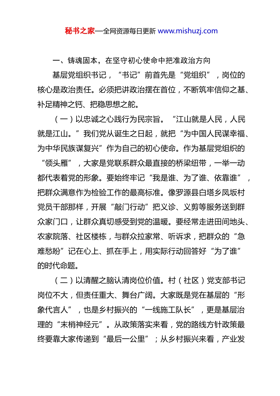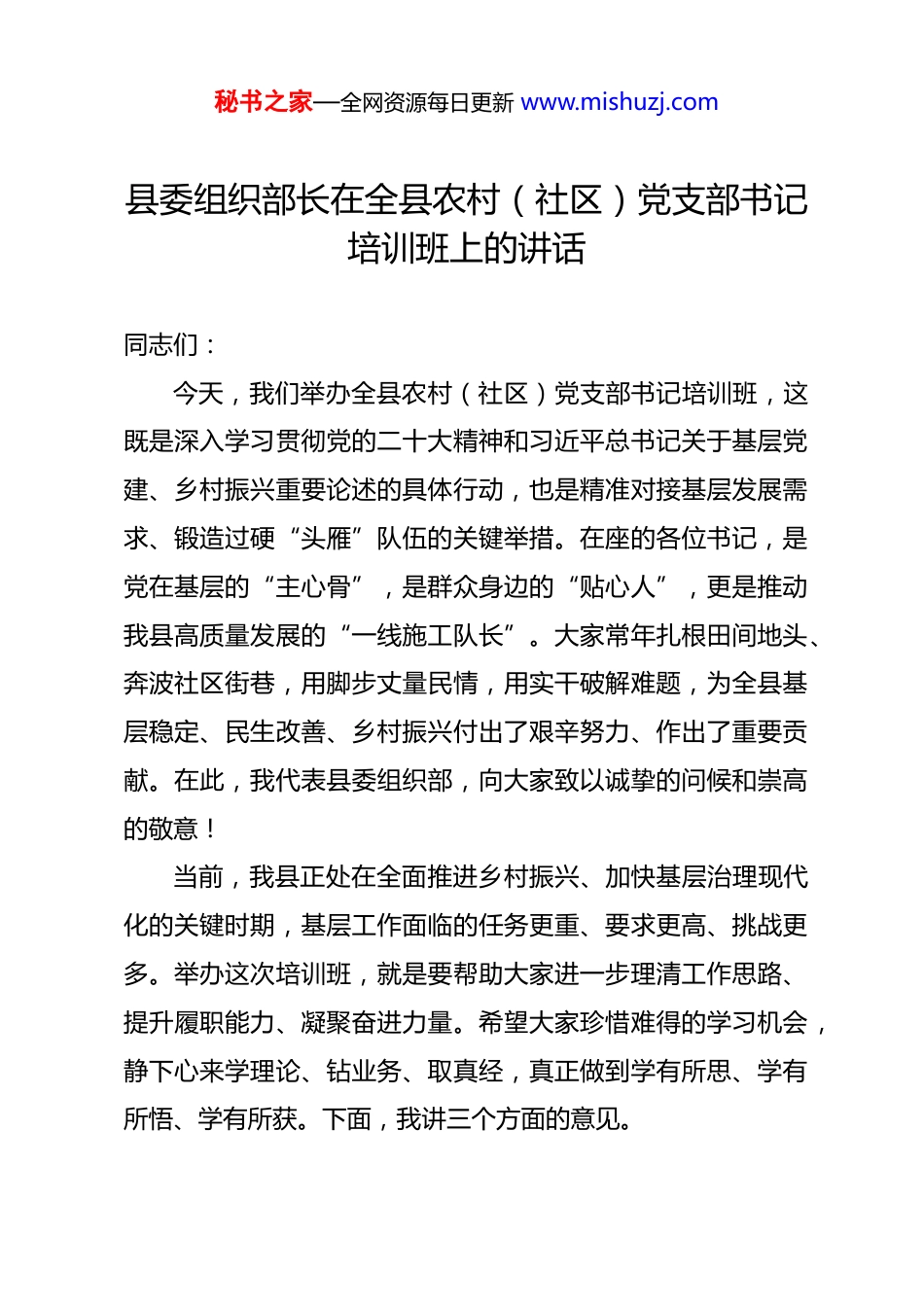 秘书之家—全网资源每日更新 www.mishuzj.com县委组织部长在全县农村(社区)党支部书记培训班上的讲话 同志们:今天,我们举办全县农村(社区)党支部书记培训班,这既是深入学习贯彻党的二十大精神和习近平总书记关于基层党建、乡村振兴重要论述的具体行动,也是精准对接基层发展需求、锻造过硬“头雁”队伍的关键举措。在座的各位书记,是党在基层的“主心骨”,是群众身边的“贴心人”,更是推动我县高质量发展的“一线施工队长”。大家常年扎根田间地头、奔波社区街巷,用脚步丈量民情,用实干破解难题,为全县基层稳定、民生改善、乡村振兴付出了艰辛努力、作出了重要贡献。在此,我代表县委组织部,向大家致以诚挚的问候和崇高的敬意!当前,我县正处在全面推进乡村振兴、加快基层治理现代化的关键时期,基层工作面临的任务更重、要求更高、挑战更多。举办这次培训班,就是要帮助大家进一步理清工作思路、提升履职能力、凝聚奋进力量。希望大家珍惜难得的学习机会,静下心来学理论、钻业务、取真经,真正做到学有所思、学有所悟、学有所获。下面,我讲三个方面的意见。秘书之家—全网资源每日更新 www.mishuzj.com一、铸魂固本,在坚守初心使命中把准政治方向基层党组织书记,“书记”前首先是“党组织”,岗位的核心是政治责任。必须把讲政治摆在首位,不断筑牢信仰之基、补足精神之钙、把稳思想之舵。(一)以忠诚之心践行为民宗旨。“江山就是人民,人民就是江山。”我们党从诞生之日起,就把“为中国人民谋幸福、为中华民族谋复兴”作为自己的初心使命。作为基层党组织的“领头雁”,大家是党联系群众最直接的桥梁纽带,一举一动都代表着党的形象。要始终牢记“我是谁、为了谁、依靠谁”,把群众满意作为检验工作的最高标准。像罗源县白塔乡凤坂村党员干部那样,开展“敲门行动”把义诊、义剪等服务送到群众家门口,让群众真切感受到党的温暖。要经常走进田间地头、农家院落、社区楼栋,与群众拉家常、听诉求,把群众的“急难愁盼”记在心上、抓在手上,用实际行动回答好“为了谁”的时代命题。(二)以清醒之脑认清岗位价值。村(社区)党支部书记岗位不大,但责任重大、舞台广阔。大家既是党在基层的“形象代言人”,也是乡村振兴的“一线施工队长”,更是基层治理的“末梢神经元”。从政策落实来看,党的路线方针政策最终要靠大家传递到“最后一公里”;从乡村振兴来看,产业发秘书之家—全网资源每日更新 www.mishuzj.com展、环境整治、乡风文明都需要大家牵头推进;从基层治理来看,矛盾调解、安全稳定、民生服务都需要大家统筹协调。近年来,我县不少村(社区)在大家的带领下发生了显著变化:有的村通过发展特色产业让群众富了起来,有的社区通过优化服务让居民笑了起来,有的村通过化解矛盾让邻里和了起来。(三)以坚定之志扛起政治责任。基层是意识形态工作的前沿阵地,必须旗帜鲜明讲政治。要始终把学习贯彻习近平新时代中国特色社会主义思想作为首要政治任务,深入学习贯彻党的二十大精神和习近平总书记关于基层党建、乡村振兴、基层治理的重要论述,不断提高政治判断力、政治领悟力、政治执行力。要严格落实“三会一课”、主题党日、组织生活会等制度,把党组织活动开展得有声有色,让党员在组织生活中锤炼党性、提升素质。要坚决贯彻执行上级决策部署,不打折扣、不搞变通、不做选择,确保县委的各项工作要求在基层落地生根、开花结果。二、强能善为,在聚焦主责主业中彰显担当作为作为党支部书记,既要政治过硬,也要本领高强。要围绕基层工作的重点任务,不断提升履职能力,真正成为带领群众干事创业的“行家里手”。(一)建强战斗堡垒,当好“领头雁”。基层党组织是党秘书之家—全网资源每日更新 www.mishuzj.com的全部工作和战斗力的基础。要把建强党组织作为首要职责,着力打造坚强有力的“主心骨”。一要抓班子带队伍。实施“头雁培育”工程,推行“老支书带徒”计划,通过跟班学习、经验交流等方式,帮助新任干部快速成长。要坚持德才兼备、以德为先,把政治素质高、群众威信高、干事能力强的优秀人才吸纳到“两委”班子中来,优化班子结构...