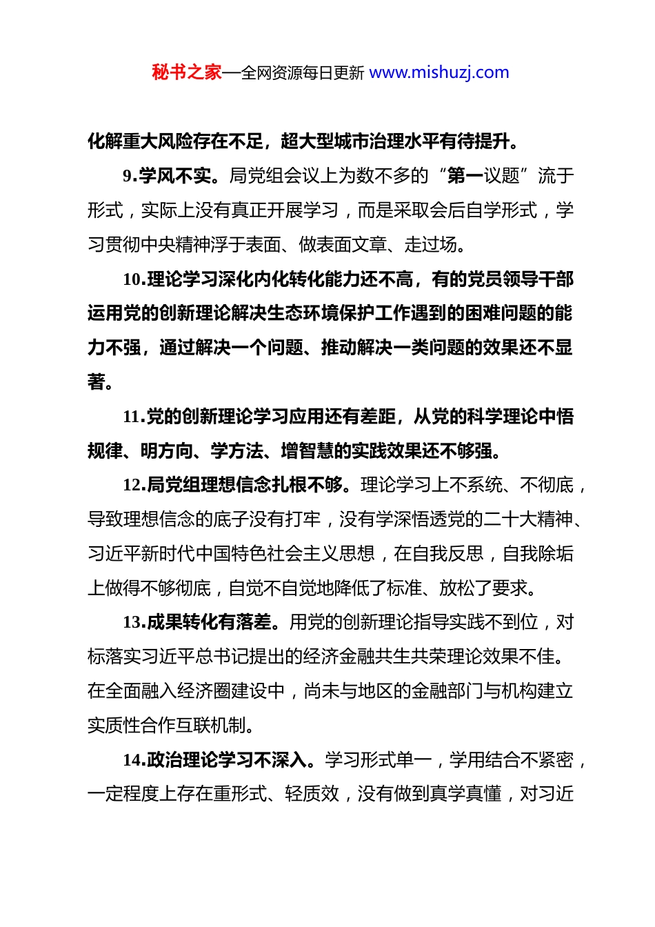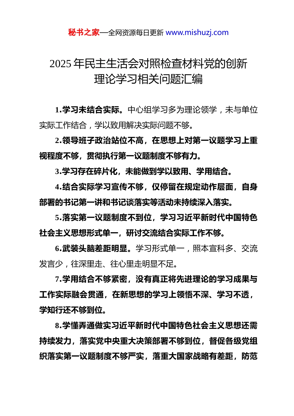 秘书之家—全网资源每日更新 www.mishuzj.com2025 年民主生活会对照检查材料党的创新理论学习相关问题汇编 1.学习未结合实际。中心组学习多为理论领学,未与单位实际工作结合,学以致用解决实际问题不够。2.领导班子政治站位不高,在思想上对第一议题学习上重视程度不够,贯彻执行第一议题制度不够有力。3.学习存在碎片化,未能做到学以致用、学用结合。4.结合实际学习宣传不够,仅停留在规定动作层面,自身部署的书记第一讲和书记谈落实等活动未持续深入落实。5.落实第一议题制度不到位,学习习近平新时代中国特色社会主义思想形式单一,研讨交流结合实际工作不够。6.武装头脑差距明显。学习形式单一,照本宣科多、交流发言少,往深里走、往心里走明显不足。7.学用结合不够紧密,没有真正将先进理论的学习成果与工作实际融会贯通,在新思想的学习上领悟不深、学习不透,学知行还不够到位。8.学懂弄通做实习近平新时代中国特色社会主义思想还需持续发力,落实党中央重大决策部署不够到位,督促各级党组织落实第一议题制度不够严实,落重大国家战略有差距,防范秘书之家—全网资源每日更新 www.mishuzj.com化解重大风险存在不足,超大型城市治理水平有待提升。9.学风不实。局党组会议上为数不多的“第一议题”流于形式,实际上没有真正开展学习,而是采取会后自学形式,学习贯彻中央精神浮于表面、做表面文章、走过场。10.理论学习深化内化转化能力还不高,有的党员领导干部运用党的创新理论解决生态环境保护工作遇到的困难问题的能力不强,通过解决一个问题、推动解决一类问题的效果还不显著。11.党的创新理论学习应用还有差距,从党的科学理论中悟规律、明方向、学方法、增智慧的实践效果还不够强。12.局党组理想信念扎根不够。理论学习上不系统、不彻底,导致理想信念的底子没有打牢,没有学深悟透党的二十大精神、习近平新时代中国特色社会主义思想,在自我反思,自我除垢上做得不够彻底,自觉不自觉地降低了标准、放松了要求。13.成果转化有落差。用党的创新理论指导实践不到位,对标落实习近平总书记提出的经济金融共生共荣理论效果不佳。在全面融入经济圈建设中,尚未与地区的金融部门与机构建立实质性合作互联机制。14.政治理论学习不深入。学习形式单一,学用结合不紧密,一定程度上存在重形式、轻质效,没有做到真学真懂,对习近秘书之家—全网资源每日更新 www.mishuzj.com平新时代中国特色社会主义思想蕴含的丰富内涵、科学指向、重要方法把握得不够精准,在学懂弄通上还有差距,导致相关材料撰写深度不够,思路不新,以文辅政作用发挥不够到位。在开展重点任务督办工作时,没有做到将上级精神学深学透,导致督办发现的问题大多数是表面问题,对产生问题的深层次原因剖析不够到位。15.学习走过场。对习近平新时代中国特色社会主义思想、党的二十大精神、习近平总书记重要讲话重要指示批示精神原文传达得多,悟原理较少,研讨不深入、不具体。16.第一议题制度落实不到位,党工委政治理论学习领头雁作用发挥不充分,用习近平新时代中国特色社会主义思想武装头脑、指导实践的意识不强、自觉性不足,党工委议事规则中未明确规定第一议题制度,且落实不到位。17.学以致用不够,对习近平总书记重要讲话、重要指示精神,知而行不够,推动解决实际问题不够有力,体制机制改革后,下属公司均未建立现代企业制度,没有实现真正意义的市场化、实体化运营,平台公司负债较高。18.长远谋划不足,主动担当、统筹协调不到位,攻坚克难能力不够强,产业发展统筹谋划不足,开发区实行管理模式,面对企业数量多且分散的现状,党工委对小微企业发展壮大关秘书之家—全网资源每日更新 www.mishuzj.com注度不够,园区规划更多侧重于内部发展,缺少有机融入全市、全省的超前思维。19.学懂弄通做实习近平新时代中国特色社会主义思想有差距,传达学习形式较为单一,看视频、读文章多,贯彻落实不够具体。对第一议题制度重要性认识不够清晰,落实第一议题制度不严格。20.贯彻落实党的理论和路线方针政策有差距,政治意识、政治担当、政治能力有不足,学习贯彻习近平新时代中国特色社会主义...