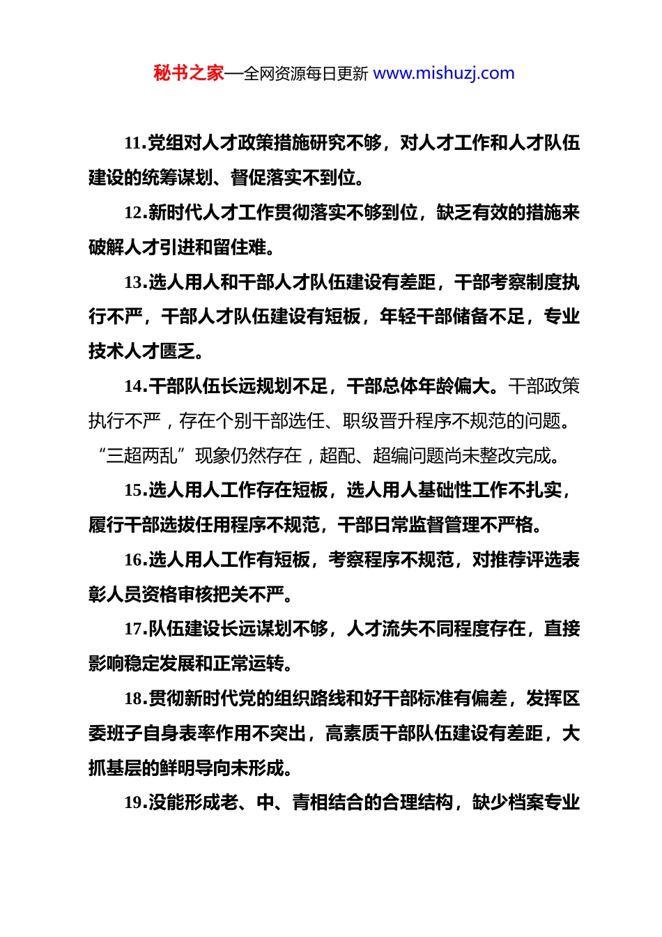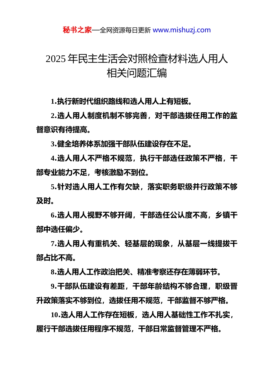秘书之家—全网资源每日更新 www.mishuzj.com2025 年民主生活会对照检查材料选人用人相关问题汇编 1.执行新时代组织路线和选人用人上有短板。2.选人用人制度机制不够完善,对干部选拔任用工作的监督意识有待提高。3.健全培养体系加强干部队伍建设存在不足。4.选人用人不严格不规范,执行干部选任政策不严格,干部专业能力不足,考核激励不到位。5.针对选人用人工作有欠缺,落实职务职级并行政策不够及时。6.选人用人视野不够开阔,干部选任公认度不高,乡镇干部中选任偏少。7.选人用人有重机关、轻基层的现象,从基层一线提拔干部占比不高。8.选人用人工作政治把关、精准考察还存在薄弱环节。9.干部队伍建设有差距,干部年龄结构不够合理,职级晋升政策落实不够到位,选拔任用不规范,干部监督不够严格。10.选人用人工作存在短板,选人用人基础性工作不扎实,履行干部选拔任用程序不规范,干部日常监督管理不严格。秘书之家—全网资源每日更新 www.mishuzj.com11.党组对人才政策措施研究不够,对人才工作和人才队伍建设的统筹谋划、督促落实不到位。12.新时代人才工作贯彻落实不够到位,缺乏有效的措施来破解人才引进和留住难。13.选人用人和干部人才队伍建设有差距,干部考察制度执行不严,干部人才队伍建设有短板,年轻干部储备不足,专业技术人才匮乏。14.干部队伍长远规划不足,干部总体年龄偏大。干部政策执行不严,存在个别干部选任、职级晋升程序不规范的问题。“三超两乱”现象仍然存在,超配、超编问题尚未整改完成。15.选人用人工作存在短板,选人用人基础性工作不扎实,履行干部选拔任用程序不规范,干部日常监督管理不严格。16.选人用人工作有短板,考察程序不规范,对推荐评选表彰人员资格审核把关不严。17.队伍建设长远谋划不够,人才流失不同程度存在,直接影响稳定发展和正常运转。18.贯彻新时代党的组织路线和好干部标准有偏差,发挥区委班子自身表率作用不突出,高素质干部队伍建设有差距,大抓基层的鲜明导向未形成。19.没能形成老、中、青相结合的合理结构,缺少档案专业秘书之家—全网资源每日更新 www.mishuzj.com人才,干部队伍业务素质建设有待优化。20.干部选任不规范,干部考察纪实材料不严谨,指导基层不到位问题,干部调动不合规。21.选人用人导向不够鲜明,提拔基层和经济一线干部明显较少,职级激励作用发挥不够。22.选人用人工作开展不力。制定方案有偏差。制定的《科级领导干部选拔任用实施方案》中,任职资格条件附加近三年年度考核均为合格及以上等次要求,与《党政领导干部选拔任用工作条例》要求不符。23.选人用人程序不规范。在选任干部时,多次存在民主推荐、党组会议记录和纪实材料不规范、执行廉政征询制度和任职前公示制度不到位的情况。24.基础工作不扎实。干部选任文书档案不完善,存在签字确认不完全、材料缺失、表格错用等问题。干部人事档案管理不规范,重要档案材料缺失,个别干部人事档案缺少提拔任职考察材料和年度考核登记表等资料。25.干部选拔任用全程纪实材料不齐全。对干部选拔任用等相关政策法规的学习和理解不够透彻,对《党政领导干部选拔任用工作条例》《关于建立干部选拔任用工作纪实制度的实施意见(试行)》学习不够深入,业务不够熟练,工作不够严谨,秘书之家—全网资源每日更新 www.mishuzj.com对干部选拔任用工作纪实要求和细节把握执行不到位。
