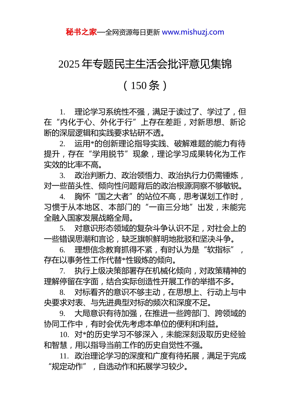 秘书之家—全网资源每日更新 www.mishuzj.com2025 年专题民主生活会批评意见集锦(150 条)1.理论学习系统性不强,满足于读过了、学过了,但在“内化于心、外化于行”上存在差距,对新思想、新论断的深层逻辑和实践要求钻研不透。2.运用*的创新理论指导实践、破解难题的能力有待提升,存在“学用脱节”现象,理论学习成果转化为工作实效的比率不高。3.政治判断力、政治领悟力、政治执行力仍需锤炼,对一些苗头性、倾向性问题背后的政治根源洞察不够敏锐。4.胸怀“国之大者”的站位不高,思考谋划工作时,习惯于从本地区、本部门的“一亩三分地”出发,未能完全融入国家发展战略全局。5.对意识形态领域的复杂斗争认识不足,对社会上的一些错误思潮和言论,缺乏旗帜鲜明地批驳和坚决斗争。6.理想信念教育抓得不紧,有时认为是“软指标”,存在以事务性工作代替*性锻炼的倾向。7.执行上级决策部署存在机械化倾向,对政策精神的理解停留在字面,结合实际创造性开展工作的举措不多。8.对标看齐的意识不够主动,在思想上、行动上与中央要求对表、与先进典型对标的频次和深度不足。9.大局意识有待加强,在推进一些跨部门、跨领域的协同工作中,有时会优先考虑本单位的便利和利益。10. 对*的历史学习不够深入,未能深刻汲取历史经验和智慧,用以指导当前工作的历史自觉性不强。11. 政治理论学习的深度和广度有待拓展,满足于完成“规定动作”,自选动作和拓展学习较少。秘书之家—全网资源每日更新 www.mishuzj.com12. 对国际国内形势的分析研判能力不足,对潜在的风险挑战预见性不强,缺乏前瞻性思考和布局。13. 在贯彻新发展理念上存在思维惯性,对如何实现高质量发展,仍然存在路径依赖,创新思路不多。14. 忧患意识不够强烈,对发展中可能遇到的“黑天鹅”“灰犀牛”事件,思想准备和工作准备尚不充分。15. 斗争精神有所弱化,在面对一些不符合原则的人和事时,有时存在“爱惜羽毛”思想,不敢较真碰硬。16. 理论联系实际的文风会风改进不彻底,讲话、报告中有时仍存在穿靴戴帽、照本宣科的现象。17. 对分管领域*员干部的思想动态掌握不及时、不全面,谈心谈话的深度和频次不够。18. 推动学习教育常态化长效化举措不多,红色资源的挖掘和运用不够充分。19. 对新质生产力等重大理论和实践问题的学习研究不深,知识储备和能力储备存在短板。20. 坚守意识形态阵地的责任感需进一步压实,对网络舆情和新媒体平台的引导、管理能力有待提高。21. 工作作风不够扎实,存在“重部署、轻落实”的现象,对一些工作的跟踪问效、一抓到底的韧劲不足。22. 调查研究不深不实,存在“走马观花”“蜻蜓点水”式调研,满足于听汇报、看材料,深入基层一线解剖麻雀不够。23. 形式主义、官僚主义问题仍未根除,以会议落实会议、以文件落实文件的现象依然存在,给基层造成了一定负担。24. 担当精神和攻坚克难的锐气有所消减,面对一些历史遗留问题和复杂矛盾,存在畏难情绪和“绕道走”的想法。25. 批评和自我批评的武器运用得不好,自我批评时“隔靴搔痒”,批评他人时“蜻蜓点水”,辣味不足。秘书之家—全网资源每日更新 www.mishuzj.com26. 执行民主集中制不够严格,在“三重一大”事项决策中,有时发扬民主不充分,听取各方面意见不够广泛。27. 工作标准不高,满足于“过得去”,与“走在前、作表率”的要求还有差距,缺乏精益求精的工匠精神。28. 纪律规矩意识有待强化,对一些“四风”问题的隐形变异现象警惕性不高,对小事小节的要求有所放松。29. 会风文风有待进一步改进,会议时长和文件篇幅控制不够严格,内容有时空泛,针对性不强。30. 抓工作落实的闭环意识不强,布置了任务,但对完成情况、实际效果的检查、评估和反馈机制不健全。31. 艰苦奋斗的优良传统发扬不够,对办公经费、公务接待等方面的成本控制意识需要进一步增强。32. 执行请示报告制度不够到位,对一些应该及时报告的事项,存在报告不及时、内容不全面的情况。33. 对下属的日常监督管理不够严格,提醒、函询、诫勉等抓早抓小的手段运用偏少。34. 存在“老好人”思想,不愿意得罪人,对一些同志的缺...