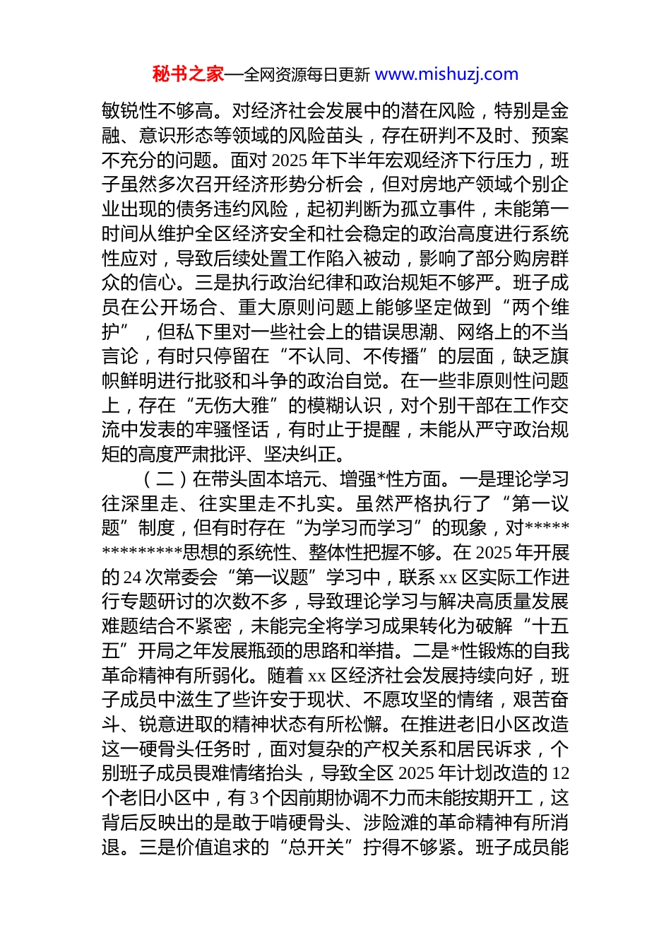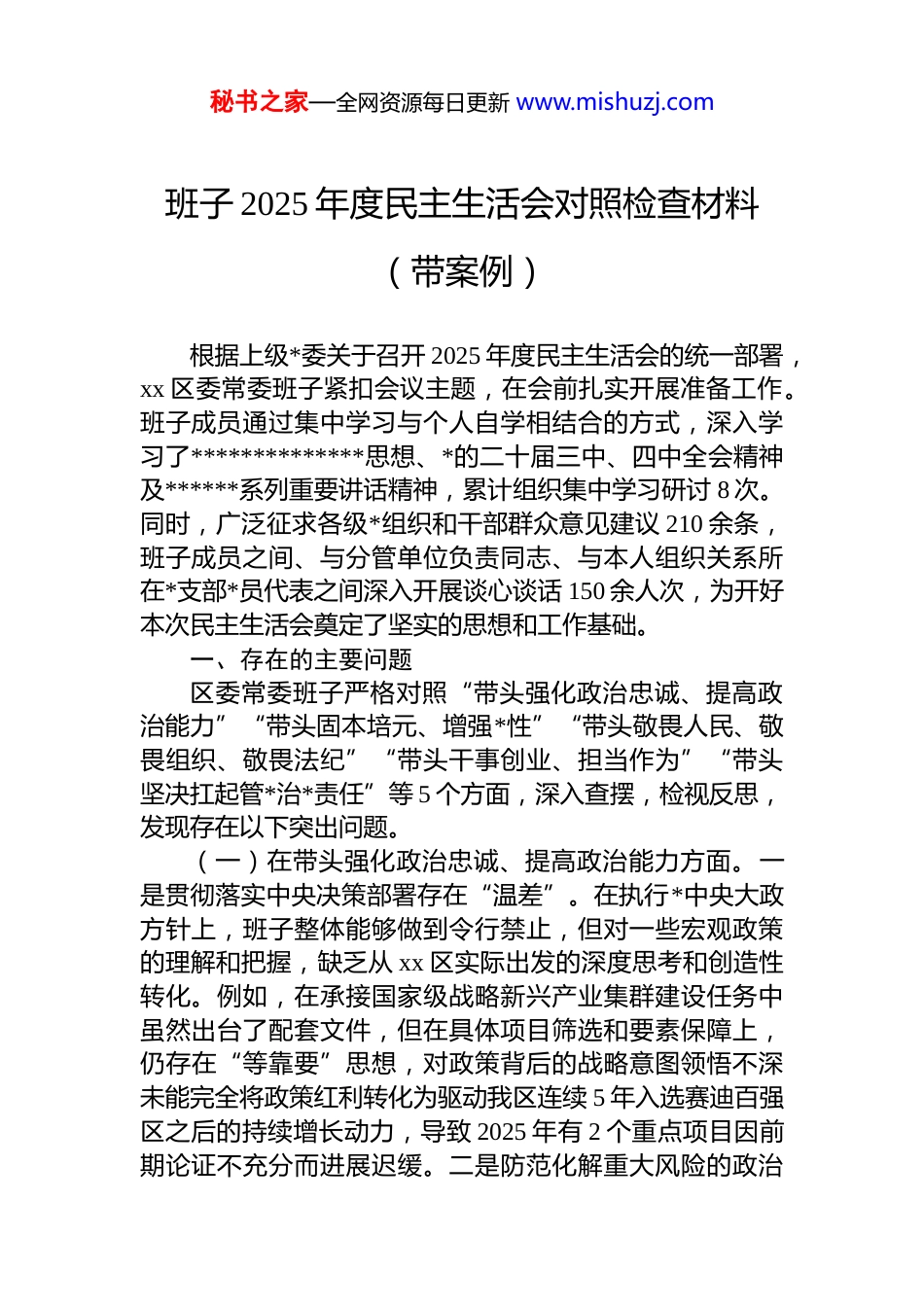 秘书之家—全网资源每日更新 www.mishuzj.com班子 2025 年度民主生活会对照检查材料(带案例)根据上级*委关于召开 2025 年度民主生活会的统一部署,xx 区委常委班子紧扣会议主题,在会前扎实开展准备工作。班子成员通过集中学习与个人自学相结合的方式,深入学习了**************思想、*的二十届三中、四中全会精神及******系列重要讲话精神,累计组织集中学习研讨 8 次。同时,广泛征求各级*组织和干部群众意见建议 210 余条,班子成员之间、与分管单位负责同志、与本人组织关系所在*支部*员代表之间深入开展谈心谈话 150 余人次,为开好本次民主生活会奠定了坚实的思想和工作基础。一、存在的主要问题区委常委班子严格对照“带头强化政治忠诚、提高政治能力”“带头固本培元、增强*性”“带头敬畏人民、敬畏组织、敬畏法纪”“带头干事创业、担当作为”“带头坚决扛起管*治*责任”等 5 个方面,深入查摆,检视反思,发现存在以下突出问题。(一)在带头强化政治忠诚、提高政治能力方面。一是贯彻落实中央决策部署存在“温差”。在执行*中央大政方针上,班子整体能够做到令行禁止,但对一些宏观政策的理解和把握,缺乏从 xx 区实际出发的深度思考和创造性转化。例如,在承接国家级战略新兴产业集群建设任务中虽然出台了配套文件,但在具体项目筛选和要素保障上,仍存在“等靠要”思想,对政策背后的战略意图领悟不深未能完全将政策红利转化为驱动我区连续 5 年入选赛迪百强区之后的持续增长动力,导致 2025 年有 2 个重点项目因前期论证不充分而进展迟缓。二是防范化解重大风险的政治秘书之家—全网资源每日更新 www.mishuzj.com敏锐性不够高。对经济社会发展中的潜在风险,特别是金融、意识形态等领域的风险苗头,存在研判不及时、预案不充分的问题。面对 2025 年下半年宏观经济下行压力,班子虽然多次召开经济形势分析会,但对房地产领域个别企业出现的债务违约风险,起初判断为孤立事件,未能第一时间从维护全区经济安全和社会稳定的政治高度进行系统性应对,导致后续处置工作陷入被动,影响了部分购房群众的信心。三是执行政治纪律和政治规矩不够严。班子成员在公开场合、重大原则问题上能够坚定做到“两个维护”,但私下里对一些社会上的错误思潮、网络上的不当言论,有时只停留在“不认同、不传播”的层面,缺乏旗帜鲜明进行批驳和斗争的政治自觉。在一些非原则性问题上,存在“无伤大雅”的模糊认识,对个别干部在工作交流中发表的牢骚怪话,有时止于提醒,未能从严守政治规矩的高度严肃批评、坚决纠正。(二)在带头固本培元、增强*性方面。一是理论学习往深里走、往实里走不扎实。虽然严格执行了“第一议题”制度,但有时存在“为学习而学习”的现象,对**************思想的系统性、整体性把握不够。在 2025 年开展的 24 次常委会“第一议题”学习中,联系 xx 区实际工作进行专题研讨的次数不多,导致理论学习与解决高质量发展难题结合不紧密,未能完全将学习成果转化为破解“十五五”开局之年发展瓶颈的思路和举措。二是*性锻炼的自我革命精神有所弱化。随着 xx 区经济社会发展持续向好,班子成员中滋生了些许安于现状、不愿攻坚的情绪,艰苦奋斗、锐意进取的精神状态有所松懈。在推进老旧小区改造这一硬骨头任务时,面对复杂的产权关系和居民诉求,个别班子成员畏难情绪抬头,导致全区 2025 年计划改造的 12个老旧小区中,有 3 个因前期协调不力而未能按期开工,这背后反映出的是敢于啃硬骨头、涉险滩的革命精神有所消退。三是价值追求的“总开关”拧得不够紧。班子成员能秘书之家—全网资源每日更新 www.mishuzj.com够做到廉洁自律,但对照共产*人精神追求,在思想深处对权力、地位、利益的认识仍有偏差。在工作中,有时过于看重经济指标的增长和在全市的排名,而对一些投入大、见效慢的民生基础工程,如城乡结合部污水管网升级改造虽然认识到其重要性,但在财力紧张时,推进的决心和力度就不够坚决,反映出政绩观存在偏差,为民情怀扎根不深。(三)在带头敬畏人民、敬畏组织、敬畏法纪方面。一是深入基层联系群众不够密切...