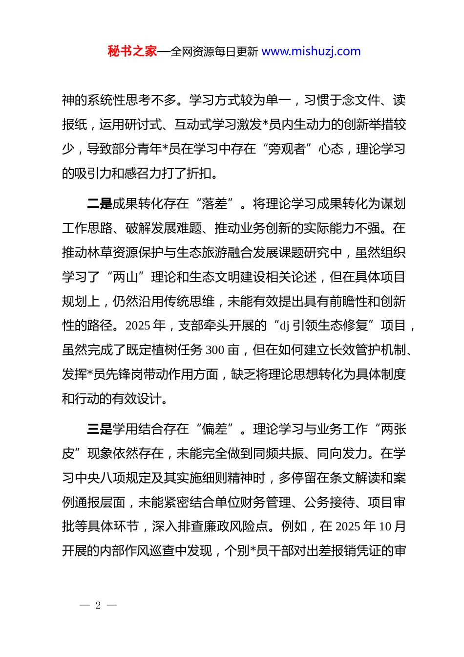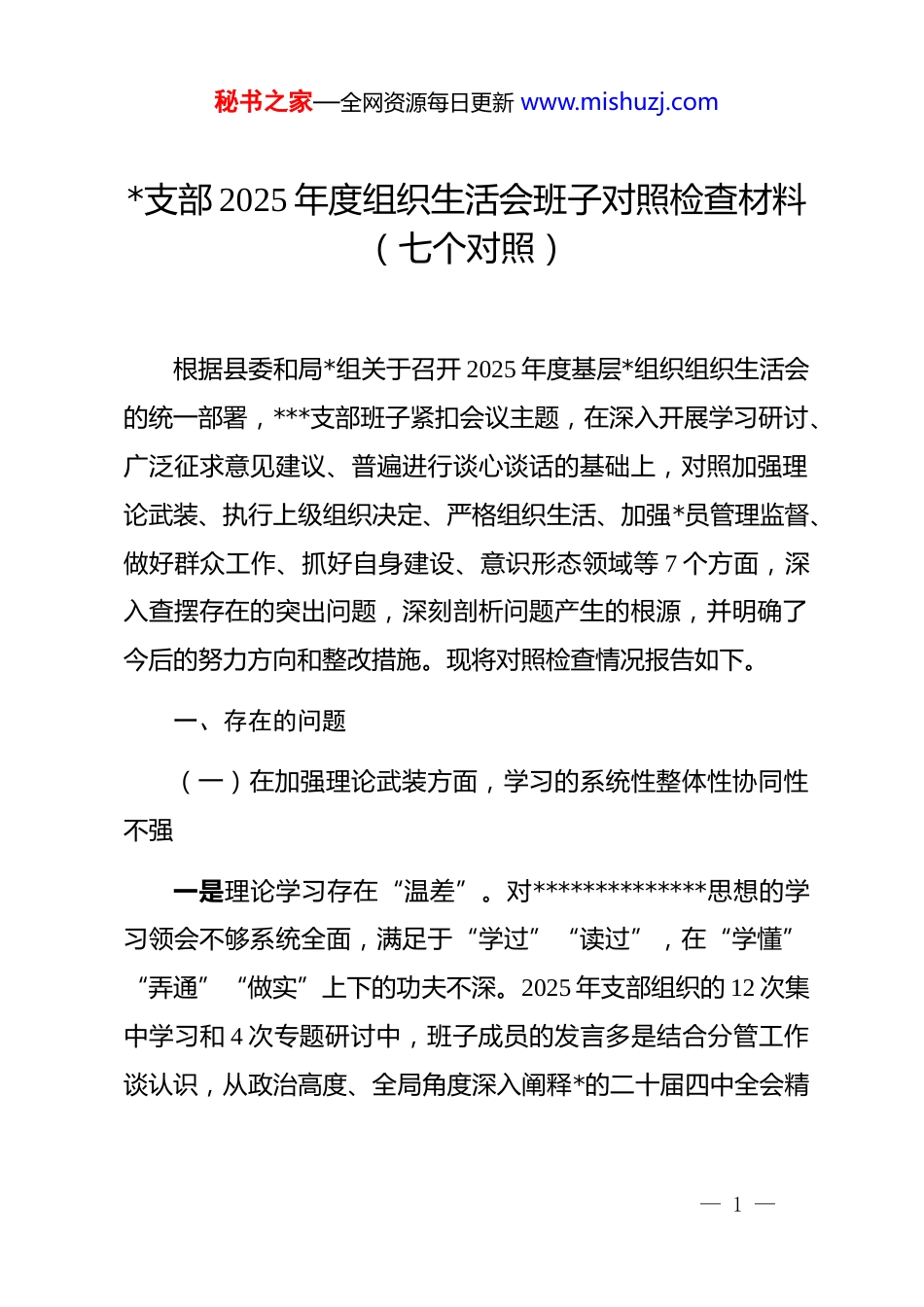 秘书之家—全网资源每日更新 www.mishuzj.com*支部 2025 年度组织生活会班子对照检查材料(七个对照)根据县委和局*组关于召开 2025 年度基层*组织组织生活会的统一部署,***支部班子紧扣会议主题,在深入开展学习研讨、广泛征求意见建议、普遍进行谈心谈话的基础上,对照加强理论武装、执行上级组织决定、严格组织生活、加强*员管理监督、做好群众工作、抓好自身建设、意识形态领域等 7 个方面,深入查摆存在的突出问题,深刻剖析问题产生的根源,并明确了今后的努力方向和整改措施。现将对照检查情况报告如下。一、存在的问题(一)在加强理论武装方面,学习的系统性整体性协同性不强一是理论学习存在“温差”。对**************思想的学习领会不够系统全面,满足于“学过”“读过”,在“学懂”“弄通”“做实”上下的功夫不深。2025 年支部组织的 12 次集中学习和 4 次专题研讨中,班子成员的发言多是结合分管工作谈认识,从政治高度、全局角度深入阐释*的二十届四中全会精— 1 —秘书之家—全网资源每日更新 www.mishuzj.com神的系统性思考不多。学习方式较为单一,习惯于念文件、读报纸,运用研讨式、互动式学习激发*员内生动力的创新举措较少,导致部分青年*员在学习中存在“旁观者”心态,理论学习的吸引力和感召力打了折扣。二是成果转化存在“落差”。将理论学习成果转化为谋划工作思路、破解发展难题、推动业务创新的实际能力不强。在推动林草资源保护与生态旅游融合发展课题研究中,虽然组织学习了“两山”理论和生态文明建设相关论述,但在具体项目规划上,仍然沿用传统思维,未能有效提出具有前瞻性和创新性的路径。2025 年,支部牵头开展的“dj 引领生态修复”项目,虽然完成了既定植树任务 300 亩,但在如何建立长效管护机制、发挥*员先锋岗带动作用方面,缺乏将理论思想转化为具体制度和行动的有效设计。三是学用结合存在“偏差”。理论学习与业务工作“两张皮”现象依然存在,未能完全做到同频共振、同向发力。在学习中央八项规定及其实施细则精神时,多停留在条文解读和案例通报层面,未能紧密结合单位财务管理、公务接待、项目审批等具体环节,深入排查廉政风险点。例如,在 2025 年 10 月开展的内部作风巡查中发现,个别*员干部对出差报销凭证的审— 2 —秘书之家—全网资源每日更新 www.mishuzj.com核标准理解不一,反映出理论学习与实际操作的脱节,未能将纪律要求真正内化为行动自觉和工作标准。(二)在执行上级组织决定方面,贯彻的坚决性彻底性实效性不够一是落实决策存在“慢差”。对上级组织的决策部署,有时存在思想认识上的“时差”,行动落实上的“温差”,习惯于“等一等、看一看”,缺乏闻令而动、雷厉风行的政治自觉。对于县委部署的“优化营商环境、服务市场主体”专项行动,支部虽然制定了方案,但在简化审批流程、压缩办理时限等关键环节上,主动作为不够。截至 2025 年 11 月底,我局承诺的“林权不动产登记”办理时限仅比规定时限缩短了 1 个工作日,距离“全县最优”的目标差距明显,反映出攻坚克难的锐气和魄力不足。二是执行标准存在“高差”。在执行上级决策部署时,有时满足于“不走样”,但在追求“更高标准、更优效果”上思考不深、用力不足。在落实“三大功能”“四大作用”要求,服务兵团融合发展的工作中,支部主要完成了划定的对接任务,但在主动跨前一步、积极谋划拓展合作领域方面做得不够。例如,在与**兵团单位开展的共建活动中,仅限于联合开展主题*— 3 —秘书之家—全网资源每日更新 www.mishuzj.com日,对于如何在国土空间规划、生态保护修复等领域建立常态化协作机制,缺乏深入研究和实质性推动,工作成效停留在表面。三是报告制度存在“偏差”。在重大事项报告和重要工作请示方面,虽然能够遵守基本规矩,但有时存在认识上的模糊地带,对哪些属于“重大事项”的界定不够清晰、精准。2025年 8 月,支部在处理一起涉及跨区域草场流转的群众信访纠纷时,初期认为是常规业务矛盾,仅在业务层面进行协调,未能第一时间向局*组和上级*组织专题报告潜在的风险隐患,导致后期工作陷入...