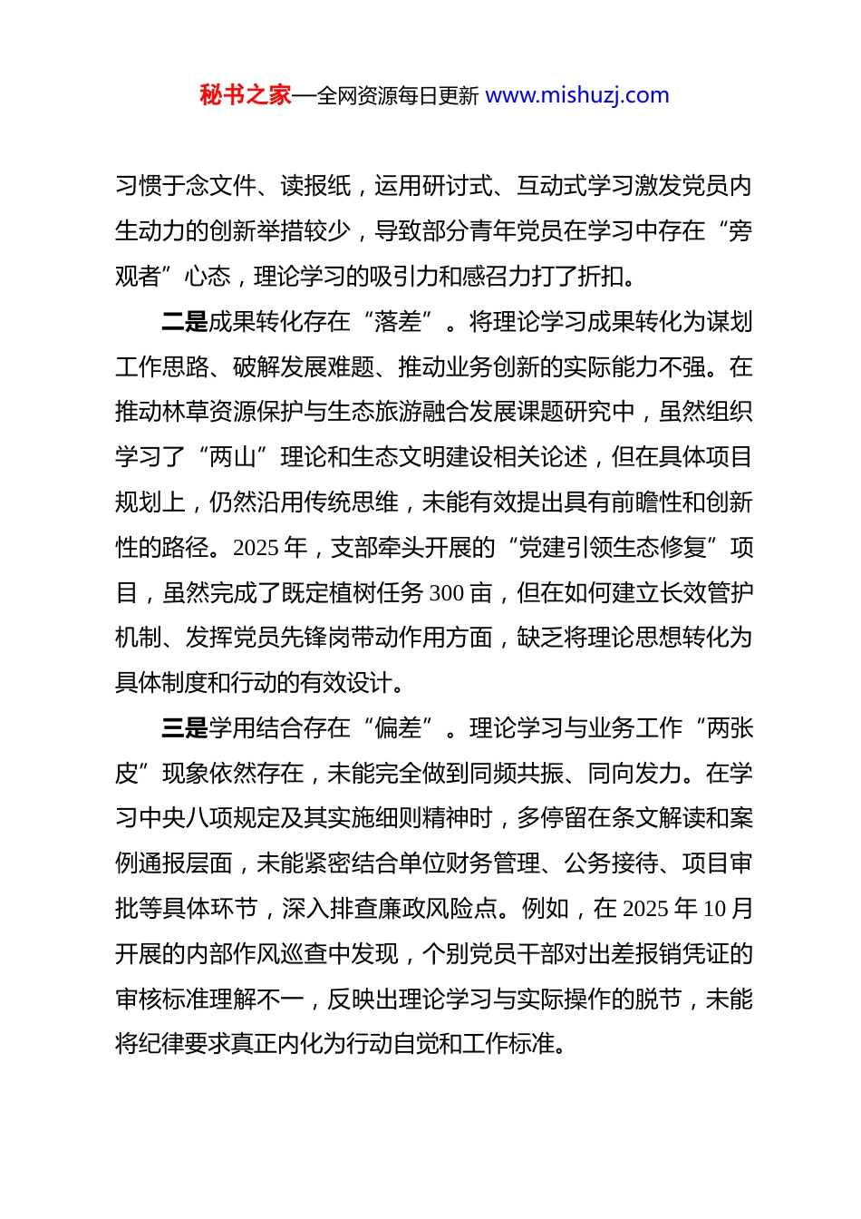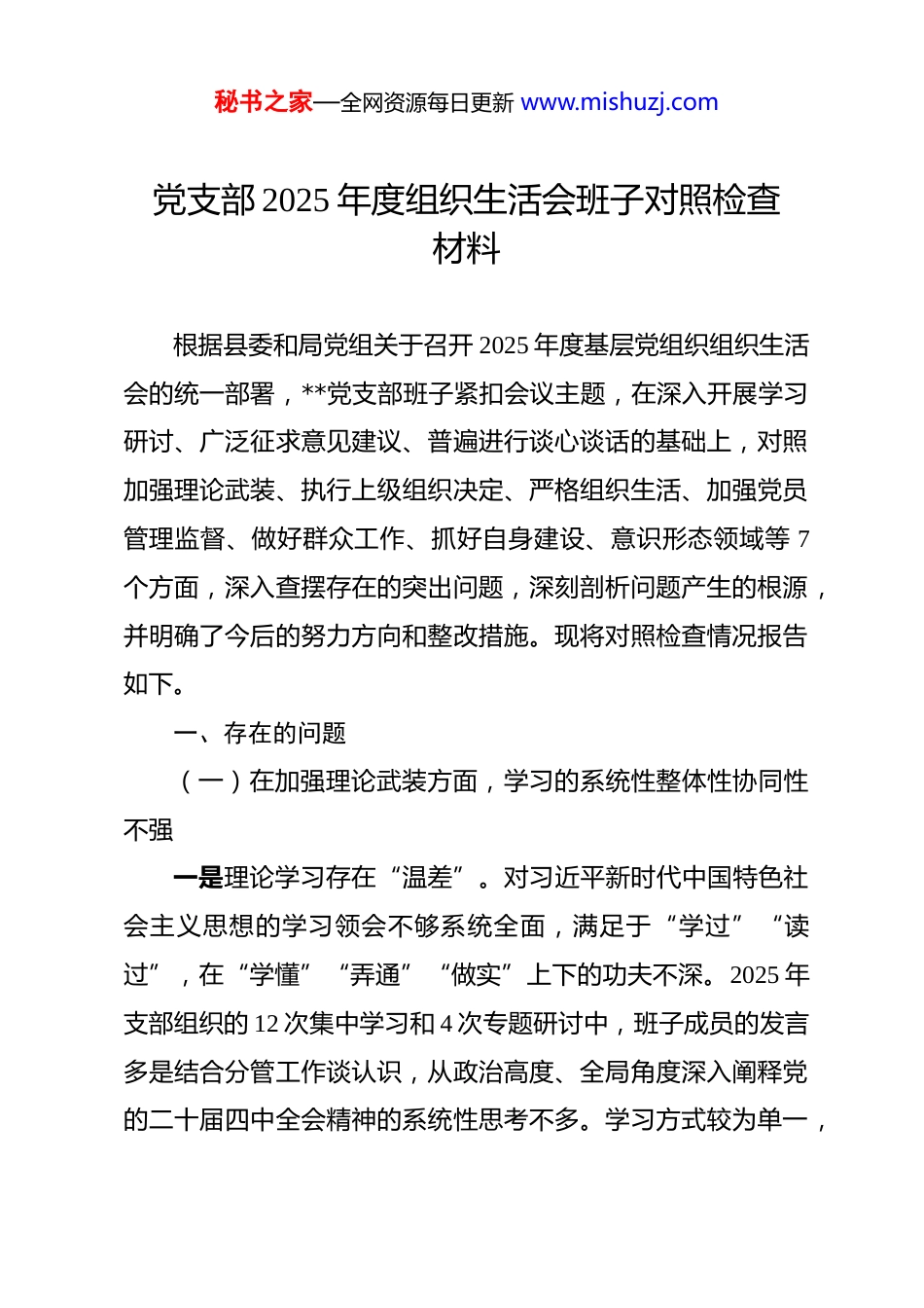 秘书之家—全网资源每日更新 www.mishuzj.com党支部 2025 年度组织生活会班子对照检查材料 根据县委和局党组关于召开 2025 年度基层党组织组织生活会的统一部署,**党支部班子紧扣会议主题,在深入开展学习研讨、广泛征求意见建议、普遍进行谈心谈话的基础上,对照加强理论武装、执行上级组织决定、严格组织生活、加强党员管理监督、做好群众工作、抓好自身建设、意识形态领域等 7个方面,深入查摆存在的突出问题,深刻剖析问题产生的根源,并明确了今后的努力方向和整改措施。现将对照检查情况报告如下。一、存在的问题(一)在加强理论武装方面,学习的系统性整体性协同性不强一是理论学习存在“温差”。对习近平新时代中国特色社会主义思想的学习领会不够系统全面,满足于“学过”“读过”,在“学懂”“弄通”“做实”上下的功夫不深。2025 年支部组织的 12 次集中学习和 4 次专题研讨中,班子成员的发言多是结合分管工作谈认识,从政治高度、全局角度深入阐释党的二十届四中全会精神的系统性思考不多。学习方式较为单一,秘书之家—全网资源每日更新 www.mishuzj.com习惯于念文件、读报纸,运用研讨式、互动式学习激发党员内生动力的创新举措较少,导致部分青年党员在学习中存在“旁观者”心态,理论学习的吸引力和感召力打了折扣。二是成果转化存在“落差”。将理论学习成果转化为谋划工作思路、破解发展难题、推动业务创新的实际能力不强。在推动林草资源保护与生态旅游融合发展课题研究中,虽然组织学习了“两山”理论和生态文明建设相关论述,但在具体项目规划上,仍然沿用传统思维,未能有效提出具有前瞻性和创新性的路径。2025 年,支部牵头开展的“党建引领生态修复”项目,虽然完成了既定植树任务 300 亩,但在如何建立长效管护机制、发挥党员先锋岗带动作用方面,缺乏将理论思想转化为具体制度和行动的有效设计。三是学用结合存在“偏差”。理论学习与业务工作“两张皮”现象依然存在,未能完全做到同频共振、同向发力。在学习中央八项规定及其实施细则精神时,多停留在条文解读和案例通报层面,未能紧密结合单位财务管理、公务接待、项目审批等具体环节,深入排查廉政风险点。例如,在 2025 年 10 月开展的内部作风巡查中发现,个别党员干部对出差报销凭证的审核标准理解不一,反映出理论学习与实际操作的脱节,未能将纪律要求真正内化为行动自觉和工作标准。秘书之家—全网资源每日更新 www.mishuzj.com(二)在执行上级组织决定方面,贯彻的坚决性彻底性实效性不够一是落实决策存在“慢差”。对上级组织的决策部署,有时存在思想认识上的“时差”,行动落实上的“温差”,习惯于“等一等、看一看”,缺乏闻令而动、雷厉风行的政治自觉。对于县委部署的“优化营商环境、服务市场主体”专项行动,支部虽然制定了方案,但在简化审批流程、压缩办理时限等关键环节上,主动作为不够。截至 2025 年 11 月底,我局承诺的“林权不动产登记”办理时限仅比规定时限缩短了 1 个工作日,距离“全县最优”的目标差距明显,反映出攻坚克难的锐气和魄力不足。二是执行标准存在“高差”。在执行上级决策部署时,有时满足于“不走样”,但在追求“更高标准、更优效果”上思考不深、用力不足。在落实“三大功能”“四大作用”要求,服务兵团融合发展的工作中,支部主要完成了划定的对接任务,但在主动跨前一步、积极谋划拓展合作领域方面做得不够。例如,在与**兵团单位开展的共建活动中,仅限于联合开展主题党日,对于如何在国土空间规划、生态保护修复等领域建立常态化协作机制,缺乏深入研究和实质性推动,工作成效停留在表面。秘书之家—全网资源每日更新 www.mishuzj.com三是报告制度存在“偏差”。在重大事项报告和重要工作请示方面,虽然能够遵守基本规矩,但有时存在认识上的模糊地带,对哪些属于“重大事项”的界定不够清晰、精准。2025年 8 月,支部在处理一起涉及跨区域草场流转的群众信访纠纷时,初期认为是常规业务矛盾,仅在业务层面进行协调,未能第一时间向局党组和上级党组织专题报告潜在的风险隐患,导致后期工作陷入被动。这件事...