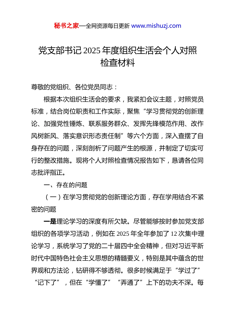秘书之家—全网资源每日更新 www.mishuzj.com党支部书记 2025 年度组织生活会个人对照检查材料 尊敬的党组织、各位党员同志:根据本次组织生活会的要求,我紧扣会议主题,对照党员标准,结合岗位职责和工作实际,聚焦“学习贯彻党的创新理论、加强党性锤炼、联系服务群众、发挥先锋模范作用、改作风树新风、落实意识形态责任制”等六个方面,深入查摆了自身存在的问题,深刻剖析了问题产生的根源,并制定了切实可行的整改措施。现将个人对照检查情况报告如下,恳请各位同志批评指正。一、存在的问题(一)在学习贯彻党的创新理论方面,存在学用结合不紧密的问题一是理论学习的深度有所欠缺。尽管能够按时参加党支部组织的各项学习活动,例如在 2025 年全年参加了 12 次集中理论学习,系统学习了党的二十届四中全会精神,但对习近平新时代中国特色社会主义思想的精髓要义,特别是其中蕴含的世界观和方法论,钻研得不够透彻。很多时候满足于“学过了”“记下了”,但在“学懂了”“弄通了”上下的功夫不深。每秘书之家—全网资源每日更新 www.mishuzj.com月个人自学时长平均不足 5 小时,对《习近平著作选读》等原著的研读不系统,导致对一些重大理论问题的理解停留在字面,缺乏融会贯通的领悟。二是学用转换的实效有所不足。在将党的创新理论转化为指导实践、推动工作的具体方法上,存在一定的“温差”和“落差”。例如,在推进 2025 年**乡草原生态补偿项目时,虽然在会议上反复强调要践行“绿水青山就是金山银山”的理念,但在处理项目征地与部分牧民放牧权益的矛盾时,仍习惯性地沿用行政命令的老办法,未能创造性地运用“系统治理、综合施策”的新思想,设计出兼顾生态保护与群众增收的更优方案,导致初期工作推进遇到了一定的阻力,有 3 户牧民对补偿标准表示不理解。三是主动融入的自觉有所不强。作为党支部书记,在组织学习时,满足于完成“规定动作”,领学、宣讲多,但带头深入研讨、主动分享心得、激发党员学习热情做得不好。在 2025年第三季度围绕“人与自然和谐共生”开展的主题党日活动中,我主要以传达文件、解读政策为主,未能结合我县生态修复的具体案例,引导大家展开思想碰撞和深度交流,使得学习活动的说服力和感染力打了折扣,未能真正实现以理论学习凝心铸魂的最佳效果。秘书之家—全网资源每日更新 www.mishuzj.com(二)在加强党性锤炼方面,存在自我革命不彻底的问题一是政治修养的淬炼不够严格。能够坚守政治底线,在大是大非问题上保持清醒坚定,但对照更高标准,自我革命的勇气和决心仍有不足。在日常工作中,有时会不自觉地流露出“船到码头车到站”的松劲心态,对一些长期存在的难点问题,如跨区域林地权属纠纷,缺乏“啃硬骨头”的攻坚锐气。在非正式场合,偶尔会对工作任务重、压力大的现状发几句牢骚,虽然是无心之言,但反映出共产党员应有的无私奉献精神和绝对忠诚意识树得不牢。二是理想信念的坚守不够纯粹。内心深处对共产主义的信仰是坚定的,但在实际工作中,有时会将个人职务等同于普通岗位,将完成业务工作视为最终目标,而淡化了其背后所承载的政治责任和为民宗旨。例如,在 2025 年春季的全民义务植树活动中,我更关注的是完成 5000 亩的造林任务指标,在现场忙于技术指导和进度调度,却忽略了利用这一契机,向参与活动的党员和群众深入宣传生态文明思想、讲述党员带头植树造林的时代意义,使一场生动的党性实践活动在一定程度上简化为了一项生产任务。三是纪律规矩的敬畏不够深入。能严格遵守党的政治纪律和政治规矩,但在一些“小事小节”上,自我要求有所放松。秘书之家—全网资源每日更新 www.mishuzj.com例如,在 2025 年 6 月对**矿区生态修复项目进行竣工验收后,合作单位出于感谢,邀请验收组共进工作晚餐,虽然严格控制了标准,未涉及铺张浪费,但我作为带队领导,未能从严把控,坚决谢绝,这在一定程度上模糊了“亲”“清”政商关系的界线,反映出我对落实中央八项规定精神的极端重要性认识不深,防微杜渐的警惕性不高。(三)在联系服务群众方面,存在宗旨意识不牢固的问题一是深入基层的脚步有所...