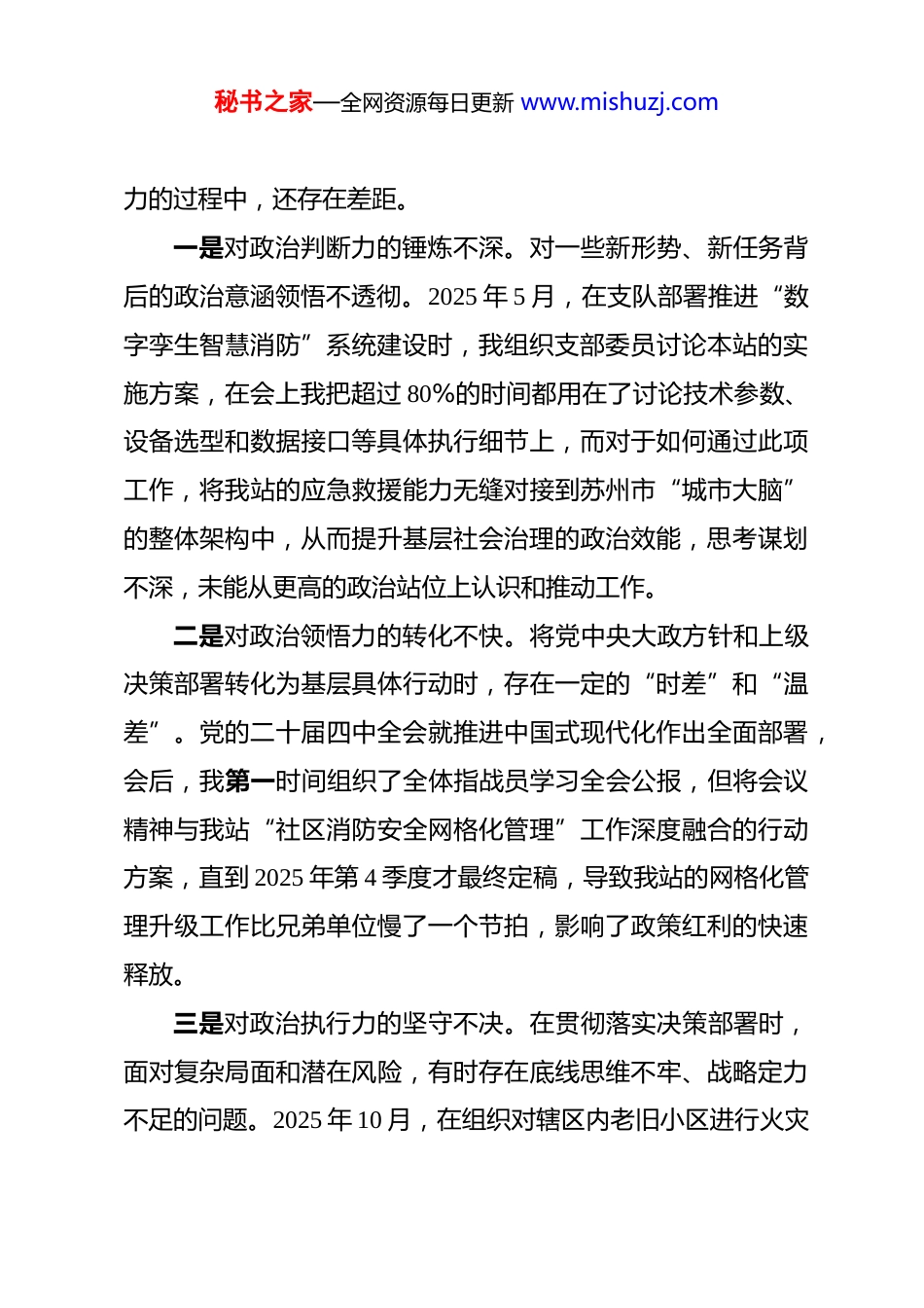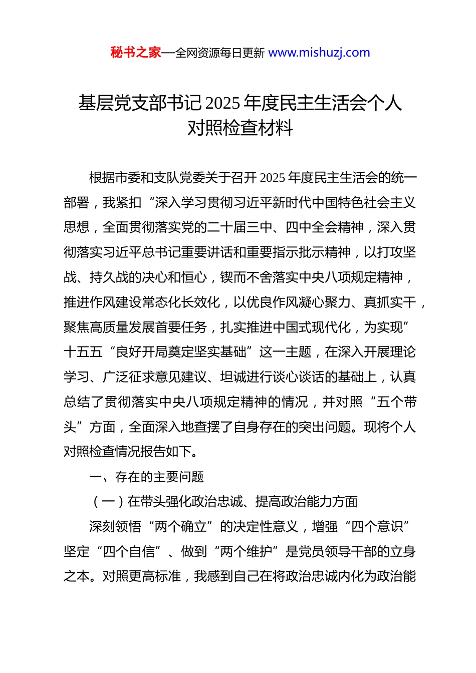 秘书之家—全网资源每日更新 www.mishuzj.com基层党支部书记 2025 年度民主生活会个人对照检查材料根据市委和支队党委关于召开 2025 年度民主生活会的统一部署,我紧扣“深入学习贯彻习近平新时代中国特色社会主义思想,全面贯彻落实党的二十届三中、四中全会精神,深入贯彻落实习近平总书记重要讲话和重要指示批示精神,以打攻坚战、持久战的决心和恒心,锲而不舍落实中央八项规定精神,推进作风建设常态化长效化,以优良作风凝心聚力、真抓实干,聚焦高质量发展首要任务,扎实推进中国式现代化,为实现”十五五“良好开局奠定坚实基础”这一主题,在深入开展理论学习、广泛征求意见建议、坦诚进行谈心谈话的基础上,认真总结了贯彻落实中央八项规定精神的情况,并对照“五个带头”方面,全面深入地查摆了自身存在的突出问题。现将个人对照检查情况报告如下。一、存在的主要问题(一)在带头强化政治忠诚、提高政治能力方面深刻领悟“两个确立”的决定性意义,增强“四个意识”坚定“四个自信”、做到“两个维护”是党员领导干部的立身之本。对照更高标准,我感到自己在将政治忠诚内化为政治能秘书之家—全网资源每日更新 www.mishuzj.com力的过程中,还存在差距。一是对政治判断力的锤炼不深。对一些新形势、新任务背后的政治意涵领悟不透彻。2025 年 5 月,在支队部署推进“数字孪生智慧消防”系统建设时,我组织支部委员讨论本站的实施方案,在会上我把超过 80%的时间都用在了讨论技术参数、设备选型和数据接口等具体执行细节上,而对于如何通过此项工作,将我站的应急救援能力无缝对接到苏州市“城市大脑”的整体架构中,从而提升基层社会治理的政治效能,思考谋划不深,未能从更高的政治站位上认识和推动工作。二是对政治领悟力的转化不快。将党中央大政方针和上级决策部署转化为基层具体行动时,存在一定的“时差”和“温差”。党的二十届四中全会就推进中国式现代化作出全面部署,会后,我第一时间组织了全体指战员学习全会公报,但将会议精神与我站“社区消防安全网格化管理”工作深度融合的行动方案,直到 2025 年第 4 季度才最终定稿,导致我站的网格化管理升级工作比兄弟单位慢了一个节拍,影响了政策红利的快速释放。三是对政治执行力的坚守不决。在贯彻落实决策部署时,面对复杂局面和潜在风险,有时存在底线思维不牢、战略定力不足的问题。2025 年 10 月,在组织对辖区内老旧小区进行火灾秘书之家—全网资源每日更新 www.mishuzj.com隐患排查时,我主要依据了前两年的排查数据和传统经验,对因“共享电单车”普及带来的新型充电桩乱拉乱建、电池入户充电等新风险,预判不足、重视不够。直到支队下发了关于电单车火灾风险的专项警示通报后,我才组织力量进行“回头看”和专项整治,暴露出我在执行安全排查这一政治任务时,敏锐性和前瞻性不强。(二)在带头固本培元、增强党性方面坚持用习近平新时代中国特色社会主义思想凝心铸魂,是加强党性修养的根本途径。反思自身,我在固本培元、锤炼党性上下的功夫还不够扎实。一是理论学习的深度有所欠缺。虽然能够按时完成“第一议题”学习和理论学习中心组的各项任务,但在“钻深悟透”上做得不好。2025 年,我主持开展了 4 次关于“习近平总书记论应急管理”的专题学习研讨,但在研讨交流环节,我个人发言时,引用原文、解读文件内容较多,而结合我站当前面临的指战员心理健康疏导压力增大、高层建筑灭火救援难题等实际工作,进行深层次的思考和提出独到见解不深,未能完全做到学思用贯通、知信行统一。二是党性锻炼的自觉有所弱化。在急难险重任务中锤炼党性的意识不强,有时存在“重业务、轻思想”的倾向。2025 年秘书之家—全网资源每日更新 www.mishuzj.com9 月,在为期一周的全市“蓝焰-2025”高强度、跨区域灭火救援实战演练中,我作为现场指挥员之一,将全部精力投入到了战术部署、力量调派和后勤保障上,确保了演练任务的圆满完成。但期间,我发现有 2 名新入职的消防员因连续高强度作业表现出畏难情绪和心理波动,我仅仅是口头鼓励了几句,而没有坐下来与他们深入谈心,开展“战地”...