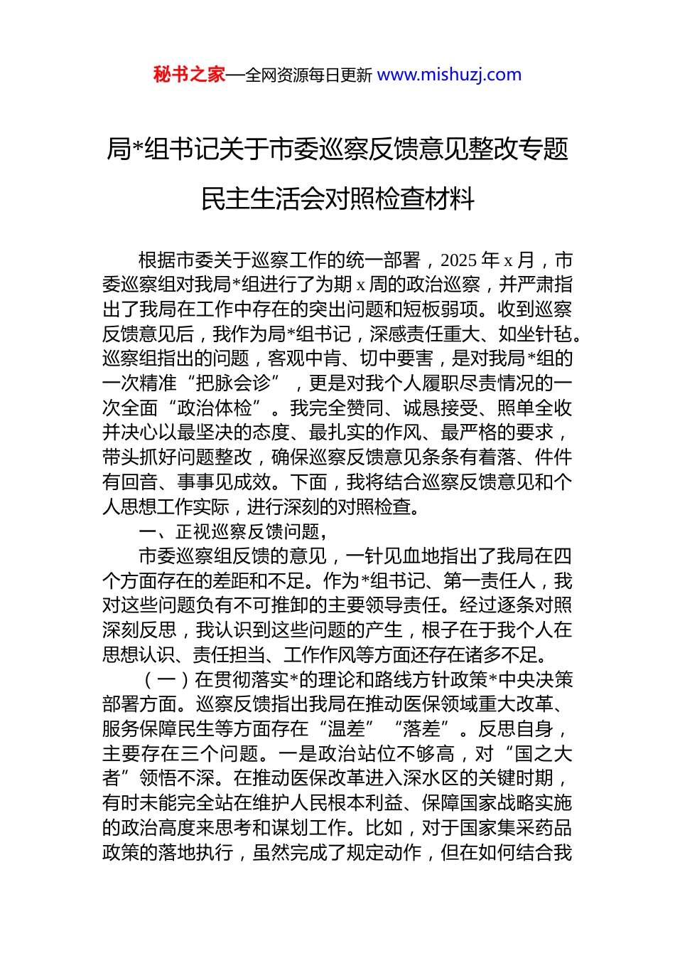 秘书之家—全网资源每日更新 www.mishuzj.com局*组书记关于市委巡察反馈意见整改专题民主生活会对照检查材料根据市委关于巡察工作的统一部署,2025 年 x 月,市委巡察组对我局*组进行了为期 x 周的政治巡察,并严肃指出了我局在工作中存在的突出问题和短板弱项。收到巡察反馈意见后,我作为局*组书记,深感责任重大、如坐针毡。巡察组指出的问题,客观中肯、切中要害,是对我局*组的一次精准“把脉会诊”,更是对我个人履职尽责情况的一次全面“政治体检”。我完全赞同、诚恳接受、照单全收并决心以最坚决的态度、最扎实的作风、最严格的要求,带头抓好问题整改,确保巡察反馈意见条条有着落、件件有回音、事事见成效。下面,我将结合巡察反馈意见和个人思想工作实际,进行深刻的对照检查。一、正视巡察反馈问题,市委巡察组反馈的意见,一针见血地指出了我局在四个方面存在的差距和不足。作为*组书记、第一责任人,我对这些问题负有不可推卸的主要领导责任。经过逐条对照深刻反思,我认识到这些问题的产生,根子在于我个人在思想认识、责任担当、工作作风等方面还存在诸多不足。(一)在贯彻落实*的理论和路线方针政策*中央决策部署方面。巡察反馈指出我局在推动医保领域重大改革、服务保障民生等方面存在“温差”“落差”。反思自身,主要存在三个问题。一是政治站位不够高,对“国之大者”领悟不深。在推动医保改革进入深水区的关键时期,有时未能完全站在维护人民根本利益、保障国家战略实施的政治高度来思考和谋划工作。比如,对于国家集采药品政策的落地执行,虽然完成了规定动作,但在如何结合我秘书之家—全网资源每日更新 www.mishuzj.com市实际、进一步降低群众用药负担、激发医疗机构参与积极性等方面的创新探索不足,导致政策红利未能百分之百释放,去年我市集采药品节约资金占药品总费用比例为 x%,低于全省平均水平 x 个百分点。二是以人民为中心的发展思想树得不牢。习惯于坐在办公室听汇报、看材料,深入基层一线、走进群众中间听取意见建议不够。对群众在异地就医备案、门诊慢特病申报、零星报销等方面的急难愁盼问题,虽然部署了工作,但对办理流程是否最优、等待时间是否最短、群众体验是否最佳等细节缺乏“一竿子插到底”的跟踪问效。我局“一站式”服务窗口平均等待时长仍有 x 分钟,与市委提出的“最多跑一次”要求还有差距。三是服务全市发展大局的主动性不强。对医保工作如何更好地融入和服务“健康 xx”建设、优化营商环境等全市中心工作思考不深、谋划不多。在推动“医保+商保”融合发展、满足群众多层次医疗保障需求方面,虽然进行了一些初步尝试,但与头部商业保险机构的战略合作推进缓慢相关普惠型商业健康保险产品的参保率仅为 x%,未能形成有效的补充保障。(二)在整治群众身边不正之风和腐败问题方面。巡察反馈指出我局在基金监管、医德医风建设等方面存在薄弱环节。对此我深感自责,反思自身主要存在三个问题。一是履行全面从严治*第一责任人职责有偏差。对*风廉政建设和反腐败工作的极端重要性认识深刻,但在压力传导上存在“上热中温下冷”的现象。满足于开了会、讲了话签了责任书,对分管领导和科室负责人履行“一岗双责”情况的日常监督检查和考核问责不够严格,导致个别干部产生了“医保基金是‘唐僧肉’”的错误认识。去年,我市查处定点医药机构违规使用医保基金案件 x 起,其中有 x起案件暴露出我局监管干部存在履职不力的问题。二是基金监管的“利剑”作用发挥不充分。面对医保基金监管的严峻复杂形势,有时存在畏难情绪,斗争精神不足。在推秘书之家—全网资源每日更新 www.mishuzj.com广应用国家医保信息平台智能监管子系统、运用大数据分析等现代化手段提升监管效能方面,决心和力度不够大。目前我市通过大数据模型主动发现的违规线索占比仅为 x%,仍过度依赖传统的现场检查和群众举报,监管的精准性和威慑力有待加强。三是深入纠治行业歪风邪气的韧劲不足。对“小病大治”、过度检查、串换项目等损害群众利益的不正之风,虽然联合卫健部门开展了专项整治,但常态化、长效化的制度机制尚未完全建立。整治工作存...