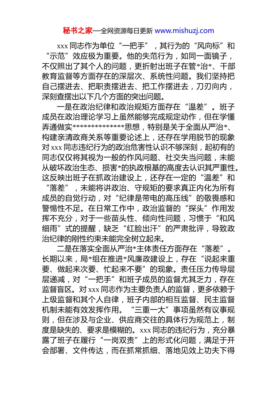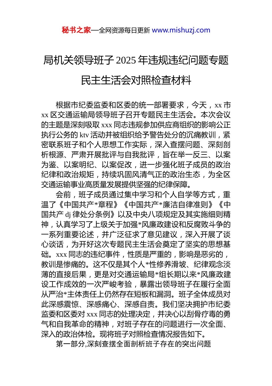 秘书之家—全网资源每日更新 www.mishuzj.com局机关领导班子 2025 年违规违纪问题专题民主生活会对照检查材料根据市纪委监委和区委的统一部署要求,今天,xx 市xx 区交通运输局领导班子召开专题民主生活会。本次会议的主题是深刻吸取 xxx 同志违规参加供应商组织的影响公正执行公务的 ktv 活动并被组织给予警告处分的沉痛教训,紧密联系班子和个人思想工作实际,深入查摆问题、深刻剖析根源、严肃开展批评与自我批评,旨在举一反三、以案为鉴、以案明纪、以案促改,进一步强化班子成员的政治纪律和政治规矩,持续巩固风清气正的政治生态,为全区交通运输事业高质量发展提供坚强的纪律保障。会前,班子成员通过集中学习和个人自学等方式,重温了《中国共产*章程》《中国共产*廉洁自律准则》《中国共产 dj 律处分条例》以及中央八项规定及其实施细则精神,认真学习了上级关于加强*风廉政建设和反腐败斗争的一系列重要论述,并广泛征求了意见建议,深入开展了谈心谈话,为开好这次专题民主生活会奠定了坚实的思想基础。xxx 同志的违纪事件,性质是严重的,影响是恶劣的,教训是惨痛的。这不仅是其个人*性修养滑坡、纪律观念淡薄的直接后果,更是对交通运输局*组长期以来*风廉政建设工作成效的一次严峻考验,暴露出领导班子在履行全面从严治*主体责任上仍然存在短板和漏洞。班子全体成员对此深感震惊、深感痛心、深感自责。我们坚决拥护市纪委监委和区委对 xxx 同志的处理决定,并决心以刮骨疗毒的勇气和自我革命的精神,对班子存在的问题进行一次全面、深入的政治体检。现将班子对照检查情况报告如下。第一部分,深刻查摆全面剖析班子存在的突出问题秘书之家—全网资源每日更新 www.mishuzj.comxxx 同志作为单位“一把手”,其行为的“风向标”和“示范”效应极为重要。他的失范行为,如同一面镜子,不仅照出了其个人的问题,更折射出班子在管*治*、干部教育监督等方面存在的深层次、系统性问题。我们坚持把自己摆进去、把职责摆进去、把工作摆进去,刀刃向内,深刻查摆出以下几个方面的突出问题。一是在政治纪律和政治规矩方面存在“温差”。班子成员在政治理论学习上虽然能够完成规定动作,但在学懂弄通做实**************思想,特别是关于全面从严治*、构建亲清政商关系等重要论述上,还存在学用脱节的现象对 xxx 同志违纪行为的政治危害性认识不够深刻,起初有的同志仅仅将其视为一般的作风问题、社交失当问题,未能从破坏政治生态、损害*的执政根基的高度去认识其严重性。这反映出班子在抓政治建设上,还存在一定的“温差”和“落差”,未能将讲政治、守规矩的要求真正内化为所有成员的自觉行动,对“纪律是带电的高压线”的敬畏感和警惕性不足。在日常工作中,政治监督的“探头”作用发挥不充分,对于一些苗头性、倾向性问题,习惯于“和风细雨”式的提醒,缺乏“红脸出汗”的严肃批评,导致政治纪律的刚性约束未能完全树立起来。二是在落实全面从严治*主体责任方面存在“落差”。长期以来,局*组在推进*风廉政建设上,存在“说起来重要、做起来次要、忙起来不要”的现象。责任压力传导层层递减,对“一把手”和班子成员的监督尤其乏力,存在监督盲区。对 xxx 同志作为主要负责人的监督,更多依赖于上级监督和其个人自律,班子内部的相互监督、民主监督机制未能有效发挥作用。“三重一大”事项虽然有议事规则,但在涉及与企业、供应商交往的具体行为规范上,制度是缺失的、要求是模糊的。xxx 同志的违纪行为,充分暴露了班子在履行“一岗双责”上的形式化问题,满足于开会部署、文件传达,而在抓常抓细、落地见效上功夫下得秘书之家—全网资源每日更新 www.mishuzj.com不够,对权力运行的制约和监督体系建设存在明显短板。警示教育的针对性和实效性不强,多以通报外部案例为主未能紧密结合交通工程建设、物资采购等高风险领域,开展精准化、常态化的廉政风险排查和警示教育。三是在干部队伍作风建设方面存在“偏差”。随着我区交通基础设施建设投入的不断加大,交通运输局的业务量和项目资金量持续增长,班子成员与各类市场主体、供应商打交道的机会日益增...
