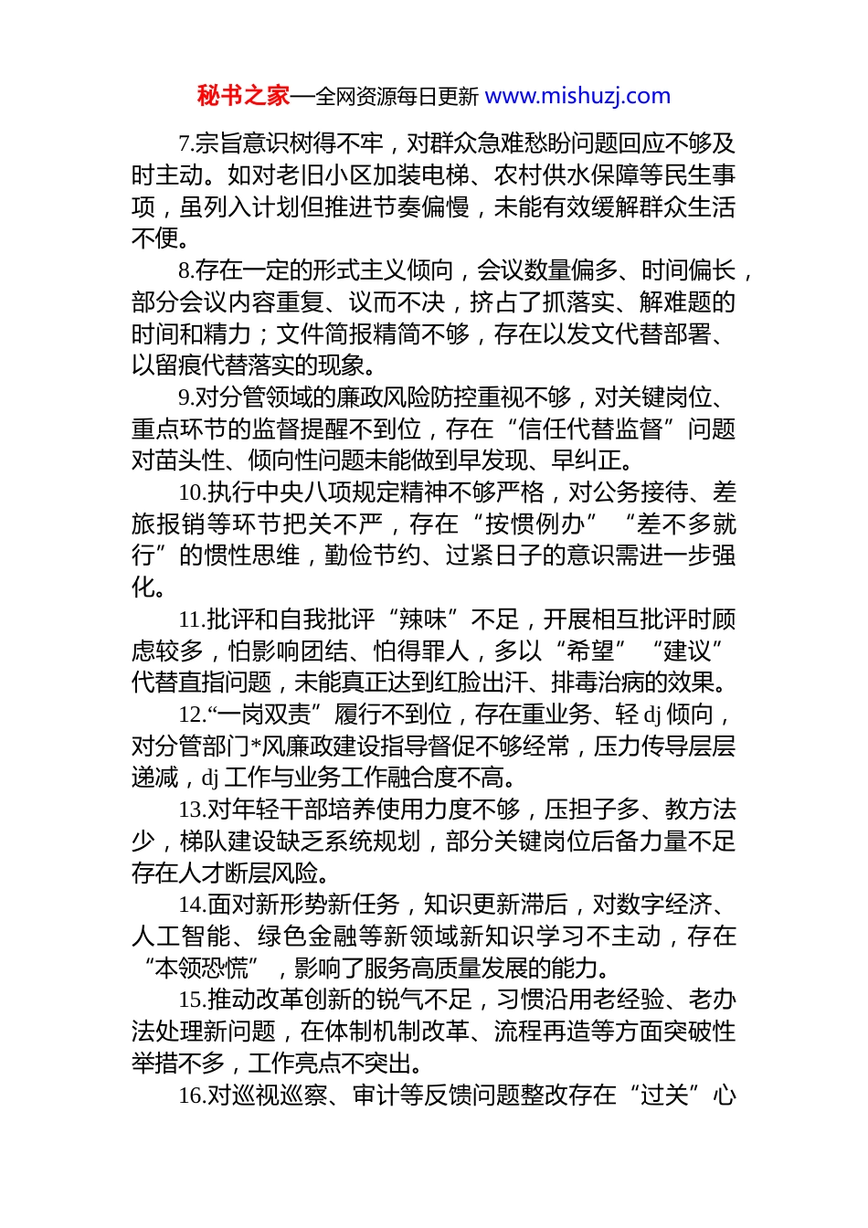 秘书之家—全网资源每日更新 www.mishuzj.com民主生活会、组织生活会互相批评意见建议集锦(113 条)1.在学习贯彻*的创新理论方面存在“学用两张皮”现象,虽然能够按时参加集体学习、完成规定篇目阅读,但结合分管领域实际开展系统性思考较少,未能有效将理论成果转化为破解发展难题的具体思路和举措,比如在推动产业转型升级中仍沿用传统路径依赖,缺乏前瞻性布局。2.政治判断力、政治领悟力有待提升,对*中央关于高质量发展的战略意图理解不够透彻,在落实“双碳”目标发展新质生产力等重大部署时,存在重表态、轻行动问题具体推进措施不够实,成效不够明显。3.贯彻民主集中制不够到位,有时在议题酝酿阶段听取班子成员意见不充分,尤其在涉及人事安排或重大项目决策时,存在先入为主倾向,影响了集体智慧的充分发挥和决策科学性。4.担当精神有所弱化,面对历史遗留问题或跨部门协调难题时,存在“绕道走”“等靠要”思想,缺乏主动牵头一抓到底的韧劲,导致个别重点工作推进缓慢,群众反映的问题久拖未决。5.工作标准不高,满足于“完成任务”而非“追求卓越”,在打造亮点、争创一流方面动力不足。例如,在优化营商环境工作中,仅满足于指标达标,未深入研究企业真实痛点,服务精准度有待提升。6.调查研究“身入”有余、“心至”不足,下基层多以听汇报、看现场为主,与普通群众、一线职工面对面交流少,对基层真实困难和诉求掌握不全面,提出的对策建议针对性、操作性不强。秘书之家—全网资源每日更新 www.mishuzj.com7.宗旨意识树得不牢,对群众急难愁盼问题回应不够及时主动。如对老旧小区加装电梯、农村供水保障等民生事项,虽列入计划但推进节奏偏慢,未能有效缓解群众生活不便。8.存在一定的形式主义倾向,会议数量偏多、时间偏长,部分会议内容重复、议而不决,挤占了抓落实、解难题的时间和精力;文件简报精简不够,存在以发文代替部署、以留痕代替落实的现象。9.对分管领域的廉政风险防控重视不够,对关键岗位、重点环节的监督提醒不到位,存在“信任代替监督”问题对苗头性、倾向性问题未能做到早发现、早纠正。10.执行中央八项规定精神不够严格,对公务接待、差旅报销等环节把关不严,存在“按惯例办”“差不多就行”的惯性思维,勤俭节约、过紧日子的意识需进一步强化。11.批评和自我批评“辣味”不足,开展相互批评时顾虑较多,怕影响团结、怕得罪人,多以“希望”“建议”代替直指问题,未能真正达到红脸出汗、排毒治病的效果。12.“一岗双责”履行不到位,存在重业务、轻 dj 倾向,对分管部门*风廉政建设指导督促不够经常,压力传导层层递减,dj 工作与业务工作融合度不高。13.对年轻干部培养使用力度不够,压担子多、教方法少,梯队建设缺乏系统规划,部分关键岗位后备力量不足存在人才断层风险。14.面对新形势新任务,知识更新滞后,对数字经济、人工智能、绿色金融等新领域新知识学习不主动,存在“本领恐慌”,影响了服务高质量发展的能力。15.推动改革创新的锐气不足,习惯沿用老经验、老办法处理新问题,在体制机制改革、流程再造等方面突破性举措不多,工作亮点不突出。16.对巡视巡察、审计等反馈问题整改存在“过关”心秘书之家—全网资源每日更新 www.mishuzj.com态,就事论事整改多,举一反三、建章立制少,长效机制建设滞后,同类问题易反复发生。17.在推动乡村振兴中统筹谋划不够,对产业发展、乡村治理、人居环境整治等重点工作协同推进不足,存在“单打一”现象,整体成效打折扣。18.服务企业意识有待加强,在招商引资和项目落地过程中,重签约轻服务,对企业后续运营中遇到的用地、用工、融资等难题协调解决不及时。19.对意识形态工作重视不够,对分管领域舆情风险研判不足,对网络空间错误言论斗争不够坚决,阵地管理存在薄弱环节。20.个人有关事项报告不够严谨细致,个别事项填报说明不清,存在漏报、模糊表述等情况,反映出纪律规矩意识需进一步增强。21.家风建设重视不够,对配偶、子女及身边工作人员教育提醒不经常,对其社会交往圈关注不多,廉洁“后院”防线需加固。22.在推动共同富裕方面思路不宽,对低收入群体增收、公共服务...