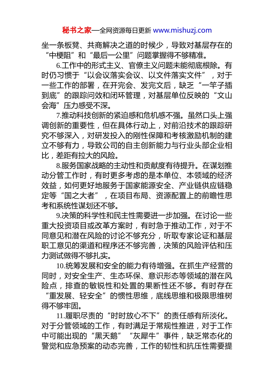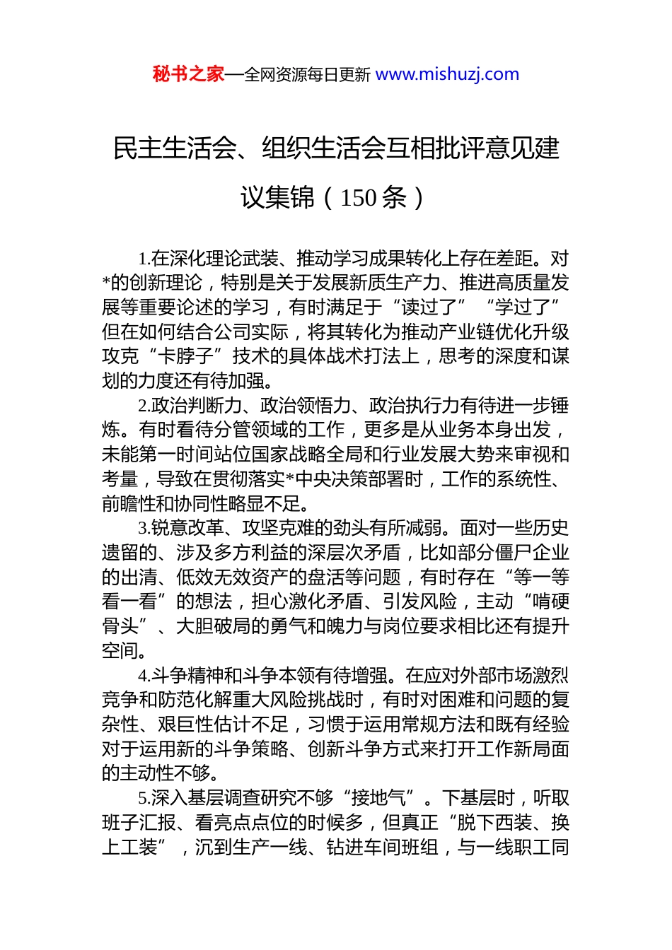 秘书之家—全网资源每日更新 www.mishuzj.com民主生活会、组织生活会互相批评意见建议集锦(150 条)1.在深化理论武装、推动学习成果转化上存在差距。对*的创新理论,特别是关于发展新质生产力、推进高质量发展等重要论述的学习,有时满足于“读过了”“学过了”但在如何结合公司实际,将其转化为推动产业链优化升级攻克“卡脖子”技术的具体战术打法上,思考的深度和谋划的力度还有待加强。2.政治判断力、政治领悟力、政治执行力有待进一步锤炼。有时看待分管领域的工作,更多是从业务本身出发,未能第一时间站位国家战略全局和行业发展大势来审视和考量,导致在贯彻落实*中央决策部署时,工作的系统性、前瞻性和协同性略显不足。3.锐意改革、攻坚克难的劲头有所减弱。面对一些历史遗留的、涉及多方利益的深层次矛盾,比如部分僵尸企业的出清、低效无效资产的盘活等问题,有时存在“等一等看一看”的想法,担心激化矛盾、引发风险,主动“啃硬骨头”、大胆破局的勇气和魄力与岗位要求相比还有提升空间。4.斗争精神和斗争本领有待增强。在应对外部市场激烈竞争和防范化解重大风险挑战时,有时对困难和问题的复杂性、艰巨性估计不足,习惯于运用常规方法和既有经验对于运用新的斗争策略、创新斗争方式来打开工作新局面的主动性不够。5.深入基层调查研究不够“接地气”。下基层时,听取班子汇报、看亮点点位的时候多,但真正“脱下西装、换上工装”,沉到生产一线、钻进车间班组,与一线职工同秘书之家—全网资源每日更新 www.mishuzj.com坐一条板凳、共商解决之道的时候少,导致对基层存在的“中梗阻”和“最后一公里”问题掌握得不够精准。6.工作中的形式主义、官僚主义问题未能彻底根除。有时仍习惯于“以会议落实会议、以文件落实文件”,对于一些工作的部署,在开完会、发完文后,缺乏“一竿子插到底”的跟踪问效和闭环管理,对基层单位反映的“文山会海”压力感受不深。7.推动科技创新的紧迫感和危机感不强。虽然口头上强调创新的重要性,但在具体行动上,对前沿技术的跟踪研究不够深入,对研发投入的刚性保障和考核激励机制的建立不够有力,导致公司的自主创新能力与行业头部企业相比,差距有拉大的风险。8.服务国家战略的主动性和贡献度有待提升。在谋划推动分管工作时,有时更多考虑的是本单位、本领域的经济效益,如何更好地服务于国家能源安全、产业链供应链稳定等“国之大者”,在项目布局、资源配置上的前瞻性思考和系统性谋划还不够。9.决策的科学性和民主性需要进一步加强。在讨论一些重大投资项目或改革方案时,有时急于推动工作,对于不同意见和潜在风险的讨论不够充分,听取专家论证和基层职工意见的渠道和程序还不够完善,决策的风险评估和压力测试做得不够扎实。10.统筹发展和安全的能力有待增强。在抓生产经营的同时,对安全生产、生态环保、意识形态等领域的潜在风险点,排查的敏锐性和处置的果断性还不够。有时存在“重发展、轻安全”的惯性思维,底线思维和极限思维树得不够牢固。11.履职尽责的“时时放心不下”的责任感有所淡化。对于分管领域的工作,有时满足于常规性推进,对于工作中可能出现的“黑天鹅”“灰犀牛”事件,缺乏常态化的警觉和应急预案的动态完善,工作的韧性和抗压性需要提秘书之家—全网资源每日更新 www.mishuzj.com升。12.推动数字化转型的力度和深度不足。对数字化赋能传统产业的理解还停留在表面,在推动数据资源整合共享打通信息孤岛、利用大数据分析优化管理流程等方面,思路不够开阔,办法不够多,导致数字化转型“雷声大、雨点小”,未能真正赋能业务。13.发扬历史主动精神不够。对于一些长期制约公司发展的体制机制障碍,有时习惯于“萧规曹随”,缺乏主动站出来、大刀阔斧进行改革的锐气。在抢抓政策机遇、谋划增量发展上,有时反应不够迅速,错失了一些发展良机。14.工作作风不够扎实,存在“重部署、轻落实”的现象。对于一些既定的重点工作,布置要求时标准很高,但在后续的督促检查、跟踪问效上投入的精力不足,导致一些好的想法和决策在执行层面打了折扣,没有完全达到预期效果。15.全局观念和协同意识有待强化。在推...