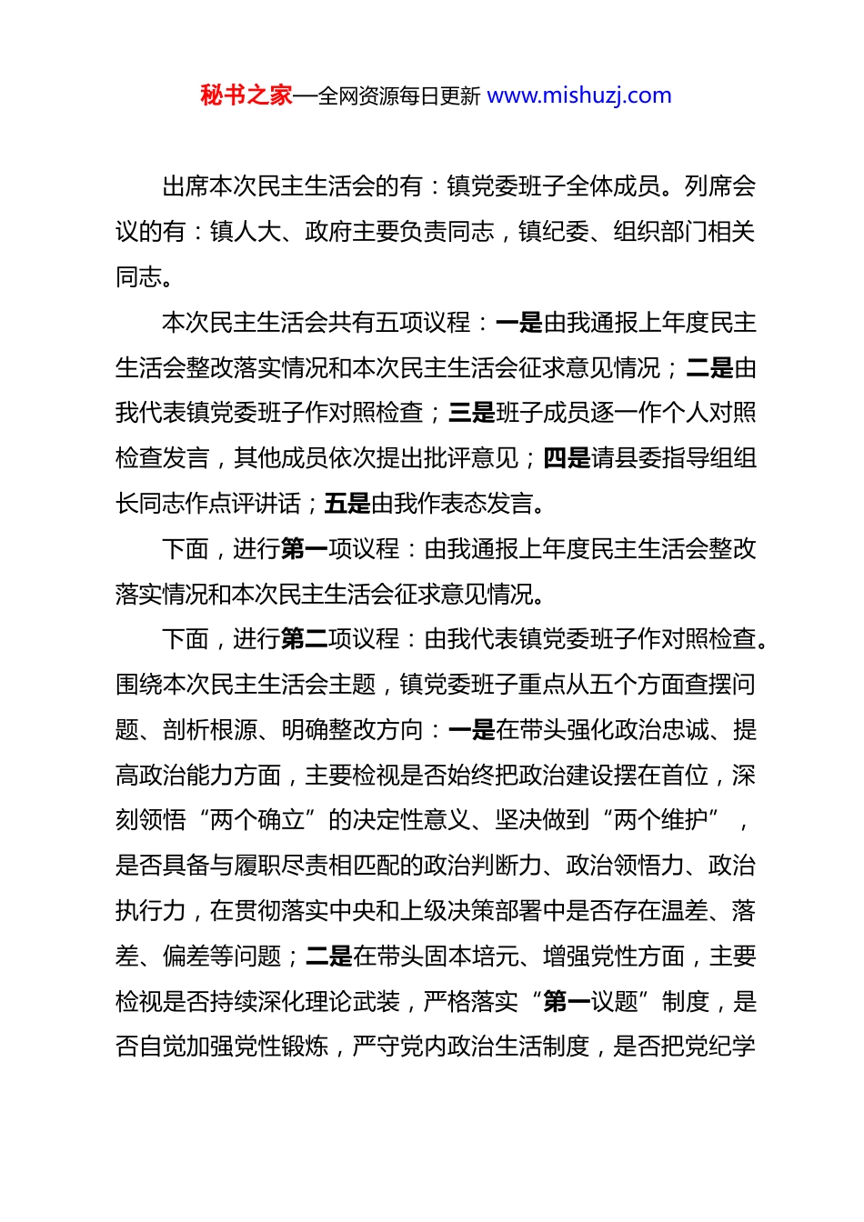 秘书之家—全网资源每日更新 www.mishuzj.com某镇 2025 年度民主生活会主持词 同志们:根据中央、省委、市委和县委统一部署,今天我们召开镇2025 年度民主生活会。本次民主生活会的主题是:深入学习贯彻习近平新时代中国特色社会主义思想,全面贯彻落实党的二十届四中全会精神,以打攻坚战、持久战的决心和恒心,锲而不舍落实中央八项规定精神,推进作风建设常态化长效化,以优良作风凝心聚力、真抓实干,奋力开创中国式现代化建设新局面。开好本次民主生活会,是深入学习贯彻党的创新理论和中央重大决策部署的重要举措,是巩固拓展深入贯彻中央八项规定精神学习教育成果的关键环节,更是加强镇领导班子自身建设、提升履职能力、推动乡镇各项工作高质量发展的必然要求。会前,镇党委严格按照要求,扎实开展理论学习、广泛征求意见建议、深入开展谈心谈话、认真撰写对照检查材料,为开好本次民主生活会筑牢了思想基础和工作基础。今天会议有幸邀请到县委指导组组长同志及指导组各位成员莅临指导,让我们以热烈的掌声对指导组的到来表示欢迎和感谢!秘书之家—全网资源每日更新 www.mishuzj.com出席本次民主生活会的有:镇党委班子全体成员。列席会议的有:镇人大、政府主要负责同志,镇纪委、组织部门相关同志。本次民主生活会共有五项议程:一是由我通报上年度民主生活会整改落实情况和本次民主生活会征求意见情况;二是由我代表镇党委班子作对照检查;三是班子成员逐一作个人对照检查发言,其他成员依次提出批评意见;四是请县委指导组组长同志作点评讲话;五是由我作表态发言。下面,进行第一项议程:由我通报上年度民主生活会整改落实情况和本次民主生活会征求意见情况。下面,进行第二项议程:由我代表镇党委班子作对照检查。围绕本次民主生活会主题,镇党委班子重点从五个方面查摆问题、剖析根源、明确整改方向:一是在带头强化政治忠诚、提高政治能力方面,主要检视是否始终把政治建设摆在首位,深刻领悟“两个确立”的决定性意义、坚决做到“两个维护”,是否具备与履职尽责相匹配的政治判断力、政治领悟力、政治执行力,在贯彻落实中央和上级决策部署中是否存在温差、落差、偏差等问题;二是在带头固本培元、增强党性方面,主要检视是否持续深化理论武装,严格落实“第一议题”制度,是否自觉加强党性锻炼,严守党内政治生活制度,是否把党纪学秘书之家—全网资源每日更新 www.mishuzj.com习教育成果转化为坚定理想信念、锤炼优良作风的实际行动等问题;三是在带头敬畏人民、敬畏组织、敬畏法纪方面,主要检视是否牢固树立以人民为中心的发展思想,切实解决群众急难愁盼问题,是否严格遵守组织原则和程序,自觉接受组织监督,是否知敬畏、存戒惧、守底线,严格执行廉洁自律各项规定等问题;四是在带头干事创业、担当作为方面,主要检视是否以打攻坚战、持久战的决心推动乡镇重点工作,是否敢于直面矛盾、善于破解难题,在推进乡村振兴、基层治理、民生保障等工作中是否存在不作为、慢作为、乱作为等问题;五是在带头坚决扛起管党治党责任方面,主要检视是否认真履行全面从严治党“第一责任人”职责和“一岗双责”,是否扎实推进作风建设常态化长效化,是否严格抓好分管领域党风廉政建设,对苗头性、倾向性问题是否做到抓早抓小、防微杜渐等问题。下面,进行第三项议程:班子成员逐一作个人对照检查发言,其他成员提出批评意见。发言顺序为:我先发言,然后依次是*同志、*同志……每位同志发言后,其他成员本着对党、对事业、对同志高度负责的态度,直截了当提出批评意见,做到“红脸出汗、排毒治病”,杜绝“好人主义”和走过场。自我批评要把自己摆进去、把职责摆进去、把工作摆进去,开门见山、直面问题,不避重就轻、不遮遮掩掩;相互批评要实事求秘书之家—全网资源每日更新 www.mishuzj.com是、直指要害,体现“团结—批评—团结”的方针。首先,由我作个人对照检查发言,请大家对我提出批评意见。感谢大家的批评意见,我全部接受,将在今后工作中认真整改落实。下面,请*同志作个人对照检查发言,其他同志作好批评准备。请大家对*同志提出批评意见。感谢大家...