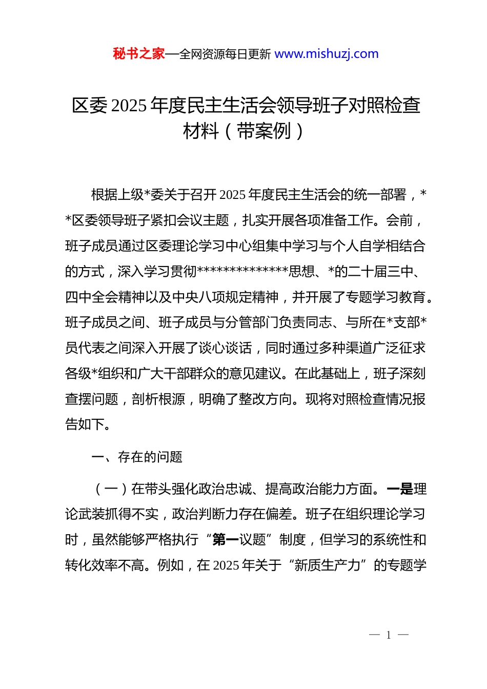 秘书之家—全网资源每日更新 www.mishuzj.com区委 2025 年度民主生活会领导班子对照检查材料(带案例)根据上级*委关于召开 2025 年度民主生活会的统一部署,**区委领导班子紧扣会议主题,扎实开展各项准备工作。会前,班子成员通过区委理论学习中心组集中学习与个人自学相结合的方式,深入学习贯彻**************思想、*的二十届三中、四中全会精神以及中央八项规定精神,并开展了专题学习教育。班子成员之间、班子成员与分管部门负责同志、与所在*支部*员代表之间深入开展了谈心谈话,同时通过多种渠道广泛征求各级*组织和广大干部群众的意见建议。在此基础上,班子深刻查摆问题,剖析根源,明确了整改方向。现将对照检查情况报告如下。一、存在的问题(一)在带头强化政治忠诚、提高政治能力方面。一是理论武装抓得不实,政治判断力存在偏差。班子在组织理论学习时,虽然能够严格执行“第一议题”制度,但学习的系统性和转化效率不高。例如,在 2025 年关于“新质生产力”的专题学— 1 —秘书之家—全网资源每日更新 www.mishuzj.com习研讨中,部分班子成员对这一核心概念的理解仍停留在政策文件的表层解读,未能紧密结合我区“中国环境谷”等产业集群的实际,深入思考如何通过颠覆性技术和前沿技术催生新产业、新模式、新动能,导致在后续的一些产业政策讨论中,仍然沿用支持传统环保企业的旧思路,对科技创新驱动的认识深度和敏感度不够。这种理论学习与实践运用之间的“温差”,影响了政治判断的精准性。二是决策部署落得不准,政治领悟力存在时差。对标对表中央大政方针和省市委工作要求的精度有欠缺,未能完全做到从政治高度和全局视角谋划推进工作。2025 年,在推进全域科创战略过程中,区委虽然强调要构建“科创+”创新体系,但在具体项目引进上,曾出现过度追求短期投资额和税收贡献的倾向。在一次重大招商项目评审会上,一个投资额达 30 亿元的传统制造业项目与一个投资额 5 亿元但掌握核心环保技术的初创科技企业之间产生争议,班子内部一度因前者能迅速填补年度招商引资指标而倾向于优先落地,这反映出对中央关于高质量发展和新质生产力核心要义的领悟存在“时差”,未能将长远发展潜力置于首要位置。三是风险防范做得不严,政治执行力存在落差。对一些领域潜在的政治风险洞察不够敏锐,底线思维树得不牢。在推进城市更新和重点片区建设过程中,虽然总体进展顺利,但也暴露出风险预判不— 2 —秘书之家—全网资源每日更新 www.mishuzj.com足的问题。例如,**街道老旧小区改造项目启动前,虽然履行了征求意见程序,但对少数群众因历史遗留问题可能引发的群体性情绪研判不充分,导致项目初期遭遇较大阻力,耗费了大量行政资源进行协调,影响了工程进度。这表明在贯彻执行上级决策部署时,对潜在的社会稳定风险识别不够深入,政治执行的前瞻性和穿透力不强,存在“只求执行、不计后果”的偏差。(二)在带头固本培元、增强*性方面。一是理想信念“总开关”拧得不紧。*性教育的模式较为单一,满足于完成规定动作,对新时代*员干部思想动态的把握不够精准,导致教育效果未入脑入心。2025 年组织的几次*性教育活动,仍然以“报告式”“灌输式”为主,形式创新不足,对年轻干部的吸引力和感染力不强。据统计,2025 年区管干部年度培训中,关于*史和理想信念教育的课程平均满意度为 89%,低于经济发展、城市管理等业务类课程 95%的平均满意度,反映出在锤炼*性上存在“重业务、轻政治”的潜在倾向。二是*性修养“练内功”练得不勤。部分班子成员在实践中锤炼*性的自觉性不够,未能时时处处以*性原则检视言行。在处理一些复杂棘手问题时,有时首先考虑的是如何“稳妥”地规避矛盾,而不是如何从*性原— 3 —秘书之家—全网资源每日更新 www.mishuzj.com则出发担当作为。例如,在处理**开发区两家企业因排污指标产生的长期纠纷时,相关分管领导长达半年时间未能下决心作出裁决,反复协调,希望“和稀泥”,暴露出在直面矛盾、坚持原则的*性锻炼上存在“软肋”,斗争精神不足。三是纪律规矩“高压线”架得不牢。对*章*规 dj 的学习不够深入,未能真...