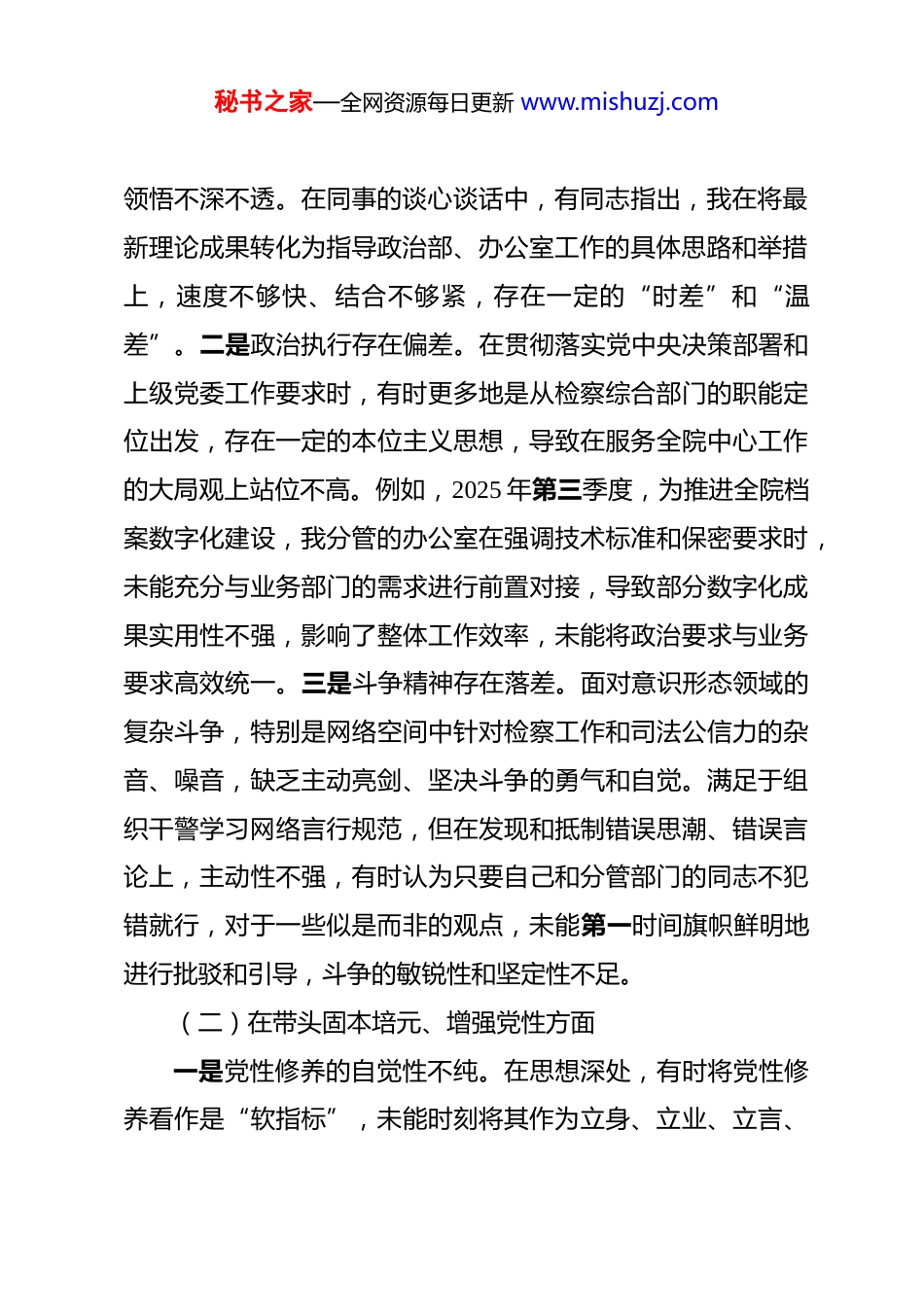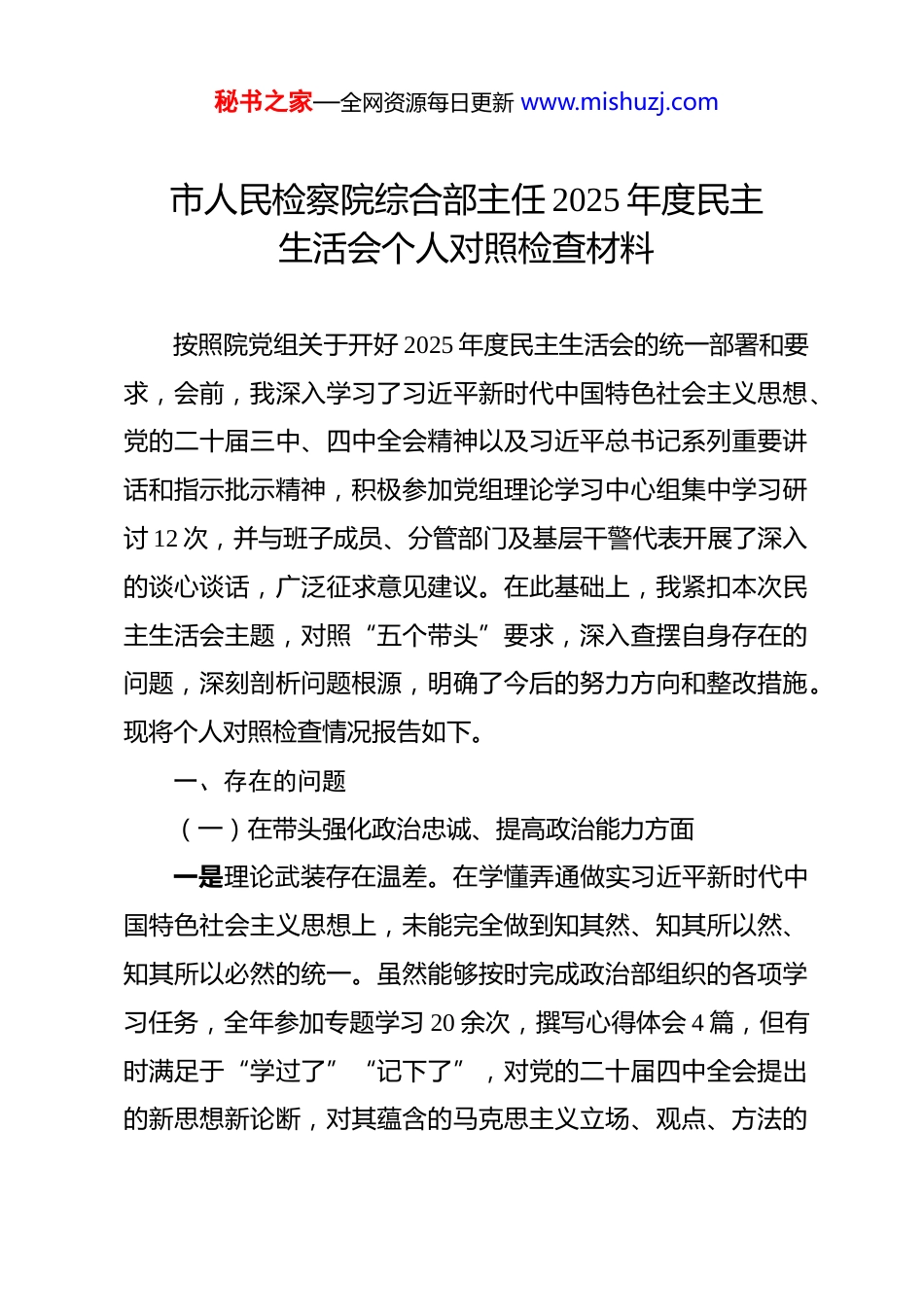 秘书之家—全网资源每日更新 www.mishuzj.com市人民检察院综合部主任 2025 年度民主生活会个人对照检查材料 按照院党组关于开好 2025 年度民主生活会的统一部署和要求,会前,我深入学习了习近平新时代中国特色社会主义思想、党的二十届三中、四中全会精神以及习近平总书记系列重要讲话和指示批示精神,积极参加党组理论学习中心组集中学习研讨 12 次,并与班子成员、分管部门及基层干警代表开展了深入的谈心谈话,广泛征求意见建议。在此基础上,我紧扣本次民主生活会主题,对照“五个带头”要求,深入查摆自身存在的问题,深刻剖析问题根源,明确了今后的努力方向和整改措施。现将个人对照检查情况报告如下。一、存在的问题(一)在带头强化政治忠诚、提高政治能力方面一是理论武装存在温差。在学懂弄通做实习近平新时代中国特色社会主义思想上,未能完全做到知其然、知其所以然、知其所以必然的统一。虽然能够按时完成政治部组织的各项学习任务,全年参加专题学习 20 余次,撰写心得体会 4 篇,但有时满足于“学过了”“记下了”,对党的二十届四中全会提出的新思想新论断,对其蕴含的马克思主义立场、观点、方法的秘书之家—全网资源每日更新 www.mishuzj.com领悟不深不透。在同事的谈心谈话中,有同志指出,我在将最新理论成果转化为指导政治部、办公室工作的具体思路和举措上,速度不够快、结合不够紧,存在一定的“时差”和“温差”。二是政治执行存在偏差。在贯彻落实党中央决策部署和上级党委工作要求时,有时更多地是从检察综合部门的职能定位出发,存在一定的本位主义思想,导致在服务全院中心工作的大局观上站位不高。例如,2025 年第三季度,为推进全院档案数字化建设,我分管的办公室在强调技术标准和保密要求时,未能充分与业务部门的需求进行前置对接,导致部分数字化成果实用性不强,影响了整体工作效率,未能将政治要求与业务要求高效统一。三是斗争精神存在落差。面对意识形态领域的复杂斗争,特别是网络空间中针对检察工作和司法公信力的杂音、噪音,缺乏主动亮剑、坚决斗争的勇气和自觉。满足于组织干警学习网络言行规范,但在发现和抵制错误思潮、错误言论上,主动性不强,有时认为只要自己和分管部门的同志不犯错就行,对于一些似是而非的观点,未能第一时间旗帜鲜明地进行批驳和引导,斗争的敏锐性和坚定性不足。(二)在带头固本培元、增强党性方面一是党性修养的自觉性不纯。在思想深处,有时将党性修养看作是“软指标”,未能时刻将其作为立身、立业、立言、秘书之家—全网资源每日更新 www.mishuzj.com立德的基石。在繁忙的行政事务工作中,容易陷入事务主义,把更多的精力放在了办公室的文件流转、会务安排和政治部的干部考察、宣传报道等具体工作上,静下心来改造主观世界、锤炼党性的时间和投入相对不足,导致党性锻炼的时效性和系统性不强。二是纪律规矩的敬畏心不深。对党章党规党纪的学习,多停留在集中学习和通报学习的层面,个人精读细研不够,未能完全将纪律要求内化为思想自觉和行动自觉。在分管工作中,虽然组织开展了中央八项规定精神专题学习教育,但在日常监督管理上,有时失之于宽、失之于软。2025 年,政治部一名年轻干部因对新媒体宣传工作有畏难情绪,连续两周未能按时完成工作计划,我仅进行了口头提醒,而未启动相应的效能问责程序,体现出执行纪律的刚性不足。三是精神追求的境界不高。对照革命先辈和先进典型,感到自身在精神追求上还有较大差距。有时随着工作年限的增长,革命热情和奋斗激情有所消退,存在“船到码头车到站”的松劲思想。处理日常工作时,习惯于凭经验办事,开拓创新、锐意进取的精神状态有所下滑,未能时时以共产党人应有的精神境界来要求自己,艰苦奋斗、无私奉献的精神有所淡化。(三)在带头敬畏人民、敬畏组织、敬畏法纪方面一是深入基层服务群众不实。践行新时代党的群众路线存秘书之家—全网资源每日更新 www.mishuzj.com在“温差”,落实“四下基层”制度不扎实。2025 年全年,我带队下基层调研 8 次,但真正沉下身子与群众面对面交流的时间占比不足 30%。比如在去年 10 月赴*...