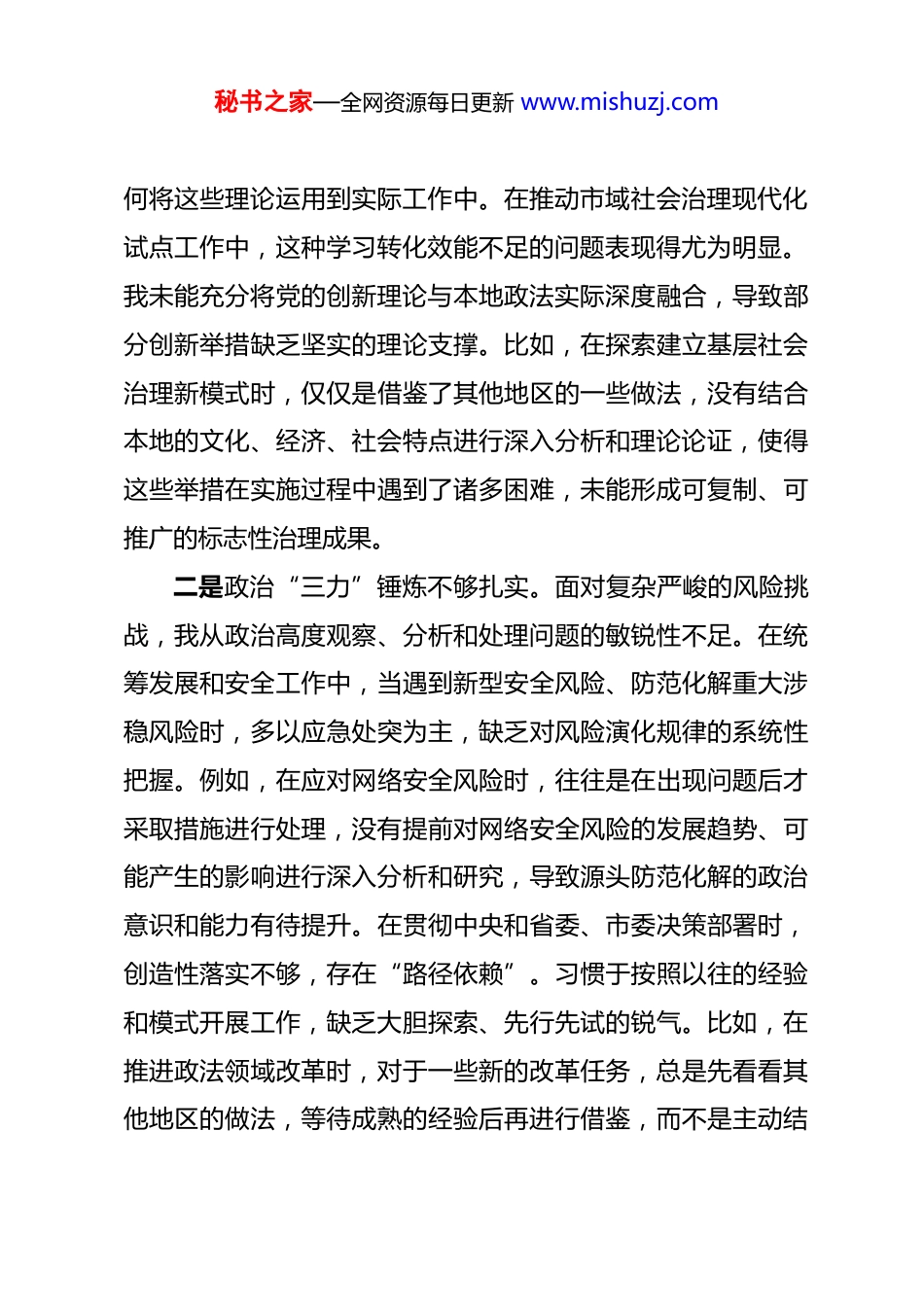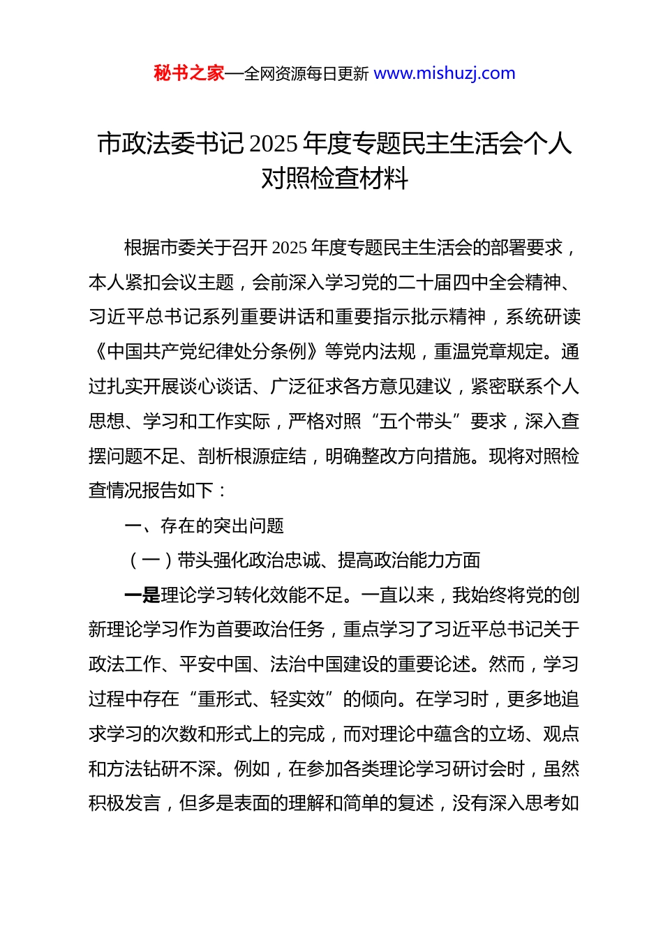 秘书之家—全网资源每日更新 www.mishuzj.com市政法委书记 2025 年度专题民主生活会个人对照检查材料 根据市委关于召开 2025 年度专题民主生活会的部署要求,本人紧扣会议主题,会前深入学习党的二十届四中全会精神、习近平总书记系列重要讲话和重要指示批示精神,系统研读《中国共产党纪律处分条例》等党内法规,重温党章规定。通过扎实开展谈心谈话、广泛征求各方意见建议,紧密联系个人思想、学习和工作实际,严格对照“五个带头”要求,深入查摆问题不足、剖析根源症结,明确整改方向措施。现将对照检查情况报告如下:一、存在的突出问题(一)带头强化政治忠诚、提高政治能力方面一是理论学习转化效能不足。一直以来,我始终将党的创新理论学习作为首要政治任务,重点学习了习近平总书记关于政法工作、平安中国、法治中国建设的重要论述。然而,学习过程中存在“重形式、轻实效”的倾向。在学习时,更多地追求学习的次数和形式上的完成,而对理论中蕴含的立场、观点和方法钻研不深。例如,在参加各类理论学习研讨会时,虽然积极发言,但多是表面的理解和简单的复述,没有深入思考如秘书之家—全网资源每日更新 www.mishuzj.com何将这些理论运用到实际工作中。在推动市域社会治理现代化试点工作中,这种学习转化效能不足的问题表现得尤为明显。我未能充分将党的创新理论与本地政法实际深度融合,导致部分创新举措缺乏坚实的理论支撑。比如,在探索建立基层社会治理新模式时,仅仅是借鉴了其他地区的一些做法,没有结合本地的文化、经济、社会特点进行深入分析和理论论证,使得这些举措在实施过程中遇到了诸多困难,未能形成可复制、可推广的标志性治理成果。二是政治“三力”锤炼不够扎实。面对复杂严峻的风险挑战,我从政治高度观察、分析和处理问题的敏锐性不足。在统筹发展和安全工作中,当遇到新型安全风险、防范化解重大涉稳风险时,多以应急处突为主,缺乏对风险演化规律的系统性把握。例如,在应对网络安全风险时,往往是在出现问题后才采取措施进行处理,没有提前对网络安全风险的发展趋势、可能产生的影响进行深入分析和研究,导致源头防范化解的政治意识和能力有待提升。在贯彻中央和省委、市委决策部署时,创造性落实不够,存在“路径依赖”。习惯于按照以往的经验和模式开展工作,缺乏大胆探索、先行先试的锐气。比如,在推进政法领域改革时,对于一些新的改革任务,总是先看看其他地区的做法,等待成熟的经验后再进行借鉴,而不是主动结秘书之家—全网资源每日更新 www.mishuzj.com合本地实际进行创新探索,导致改革的步伐不够快,效果不够理想。三是政治纪律刚性约束不强。虽然我能带头遵守党的各项纪律,但对分管领域、身边同志中苗头性、倾向性问题的政治危害性认识不够深刻,抓早抓小、防微杜渐的力度不足。在日常工作中,对于一些同志在工作态度、工作作风方面出现的小问题,没有及时进行严肃的批评和纠正,认为这些都是小毛病,不会造成严重的后果。以最高政治标准衡量检视工作成效的自觉性不够,在将政治要求贯穿政法工作全过程各环节时,精准度和实效性有待进一步提高。例如,在对一些重大案件的办理过程中,虽然强调了政治方向和政治原则,但在具体的工作落实中,没有将政治要求细化到每一个工作环节,导致部分工作在执行过程中出现了偏差。(二)带头固本培元、增强党性方面一是党性修养自觉性不足。我对新时代党性锻炼的长期性、艰巨性认识不到位,常以事务性工作代替党性锤炼。在工作中,总是把大部分时间和精力放在处理具体的事务上,认为只要把工作做好了,党性修养自然就会提高。参加党内政治生活存在“事务主义”倾向,批评与自我批评“辣味”不足。在自我批评时,未能深挖思想根源,只是简单地列举一些表面的问题,秘书之家—全网资源每日更新 www.mishuzj.com没有从世界观、人生观、价值观层面深刻反省。在支部组织生活会上,对于自身调查研究不深入、联系基层不紧密等问题,只是轻描淡写地提了一下,没有认真分析这些问题产生的深层次原因,也没有制定切实可行的整改措施。相互批评时,顾及情面、点到为止,难以达到“红脸出汗、排毒...