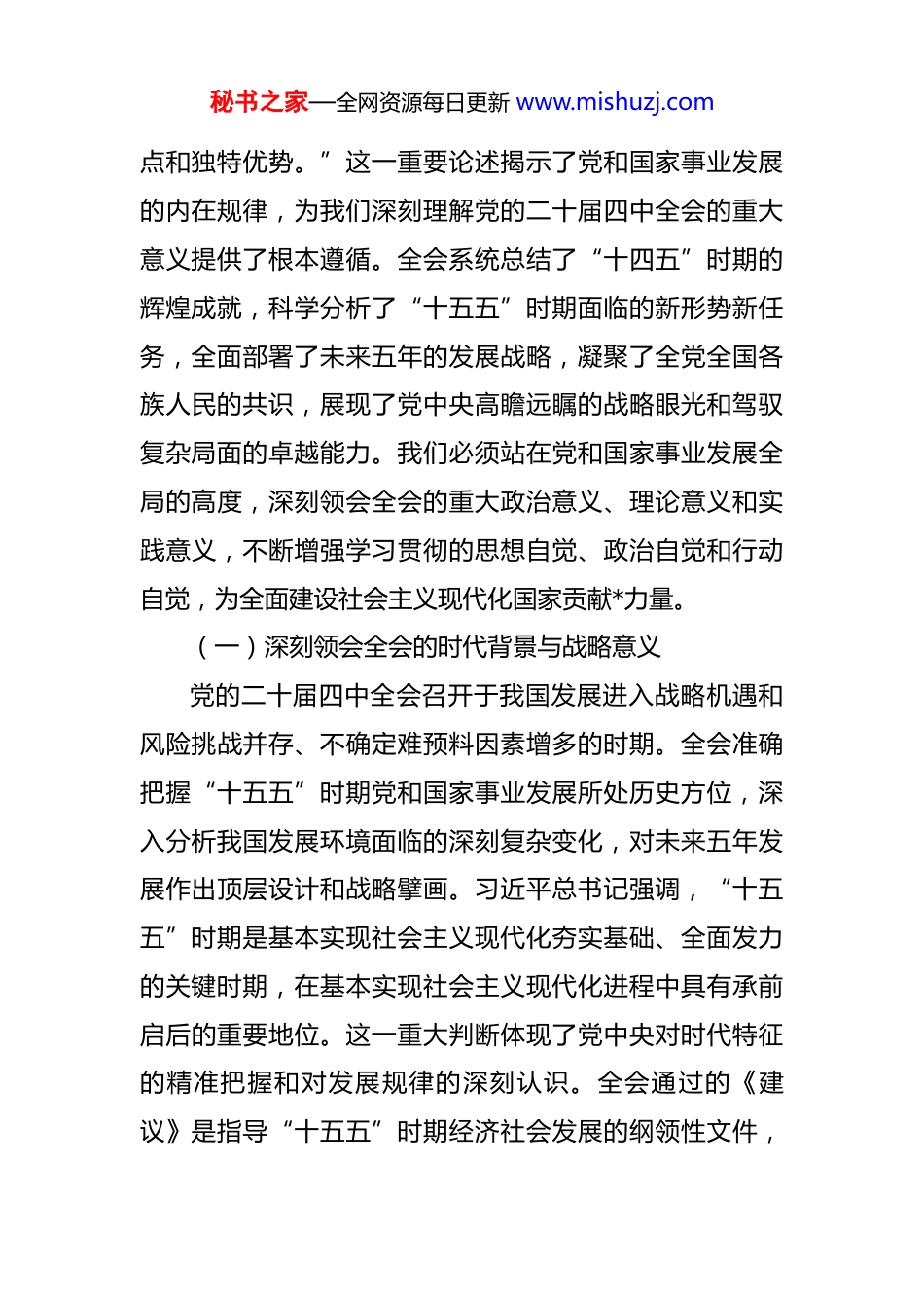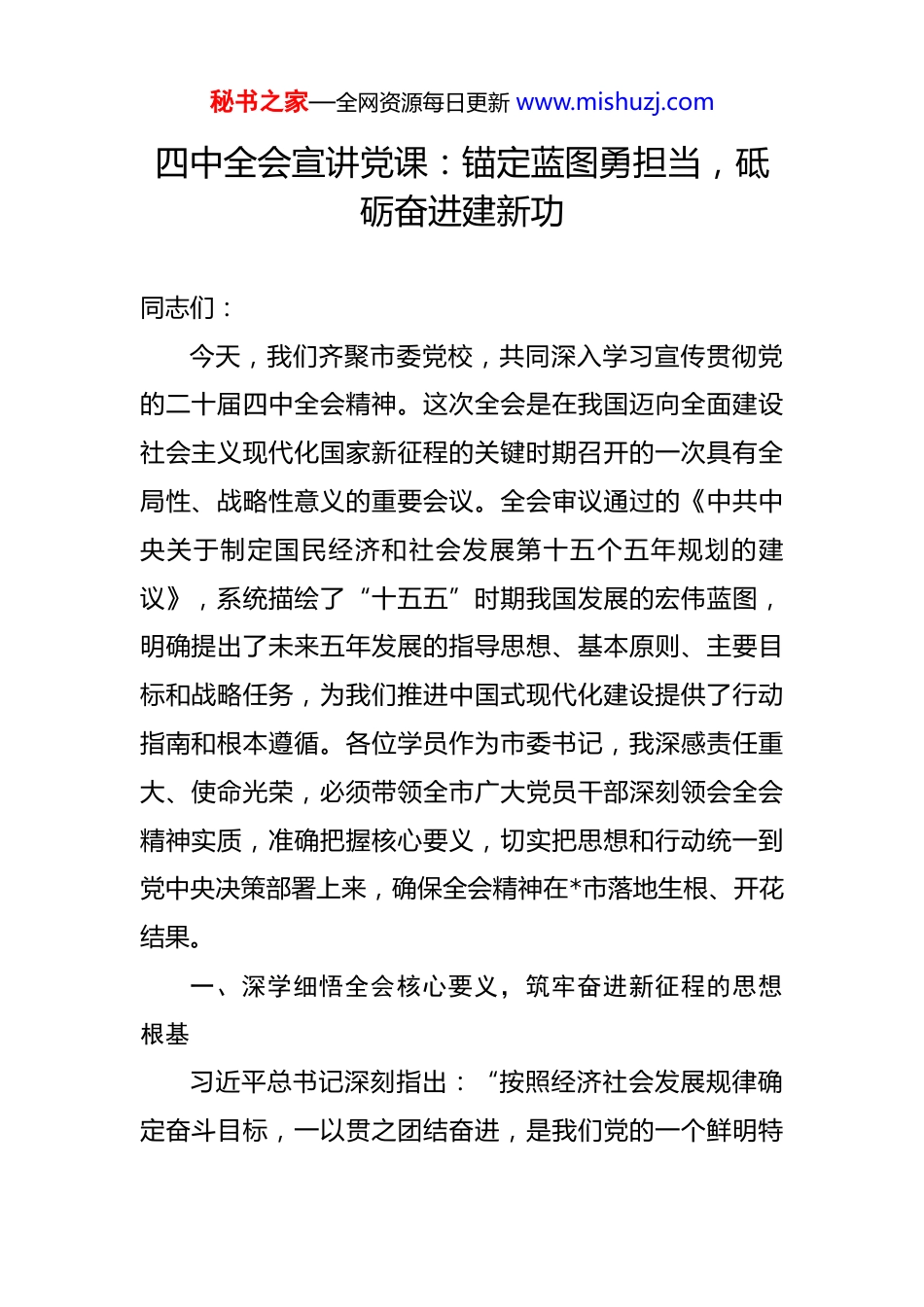 秘书之家—全网资源每日更新 www.mishuzj.com四中全会宣讲党课:锚定蓝图勇担当,砥砺奋进建新功同志们:今天,我们齐聚市委党校,共同深入学习宣传贯彻党的二十届四中全会精神。这次全会是在我国迈向全面建设社会主义现代化国家新征程的关键时期召开的一次具有全局性、战略性意义的重要会议。全会审议通过的《中共中央关于制定国民经济和社会发展第十五个五年规划的建议》,系统描绘了“十五五”时期我国发展的宏伟蓝图,明确提出了未来五年发展的指导思想、基本原则、主要目标和战略任务,为我们推进中国式现代化建设提供了行动指南和根本遵循。各位学员作为市委书记,我深感责任重大、使命光荣,必须带领全市广大党员干部深刻领会全会精神实质,准确把握核心要义,切实把思想和行动统一到党中央决策部署上来,确保全会精神在*市落地生根、开花结果。一、深学细悟全会核心要义,筑牢奋进新征程的思想根基习近平总书记深刻指出:“按照经济社会发展规律确定奋斗目标,一以贯之团结奋进,是我们党的一个鲜明特秘书之家—全网资源每日更新 www.mishuzj.com点和独特优势。”这一重要论述揭示了党和国家事业发展的内在规律,为我们深刻理解党的二十届四中全会的重大意义提供了根本遵循。全会系统总结了“十四五”时期的辉煌成就,科学分析了“十五五”时期面临的新形势新任务,全面部署了未来五年的发展战略,凝聚了全党全国各族人民的共识,展现了党中央高瞻远瞩的战略眼光和驾驭复杂局面的卓越能力。我们必须站在党和国家事业发展全局的高度,深刻领会全会的重大政治意义、理论意义和实践意义,不断增强学习贯彻的思想自觉、政治自觉和行动自觉,为全面建设社会主义现代化国家贡献*力量。(一)深刻领会全会的时代背景与战略意义党的二十届四中全会召开于我国发展进入战略机遇和风险挑战并存、不确定难预料因素增多的时期。全会准确把握“十五五”时期党和国家事业发展所处历史方位,深入分析我国发展环境面临的深刻复杂变化,对未来五年发展作出顶层设计和战略擘画。习近平总书记强调,“十五五”时期是基本实现社会主义现代化夯实基础、全面发力的关键时期,在基本实现社会主义现代化进程中具有承前启后的重要地位。这一重大判断体现了党中央对时代特征的精准把握和对发展规律的深刻认识。全会通过的《建议》是指导“十五五”时期经济社会发展的纲领性文件,秘书之家—全网资源每日更新 www.mishuzj.com充分体现了习近平新时代中国特色社会主义思想的世界观和方法论,贯穿了立足新发展阶段、完整准确全面贯彻新发展理念、构建新发展格局的内在要求。我们要深刻认识到,学习贯彻全会精神是当前和今后一个时期全党全国的重大政治任务,必须精心组织、周密部署,确保全会精神入脑入心、见行见效。“十四五”时期我国发展历程极不寻常、极不平凡。面对错综复杂的国际形势和艰巨繁重的国内改革发展稳定任务,以习近平同志为核心的党中央团结带领全党全国各族人民,迎难而上、砥砺前行,推动党和国家事业取得新的重大成就。我国经济实力、科技实力、综合国力跃上新台阶,中国式现代化迈出新的坚实步伐。经济总量连续跨越110 万亿元、120 万亿元、130 万亿元台阶,预计 2025年底达到 140 万亿元左右;全球创新指数排名跃升至第 10名,成为创新力提升最快的经济体之一;人均国内生产总值连续两年超过 1.3 万美元。这些成就的取得,根本在于习近平总书记掌舵领航,在于习近平新时代中国特色社会主义思想科学指引。实践证明,“两个确立”对于我们应对各种风险挑战、推进中国式现代化具有决定性意义,是新时代新征程推进中国式现代化、续写两大奇迹新篇章的根本政治保证。秘书之家—全网资源每日更新 www.mishuzj.com(二)准确把握“十五五”时期的指导原则与目标任务“十五五”时期经济社会发展必须坚持马克思列宁主义、毛泽东思想、邓小平理论、“三个代表”重要思想、科学发展观,全面贯彻习近平新时代中国特色社会主义思想,深入贯彻党的二十大和二十届历次全会精神。全会提出的“五个以”“两个推动”“一个确保”要求,构成了有机统一的整体,明确了“十五五”时期经济...