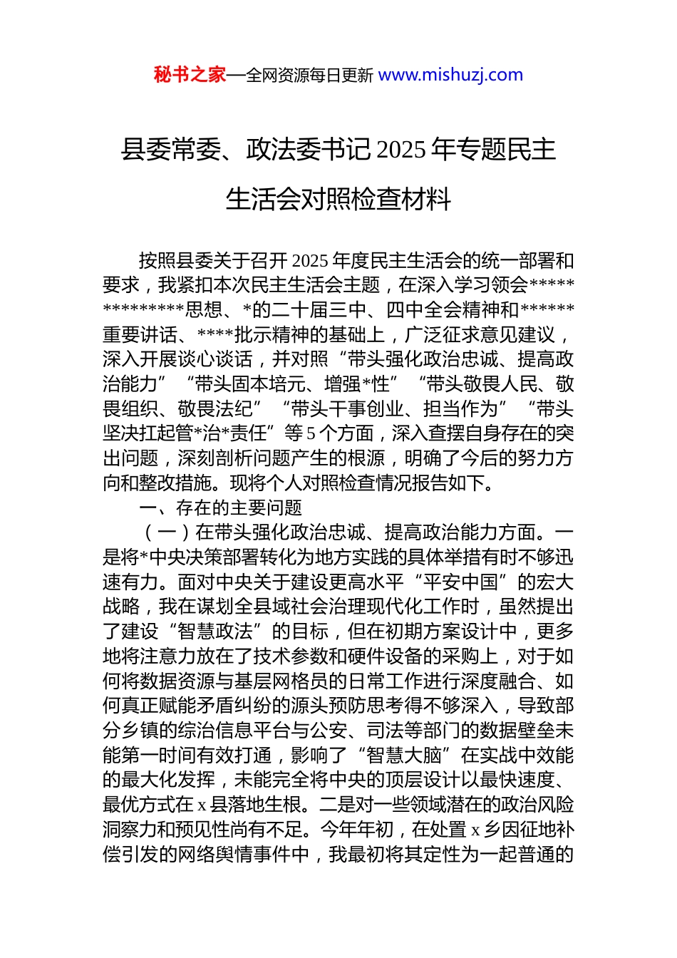 秘书之家—全网资源每日更新 www.mishuzj.com县委常委、政法委书记 2025 年专题民主生活会对照检查材料按照县委关于召开 2025 年度民主生活会的统一部署和要求,我紧扣本次民主生活会主题,在深入学习领会**************思想、*的二十届三中、四中全会精神和******重要讲话、****批示精神的基础上,广泛征求意见建议,深入开展谈心谈话,并对照“带头强化政治忠诚、提高政治能力”“带头固本培元、增强*性”“带头敬畏人民、敬畏组织、敬畏法纪”“带头干事创业、担当作为”“带头坚决扛起管*治*责任”等 5 个方面,深入查摆自身存在的突出问题,深刻剖析问题产生的根源,明确了今后的努力方向和整改措施。现将个人对照检查情况报告如下。一、存在的主要问题(一)在带头强化政治忠诚、提高政治能力方面。一是将*中央决策部署转化为地方实践的具体举措有时不够迅速有力。面对中央关于建设更高水平“平安中国”的宏大战略,我在谋划全县域社会治理现代化工作时,虽然提出了建设“智慧政法”的目标,但在初期方案设计中,更多地将注意力放在了技术参数和硬件设备的采购上,对于如何将数据资源与基层网格员的日常工作进行深度融合、如何真正赋能矛盾纠纷的源头预防思考得不够深入,导致部分乡镇的综治信息平台与公安、司法等部门的数据壁垒未能第一时间有效打通,影响了“智慧大脑”在实战中效能的最大化发挥,未能完全将中央的顶层设计以最快速度、最优方式在 x 县落地生根。二是对一些领域潜在的政治风险洞察力和预见性尚有不足。今年年初,在处置 x 乡因征地补偿引发的网络舆情事件中,我最初将其定性为一起普通的秘书之家—全网资源每日更新 www.mishuzj.com民事经济纠纷,主要指令相关部门做好政策解释和矛盾化解工作。但对事件背后可能存在的、被别有用心之人利用进而发酵升级为影响社会稳定重大风险的政治属性认识不足,未能第一时间启动多部门联动的舆情引导和风险管控预案,导致在事件处置初期一度陷入被动,错失了最佳的引导时机,反映出自身在复杂局面下由表及里、见微知著的政治敏锐性仍需锤炼。三是在将理论学习成果高效转化为指导政法工作实践的能力上存在差距。虽然能够坚持学习领会总体国家安全观,但在实际工作中,运用其指导防范化解重大风险的系统性思维还不够。例如,在牵头组织全县防范化解金融风险专项行动中,我的工作着力点更多地放在了对已经暴露的非法集资案件的打击处置和善后维稳上,对于如何运用总体国家安全观的思维,建立健全一个覆盖市场监管、金融、公安等多部门信息共享的早期预警识别和联动干预机制,从而做到“防患于未然”,谋划得不够超前、推动得不够有力。(二)在带头固本培元、增强*性方面。一是理论学习的系统性和钻研深度有待加强。在参加县委理论学习中心组集体学习时,我往往能够认真完成规定的学习篇目,并结合分管工作准备发言提纲,但静下心来系统研读原著、全面把握理论体系的“挤”和“钻”的劲头有所减弱。有时满足于对基本观点和核心词汇的掌握,而没有投入足够精力去深入探究贯穿其中的马克思主义立场、观点、方法导致对一些重大理论问题的历史逻辑、理论逻辑和实践逻辑的理解还不够透彻,用*的创新理论武装头脑、指导实践的根基扎得还不够牢。二是对照*章*规 dj 进行自我检视的标尺不够严格。随着工作阅历的增长,有时会不自觉地产生一种“经验主义”思想,认为自己多年来能够守住底线没有出过大问题,在思想深处对一些细微之处的*性锤炼有所放松。例如,在连续高强度完成扫黑除恶专项斗争督导等急难险重任务后,偶尔会产生“歇歇脚、松口气”的念秘书之家—全网资源每日更新 www.mishuzj.com头,在每日反躬自省、净化思想方面有所懈怠,没有真正做到将*性修养内化为一种高度的政治自觉和生活习惯,时时刻刻以*员的最高标准来要求自己。三是将*性修养与人民立场深度融合的自觉性需要提升。在推进“我为群众办实事”实践活动中,我牵头推动了覆盖全县的公共法律服务体系建设,将法律援助工作站建到了每个乡镇。但在工作初期,我更多地关注了工作站点的覆盖率、派驻律师的人数等可量化的“硬件”指标,而对于偏...