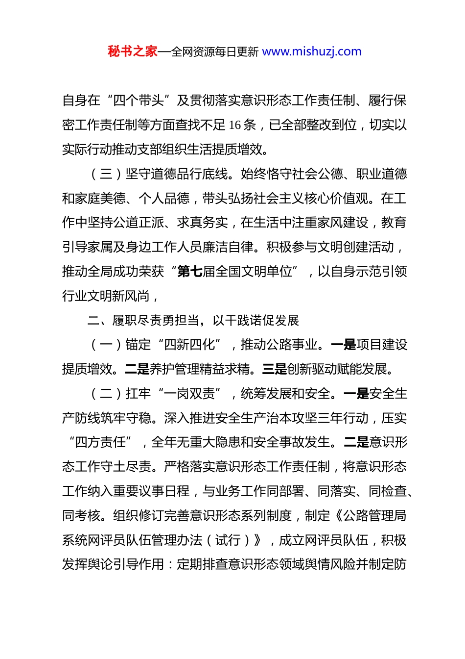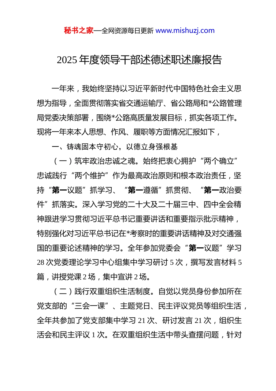 秘书之家—全网资源每日更新 www.mishuzj.com2025 年度领导干部述德述职述廉报告 一年来,我始终坚持以习近平新时代中国特色社会主义思想为指导,全面贯彻落实省交通运输厅、省公路局和*公路管理局党委决策部署,围绕*公路高质量发展目标,抓实各项工作。现将一年来本人思想、作风、履职等方面情况汇报如下,一、铸魂固本守初心,以德立身强根基(一)筑牢政治忠诚之魂。始终把衷心拥护“两个确立”忠诚践行“两个维护”作为最高政治原则和根本政治责任,坚持“第一议题”抓学习、“第一遵循”抓贯彻、“第一政治要件”抓落实。深入学习党的二十大及二十届三中、四中全会精神跟进学习贯彻习近平总书记重要讲话和重要指示批示精神,特别强化对习近平总书记在*考察时的重要讲话精神及对交通强国的重要论述精神的学习。全年参加党委会“第一议题”学习28 次党委理论学习中心组集中学习研讨 5 次,撰写发言材料 5篇,讲授党课 2 场,集中宣讲 2 场。(二)践行双重组织生活制度。自觉以党员身份参加所在党支部的“三会一课”、主题党日、民主评议党员等组织生活,全年共参加了党支部集中学习 21 次、研讨发言 21 次,组织生活会和民主评议 1 次。在双重组织生活中带头查摆问题,针对秘书之家—全网资源每日更新 www.mishuzj.com自身在“四个带头”及贯彻落实意识形态工作责任制、履行保密工作责任制等方面查找不足 16 条,已全部整改到位,切实以实际行动推动支部组织生活提质增效。(三)坚守道德品行底线。始终恪守社会公德、职业道德和家庭美德、个人品德,带头弘扬社会主义核心价值观。在工作中坚持公道正派、求真务实,在生活中注重家风建设,教育引导家属及身边工作人员廉洁自律。积极参与文明创建活动,推动全局成功荣获“第七届全国文明单位”,以自身示范引领行业文明新风尚,二、履职尽责勇担当,以干践诺促发展(一)锚定“四新四化”,推动公路事业。一是项目建设提质增效。二是养护管理精益求精。三是创新驱动赋能发展。(二)扛牢“一岗双责”,统筹发展和安全。一是安全生产防线筑牢守稳。深入推进安全生产治本攻坚三年行动,压实“四方责任”,全年无重大隐患和安全事故发生。二是意识形态工作守土尽责。严格落实意识形态工作责任制,将意识形态工作纳入重要议事日程,与业务工作同部署、同落实、同检查、同考核。组织修订完善意识形态系列制度,制定《公路管理局系统网评员队伍管理办法(试行)》,成立网评员队伍,积极发挥舆论引导作用:定期排查意识形态领域舆情风险并制定防秘书之家—全网资源每日更新 www.mishuzj.com范措施,守牢意识形态阵地,全年党委会会议研究意识形态工作 8 次,召开 1 次意识形态联席会议暨舆情分析研判会议。加强对各类宣传阵地的管理,严格执行信息发布的“三审三校”审核流程,确保信息内容积极健康、导向正确,全局系统意识形态领域平稳可控、持续向好。三是保密工作常抓不懈。严格落实保密工作责任制,加强保密宣传教育,组织全局干部职工开展保密知识培训和测试,增强全体人员的保密意识。定期对办公场所、计算机设备、移动存储介质等进行保密检查,及时发现并消除保密隐患。加强规范性文件资料的管理,严格执行文件收发、传阅、归档等制度,确保国家秘密和工作秘密的安全。加强对涉密人员的管理,签订保密承诺书,明确保密责任,严禁在非涉密计算机和移动存储介质上处理涉密信息。通过一系列措施,确保保密工作万无一失,为公路事业发展提供坚实保障。分析局系统在项目建设、安全生产、信访维稳等方面存在的风险隐患,有针对性地制定风险防范化解措施。全局未发生重大问题和突发事件:三是社会治安综合治理成效显著。常态化推进国家安全、禁毒“扫黄打非”、反恐等工作,全局社会治安综合治理形势持续稳定落实宗教工作责任制,加强对习近平论民族和宗教工作指示批示精神的学习,加大对职工信教情况的排查,形成团结一致的良好氛围秘书之家—全网资源每日更新 www.mishuzj.com(三)聚焦重点任务,狠抓整改落实。一是巡视巡察及审计整改扎实推进。扛牢巡视整改主体责任,对巡视反馈的问题及自查的问题,...