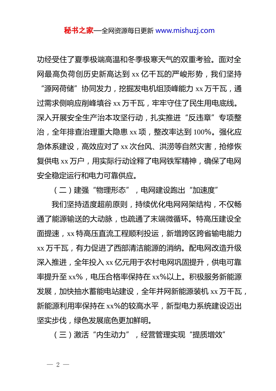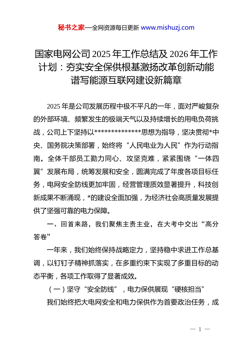 秘书之家—全网资源每日更新 www.mishuzj.com国家电网公司 2025 年工作总结及 2026 年工作计划:夯实安全保供根基激扬改革创新动能谱写能源互联网建设新篇章2025 年是公司发展历程中极不平凡的一年,面对严峻复杂的外部环境、频繁发生的极端天气以及持续增长的用电负荷挑战,公司上下坚持以**************思想为指导,坚决贯彻*中央、国务院决策部署,始终将“人民电业为人民”作为行动指南。全体干部员工勠力同心、攻坚克难,紧紧围绕“一体四翼”发展布局,统筹发展和安全,圆满完成了年度各项目标任务,电网安全防线更加牢固,经营管理质效显著提升,科技创新成果不断涌现,*的建设全面加强,为经济社会高质量发展提供了坚强可靠的电力保障。一、回首来路,我们聚焦主责主业,在大考中交出“高分答卷”一年来,我们始终保持战略定力,坚持稳中求进工作总基调,以钉钉子精神抓落实,在多重约束下实现了多重目标的动态平衡,各项工作取得了显著成效。(一)坚守“安全防线”,电力保供展现“硬核担当”我们始终把大电网安全和电力保供作为首要政治任务,成— 1 —秘书之家—全网资源每日更新 www.mishuzj.com功经受住了夏季极端高温和冬季极寒天气的双重考验。面对全网最高负荷创历史新高达到 xx 亿千瓦的严峻形势,我们坚持“源网荷储”协同发力,挖掘发电机组顶峰能力 xx 万千瓦,通过需求侧响应削峰填谷 xx 万千瓦,牢牢守住了民生用电底线。深入开展安全生产治本攻坚行动,扎实推进“反违章”专项整治,全年排查治理重大隐患 xx 项,整改率达到 100%。强化应急体系建设,高效应对了 xx 次台风、洪涝等自然灾害,抢修恢复供电 xx 万户,用实际行动诠释了电网铁军精神,确保了电网安全稳定运行和电力可靠供应。(二)建强“物理形态”,电网建设跑出“加速度”我们坚持适度超前原则,持续优化电网网架结构,不仅畅通了能源输送的大动脉,也疏通了末端微循环。特高压建设全面提速,xx 特高压直流工程顺利投运,新增跨区跨省输电能力xx 万千瓦,有力促进了西部清洁能源的消纳。配电网改造升级深入推进,全年投入 xx 亿元用于农村电网巩固提升,供电可靠率提升至 xx%,电压合格率保持在 xx%以上。积极服务新能源发展,加快抽水蓄能电站建设,全年并网新能源装机 xx 万千瓦,新能源利用率保持在 xx%的较高水平,新型电力系统建设迈出坚实步伐,绿色发展底色更加鲜明。(三)激活“内生动力”,经营管理实现“提质增效”— 2 —秘书之家—全网资源每日更新 www.mishuzj.com我们深化提质增效专项行动,坚持向管理要效益,经营业绩稳步提升。财务管理更加精益,全面推行全面预算管理,压降可控费用 xx 亿元,资产负债率控制在 xx%以内,实现了国有资产保值增值。内部审计监督效能充分发挥,完成审计项目 xx个,提出管理建议 xx 条,有效防范了经营风险。物资供应链管理持续优化,采购成本降低 xx 亿元。大力实施人才强企战略,深化三项制度改革,全员劳动生产率同比增长 xx%。工会组织作用有效发挥,深入开展劳动竞赛和技能比武,建成 xx 个劳模创新工作室,有效激发了广大员工的创新创造活力。(四)筑牢“红色堡垒”,*的建设发挥“领航作用”我们坚持把*的政治建设摆在首位,扎实开展 zt 教育,严格落实“第一议题”制度,确保了公司发展的正确政治方向。深入实施“dj+”工程,在电网建设、抢修保供等一线设立*员责任区 xx 个、*员示范岗 xx 个,实现了 dj 工作与中心工作深度融合。纵深推进全面从严治*,持之以恒正风肃纪,扎实开展巡视巡察整改,营造了风清气正的政治生态。加强企业文化建设,讲好国网故事,公司品牌价值持续提升,在服务国家重大战略中彰显了央企的责任与担当。二、审视当下,我们坚持问题导向,在检视中查摆“短板弱项”— 3 —秘书之家—全网资源每日更新 www.mishuzj.com在肯定成绩的同时,我们必须清醒地认识到,公司发展仍面临不少困难和挑战,工作中还存在一些不容忽视的问题。(一)安全生产基础仍需进一步“夯实固稳”随着新型电力系统建设的推进,电网运行特性发生深刻变化,“双高”特性日益...